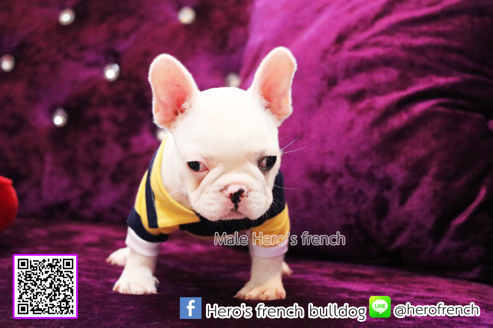 เฟรนช์บลูด็อก เพศผู้ สีขาว น่ารัก สุขภาพแข็งแรง การันตีสุขภาพ 30 วัน สอบถาม line: @herofrench