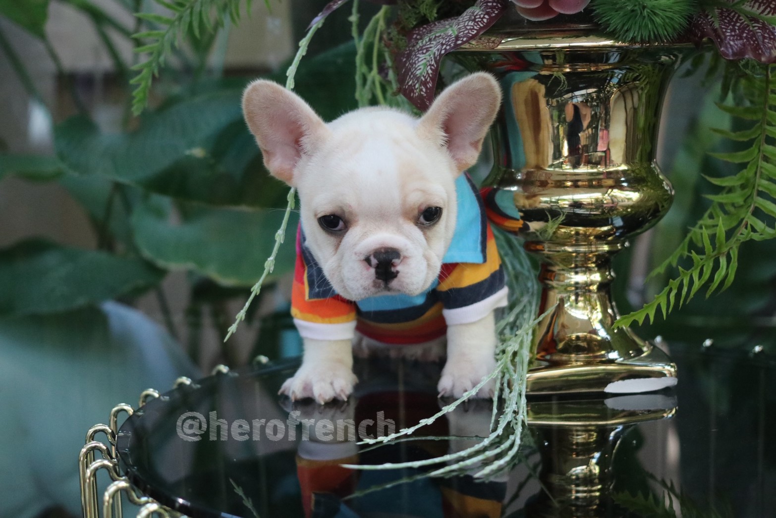 เฟรนช์บลูด็อก เพศผู้ สีครีม หน้าสั้น ใบหูสั้น ขี้เล่น น่ารัก ทรงสวย อายุ 2 ดือน