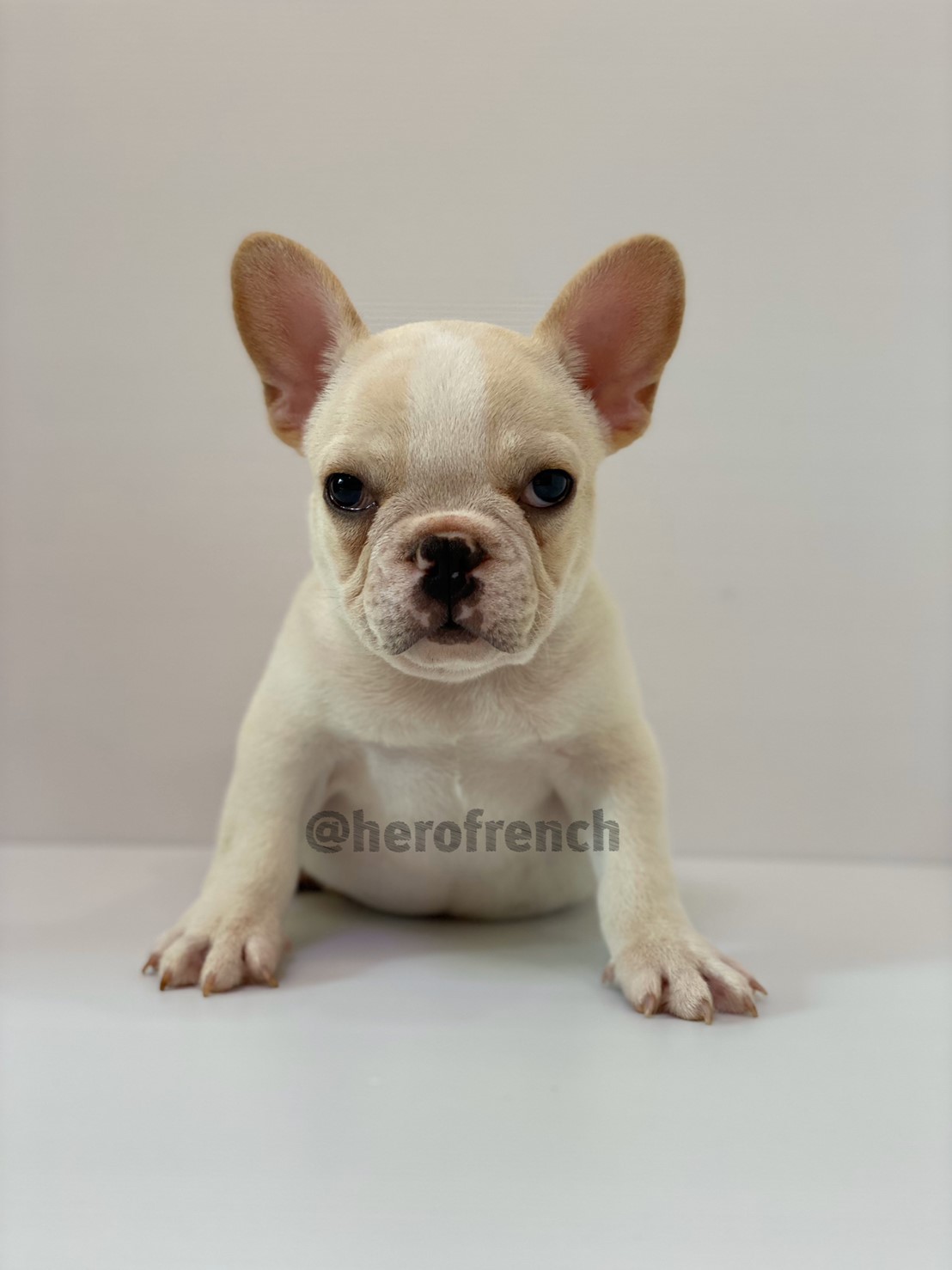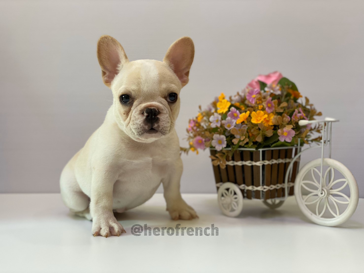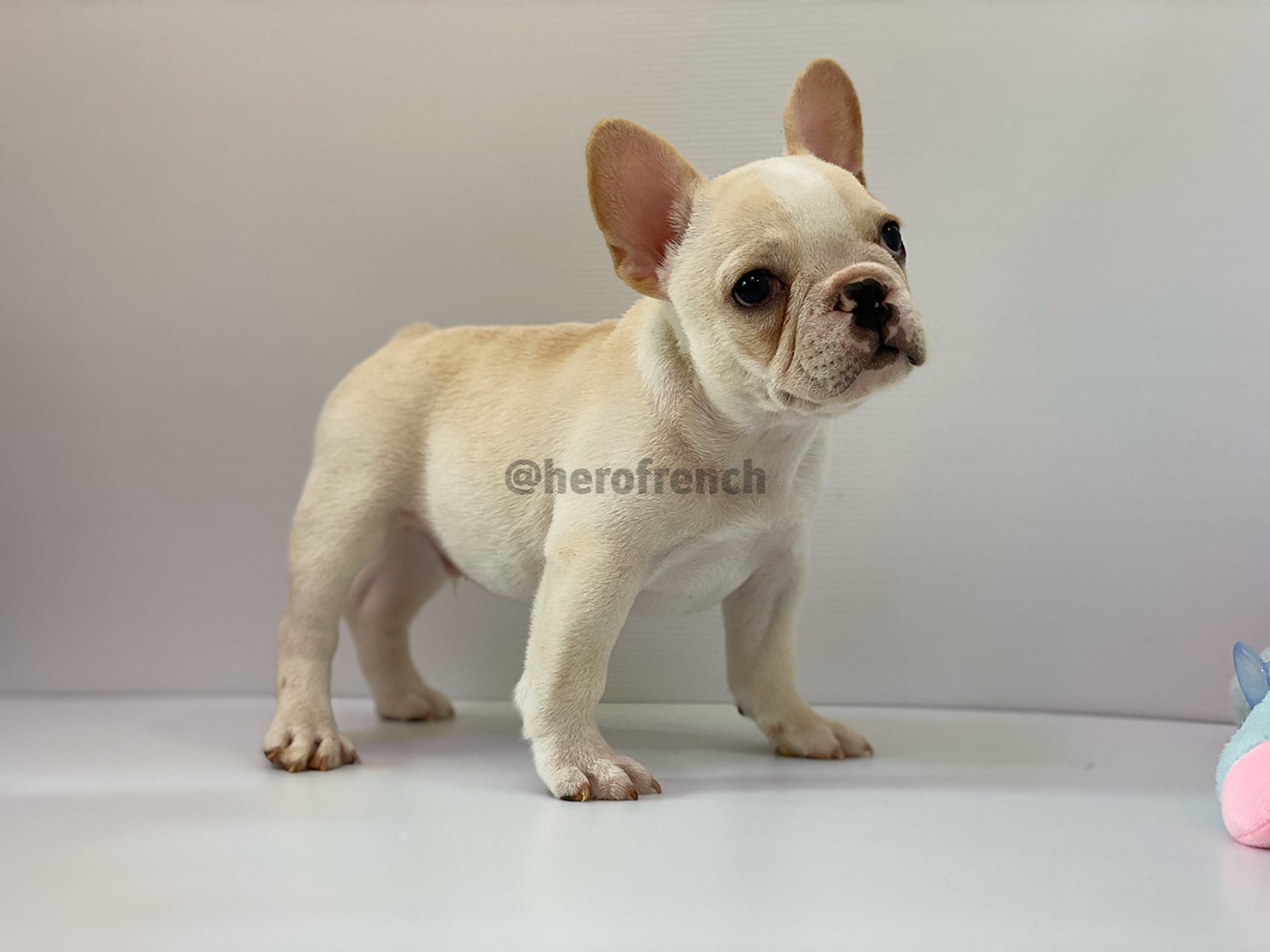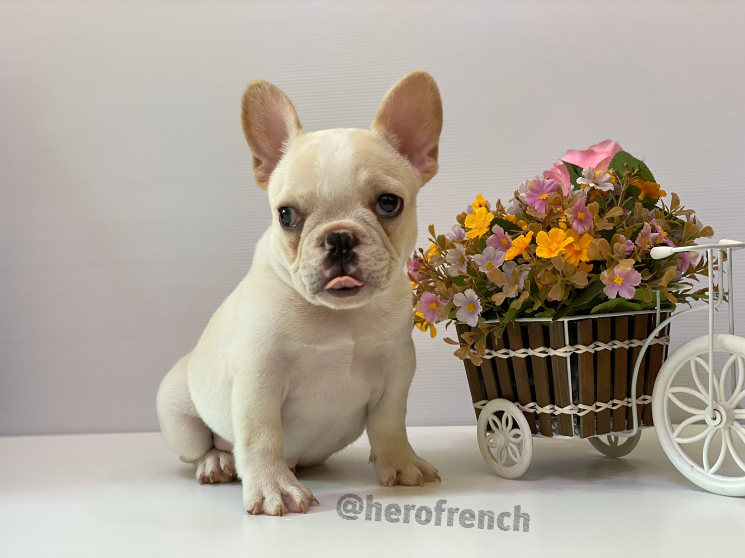 เฟรนช์บลูด็อก เพศผู้ สีครีม หน้าสั้น ใบหูสั้น ขี้เล่น น่ารัก ทรงสวย อายุ 2 ดือน