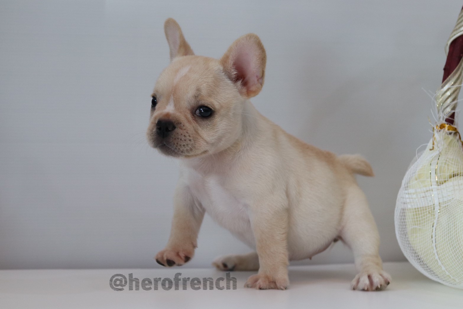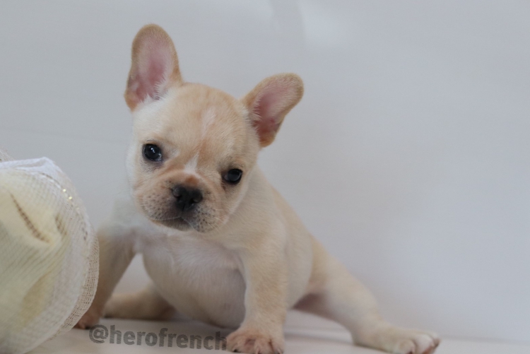 เฟรนช์บลูด็อก เพศผู้ สีครีม หน้าสั้น ใบหูสั้น ขี้เล่น น่ารัก ทรงสวย อายุ 2 ดือน
