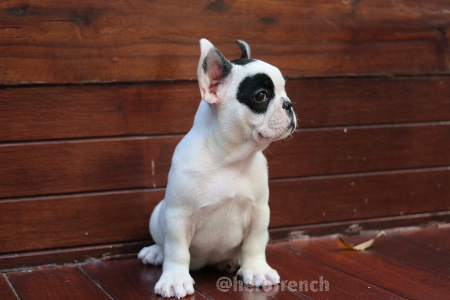 เฟรนช์บลูด็อก เพศเมีย สีขาวดำ หน้าสั้น ใบหูสั้น ขี้เล่น น่ารัก ทรงสวย อายุ 2 ดือน