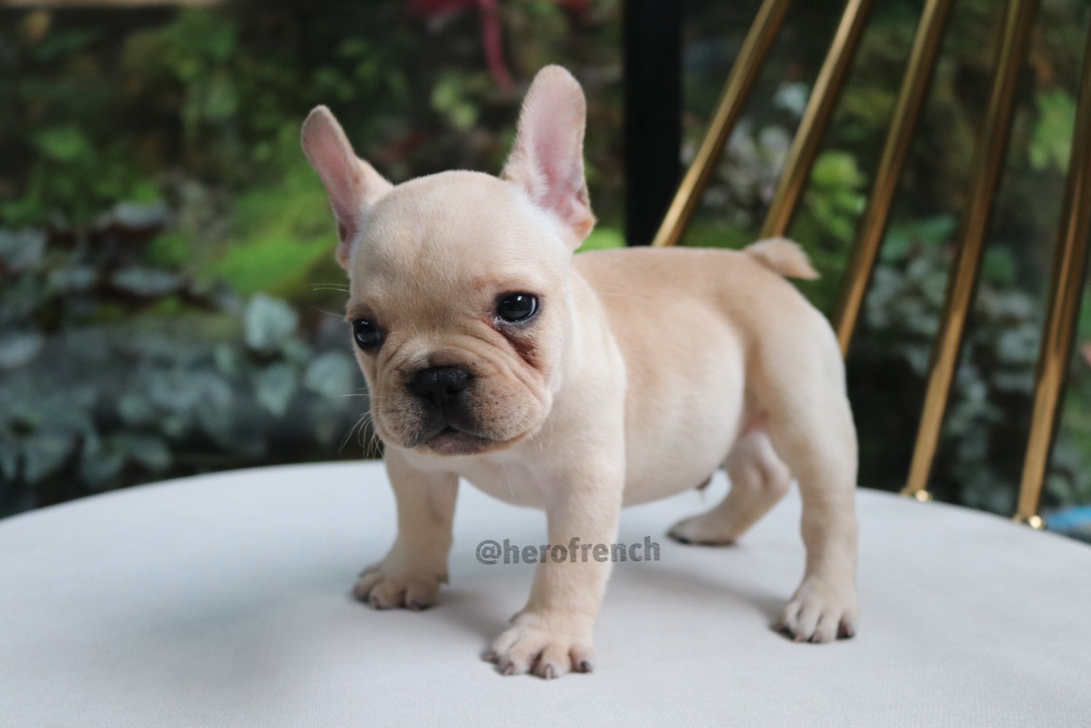 เฟรนช์บลูด็อก เพศผู้ สีครีม หน้าสั้น ใบหูสั้น ขี้เล่น น่ารัก ทรงสวย อายุ 2 ดือน