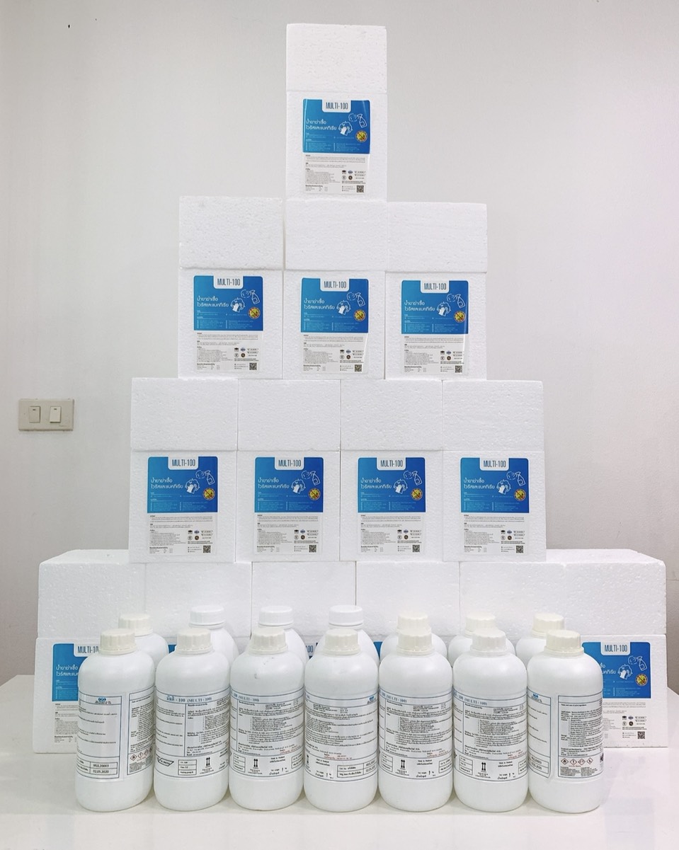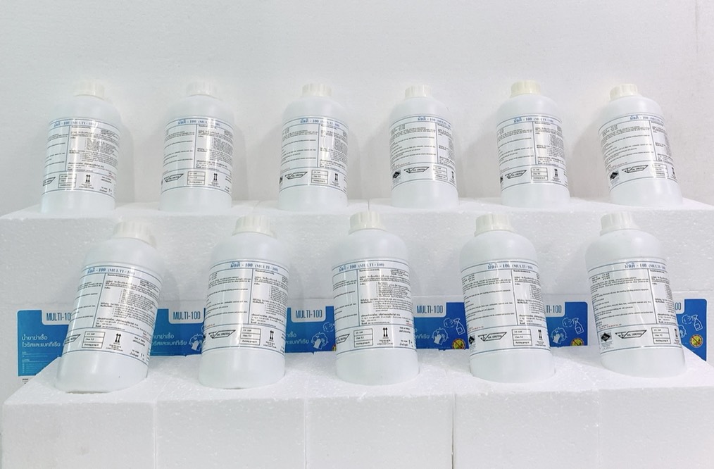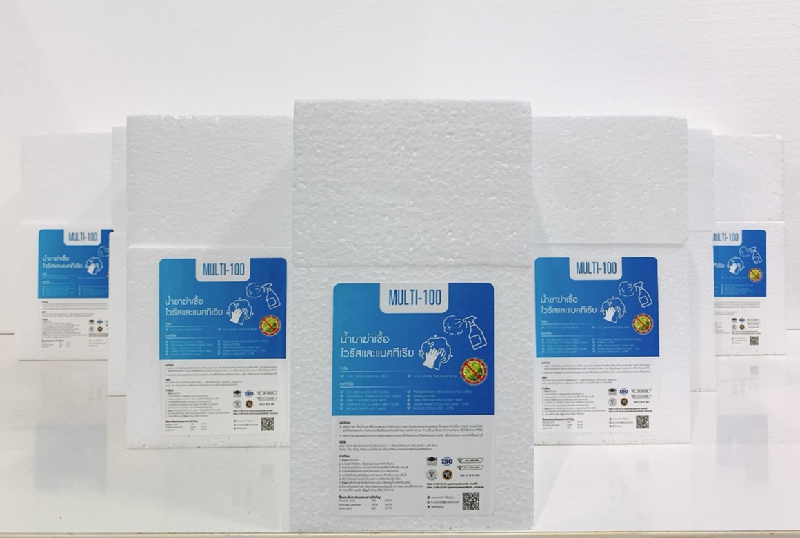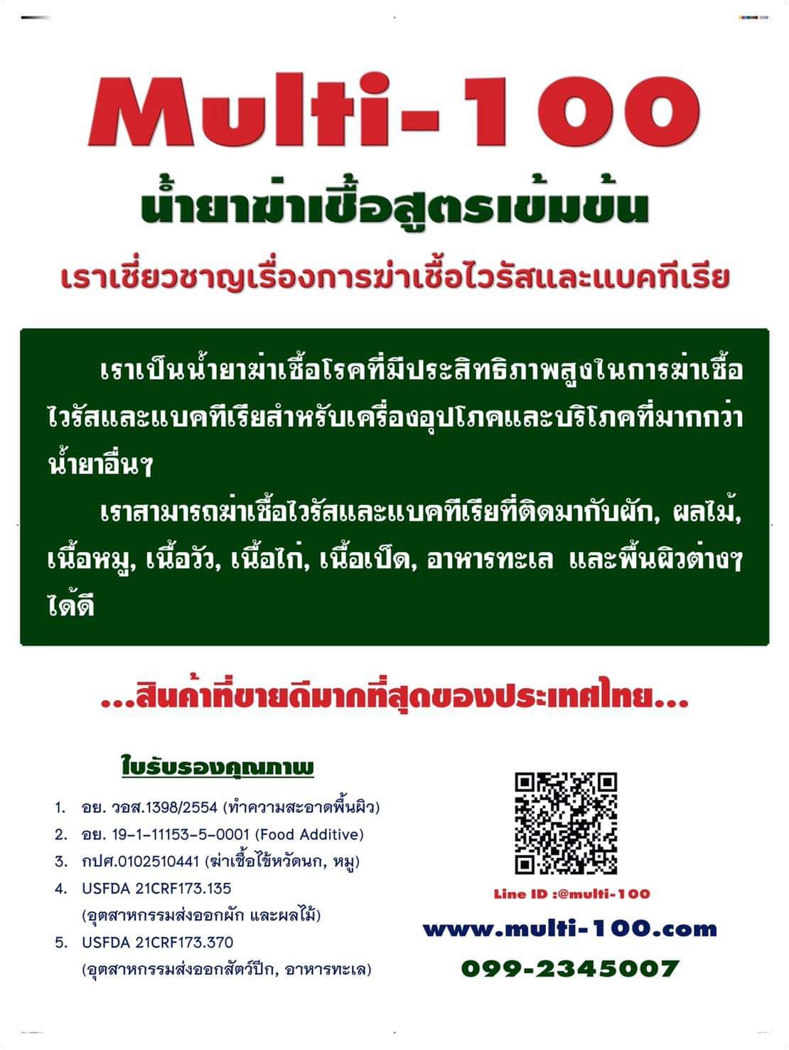 Multi-100 น้ำยาฆ่าเชื้อไวรัส และแบคทีเรีย ความเข้มข้นสูง สามารถใช้ล้างผัก ล้างปลา รวมถึงทำความสะอาดพื้น ฝาหนัง และอุปกรณ์ทำความอาหาร ปลอดภัย ได้รับการรับรองจาก อย. ไทย 2 ใบ อย. สหรัฐ 2 ใบ และ กปศ. 1 ใบ