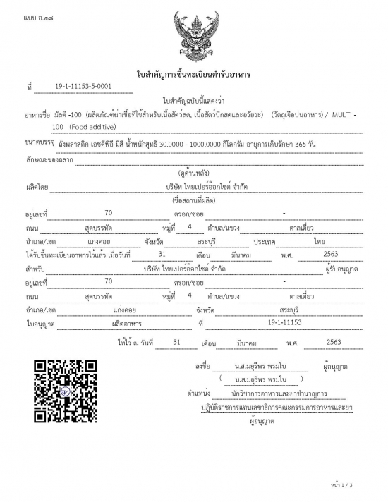 Multi-100 น้ำยาฆ่าเชื้อไวรัส และแบคทีเรียสำหรับอาหาร มี อย.ไทย 2 ใบ อย.สหรัฐ 2 ใบ และ กปศ 1 ใบ