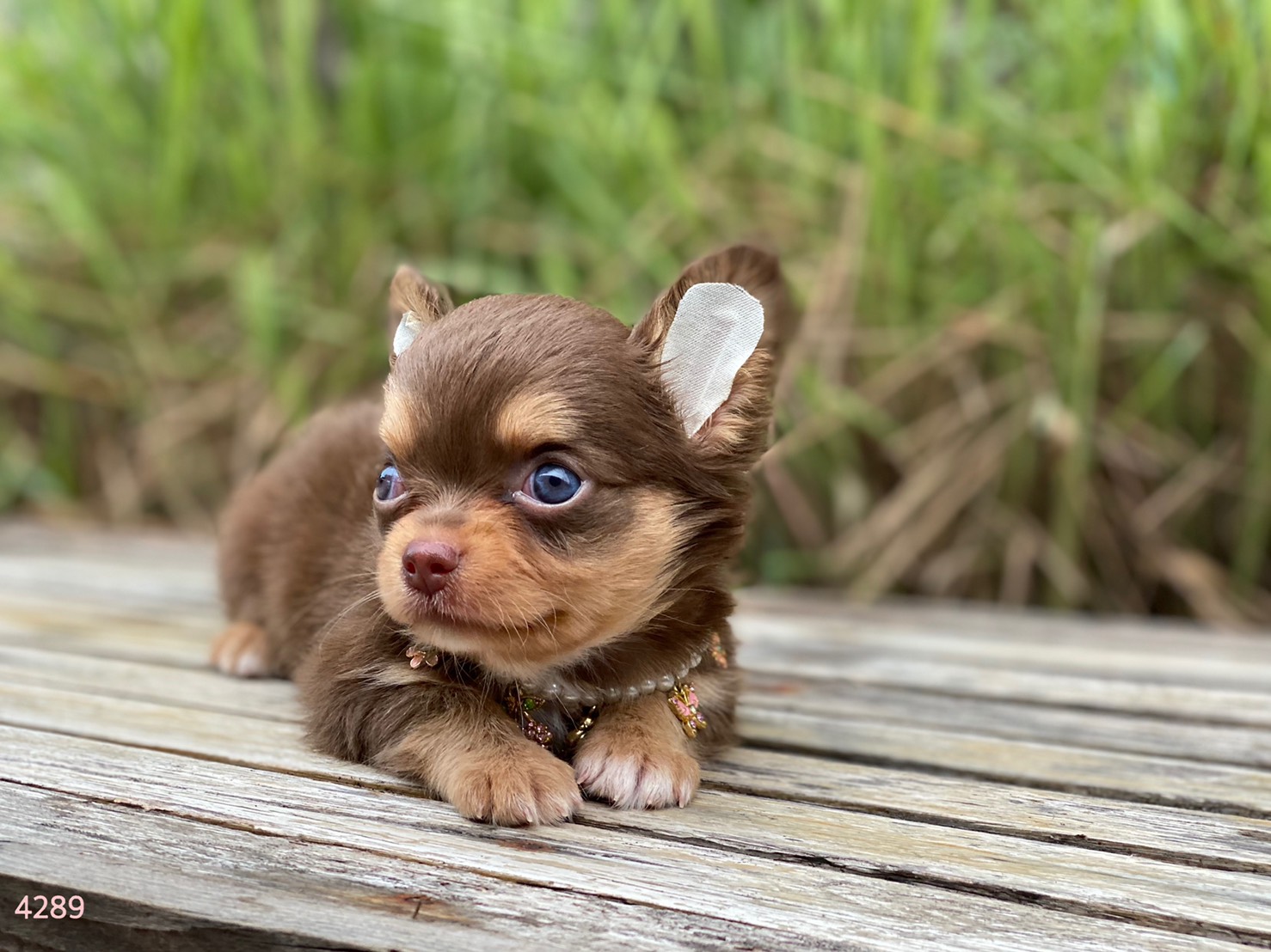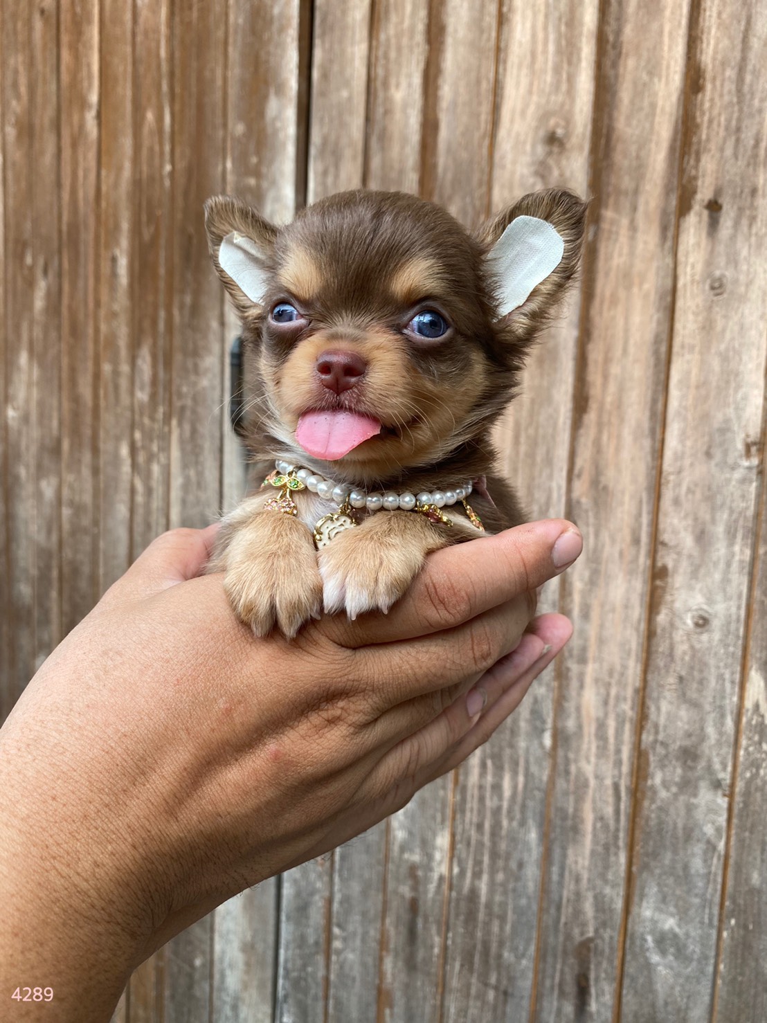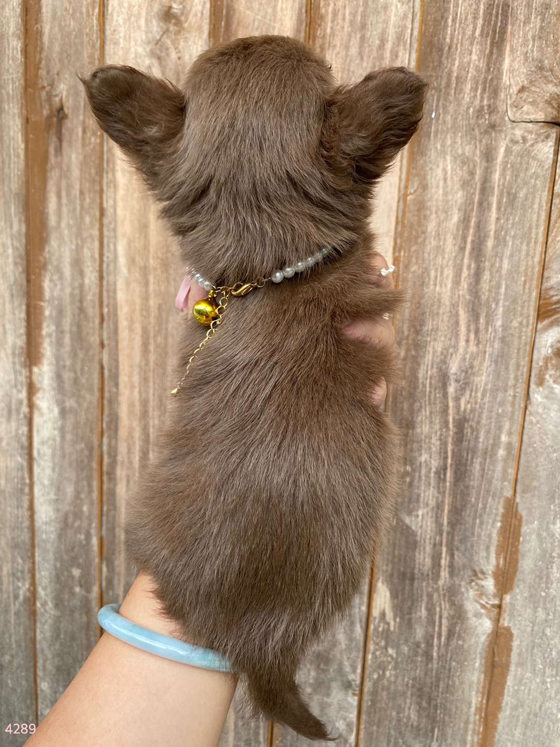 (ขายแล้ว)ชิวาวา เพศเมีย สีช็อกโกแลตแทน ขนยาว มี19นิ้ว หน้าแบ๊วๆโครงสร้างเยี่ยม สุขภาพแข็งแรง