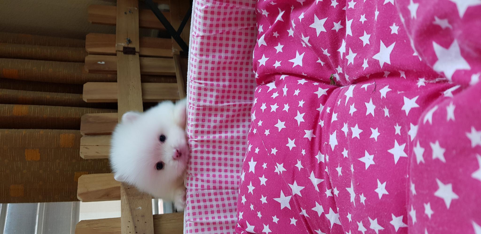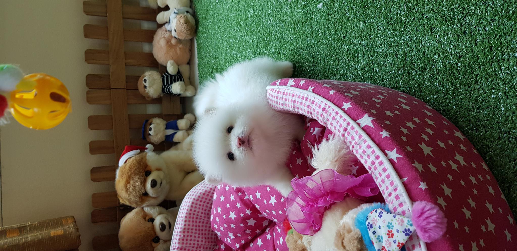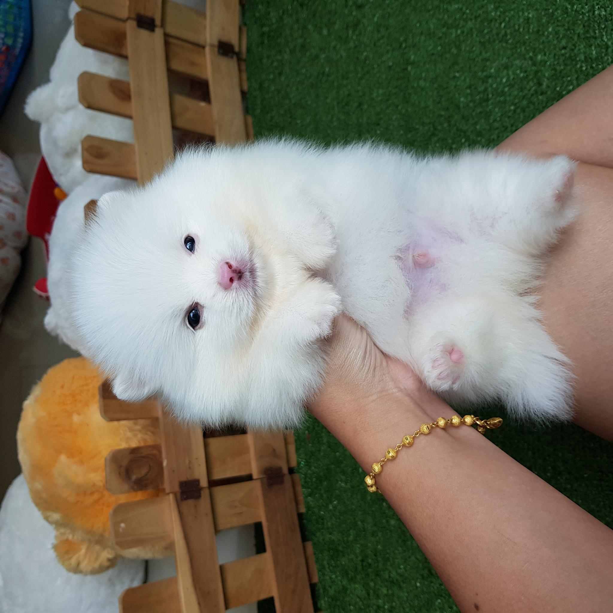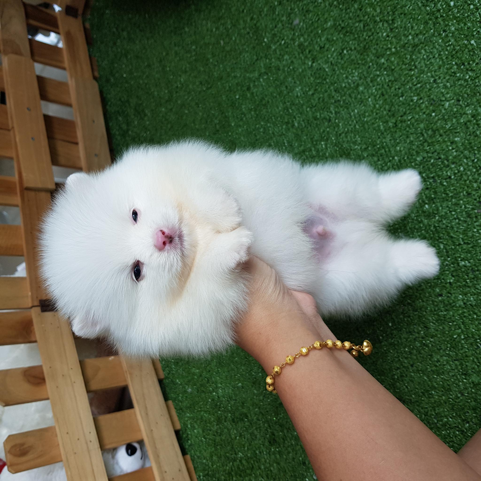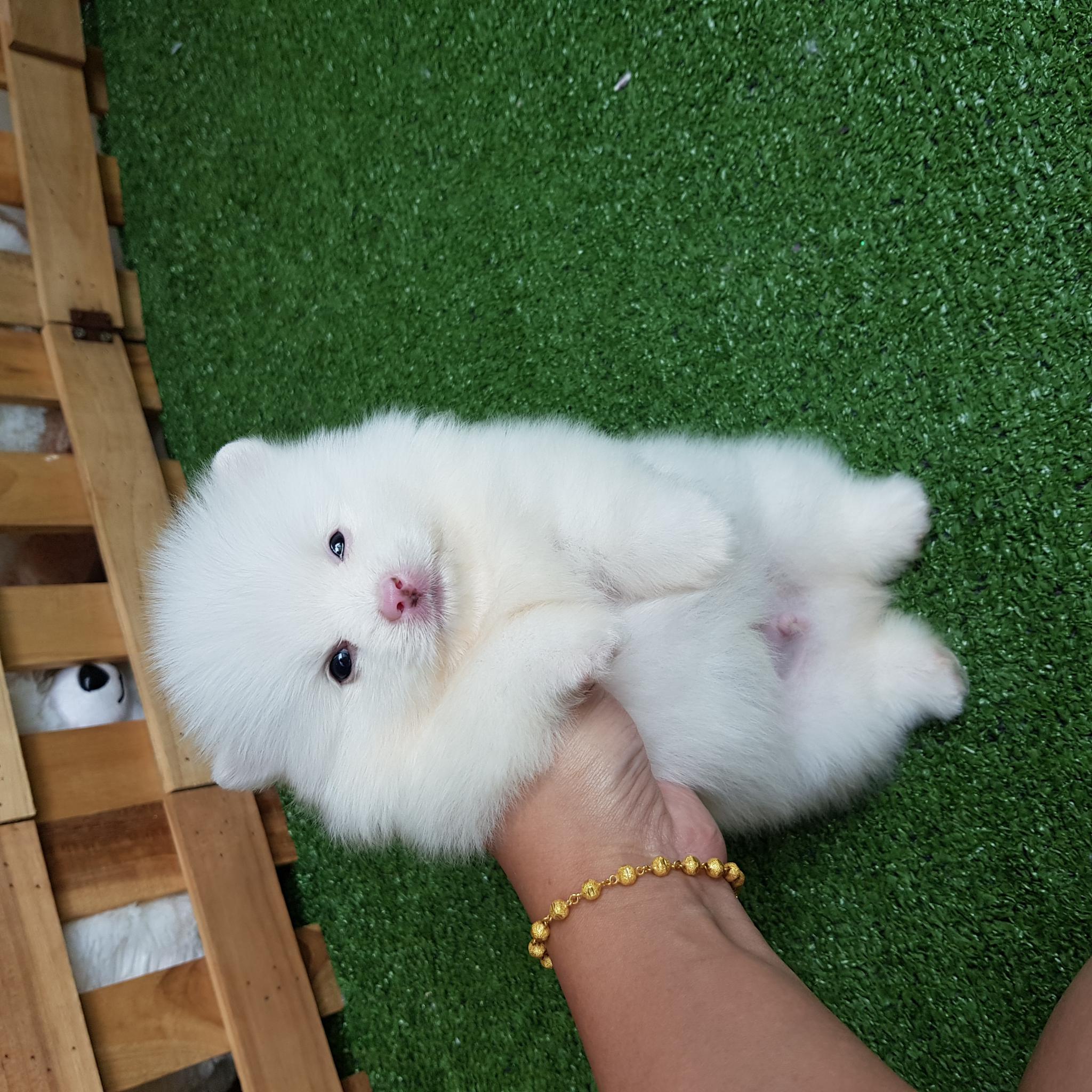 ปอมเมอเรเนี่ยนเพศผู้หน้าหมี ขนแน่น ขาใหญ่สีขาวสำลี เกรดพ่อพันธุ์ เพ็ดเต็มใบ