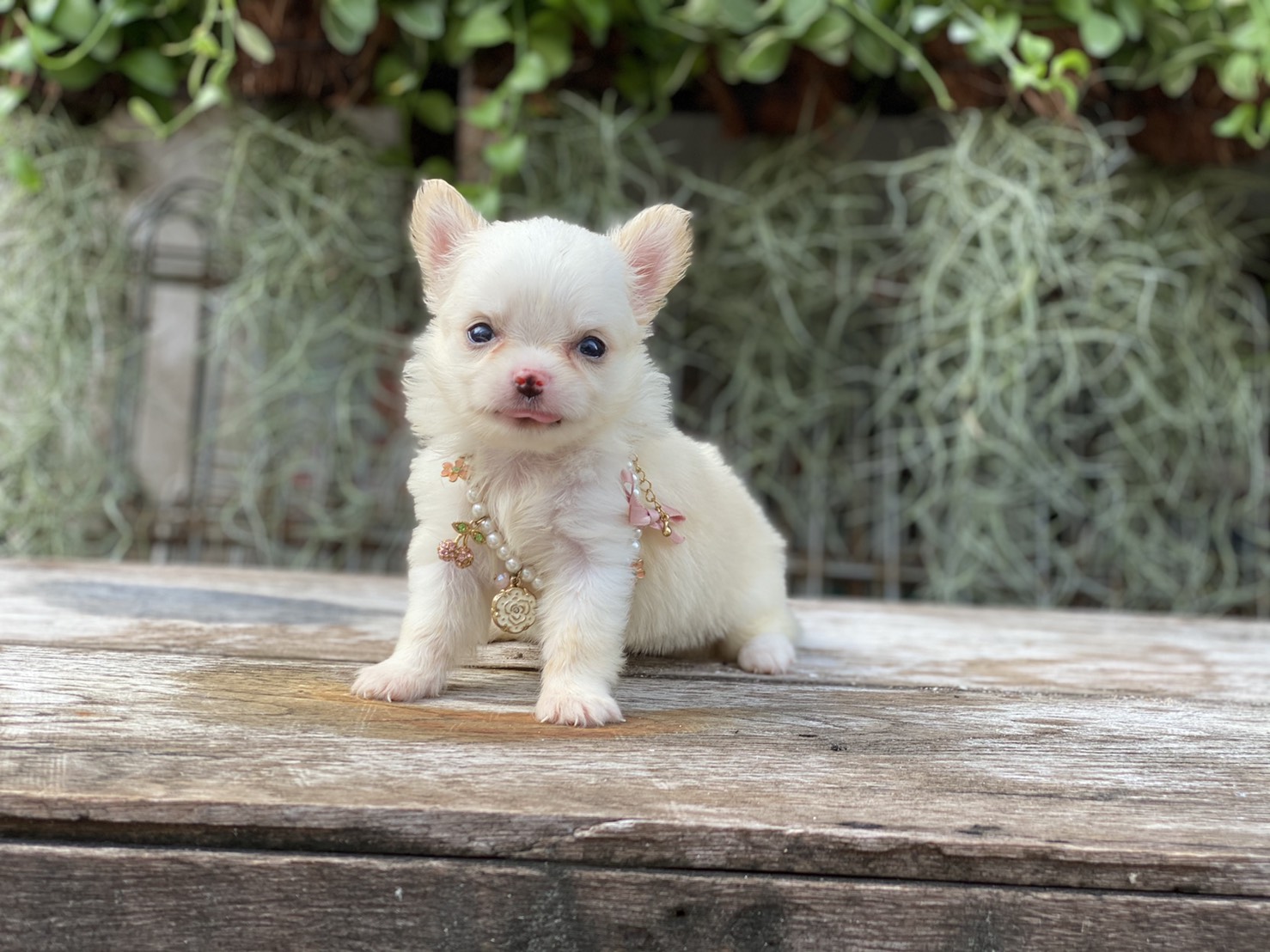 ชิวาวา ขนยาว เพศเมีย สีขาวครีม หน้าแบ๊วๆสายไต้หวัน สุขภาพแข็งแรง อายุ 50 วัน สวยใส น่ารัก