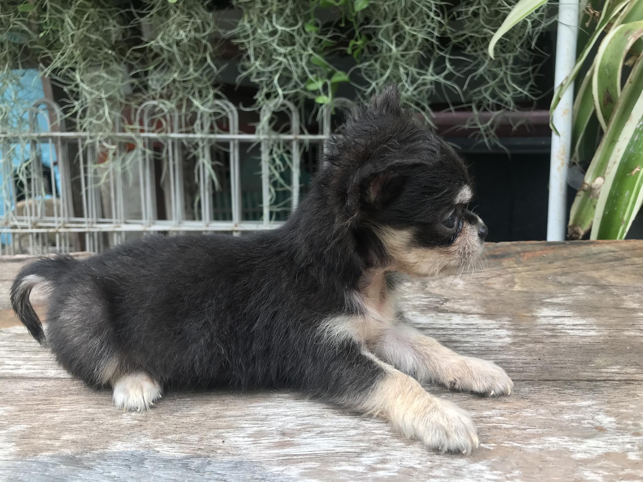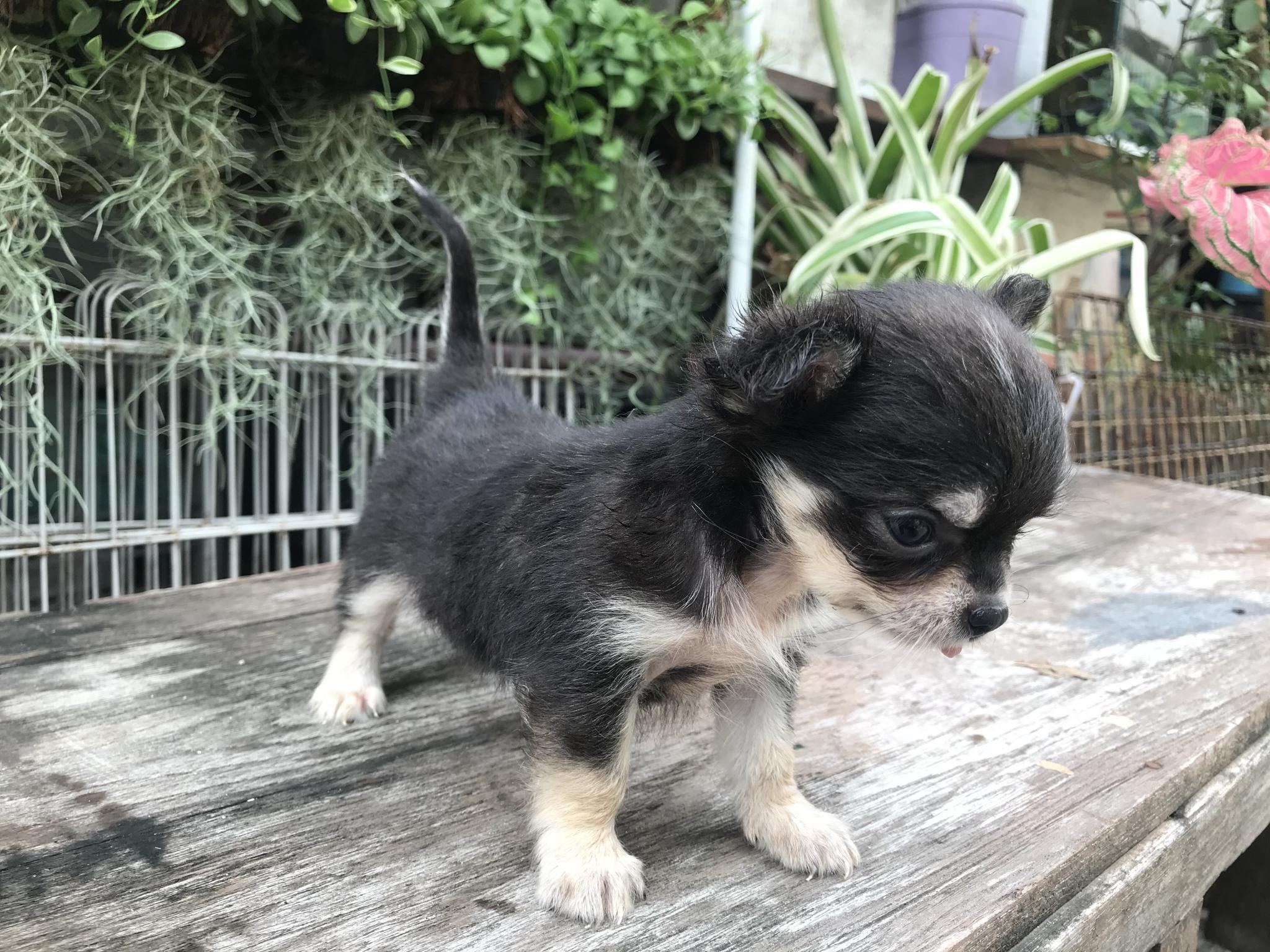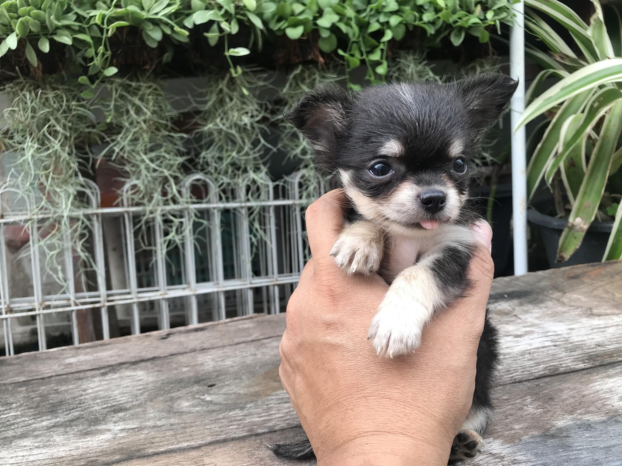 (ขายแล้ว)ชิวาวา ขนยาว ไซร้จิ๋ว เพศเมีย สีขาวแบล็คแทน หน้าแบ๊วๆ สายเลือดดี สุขภาพแข็งแรง