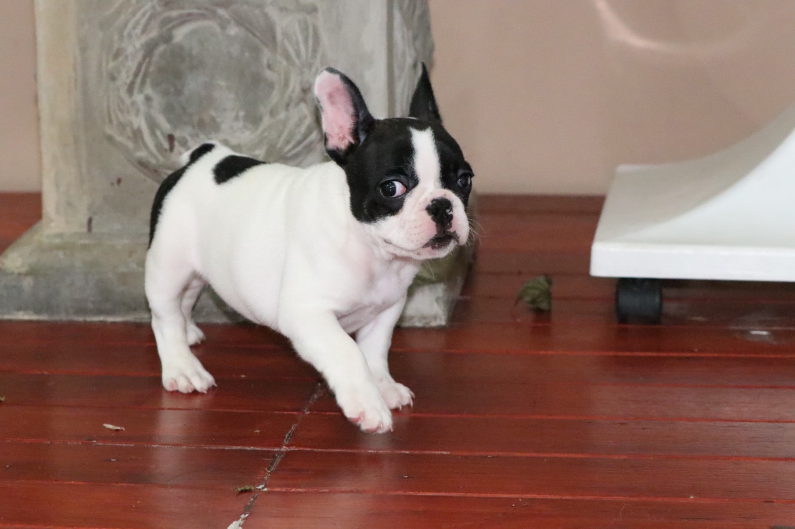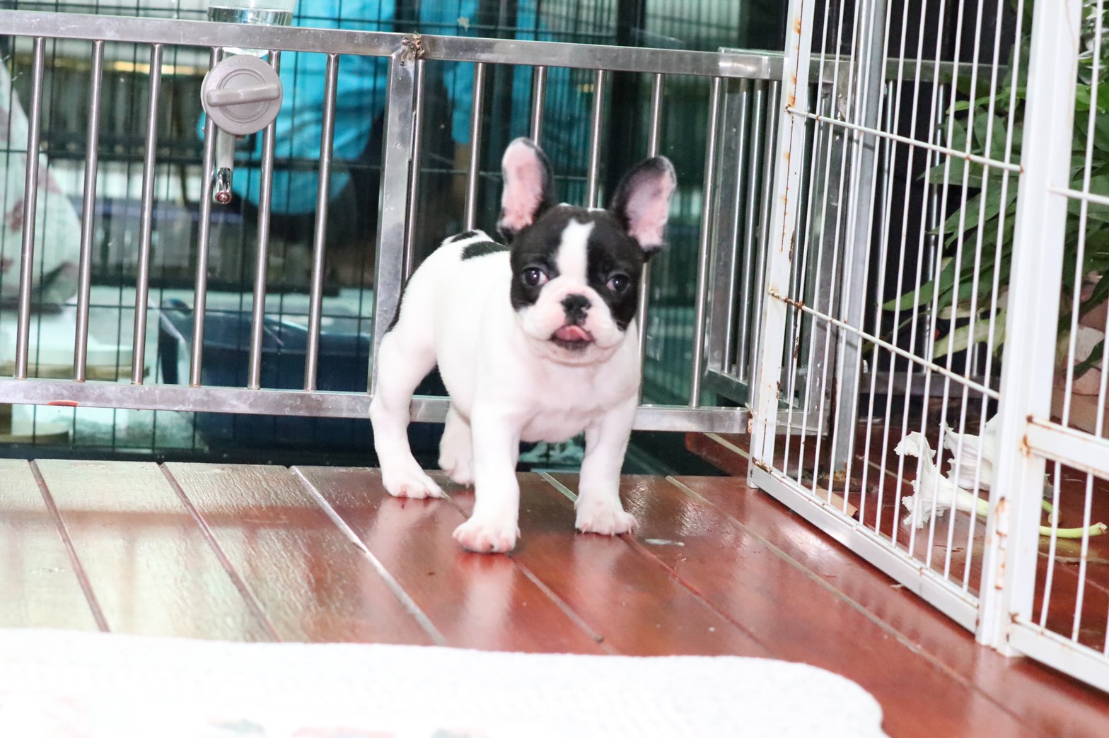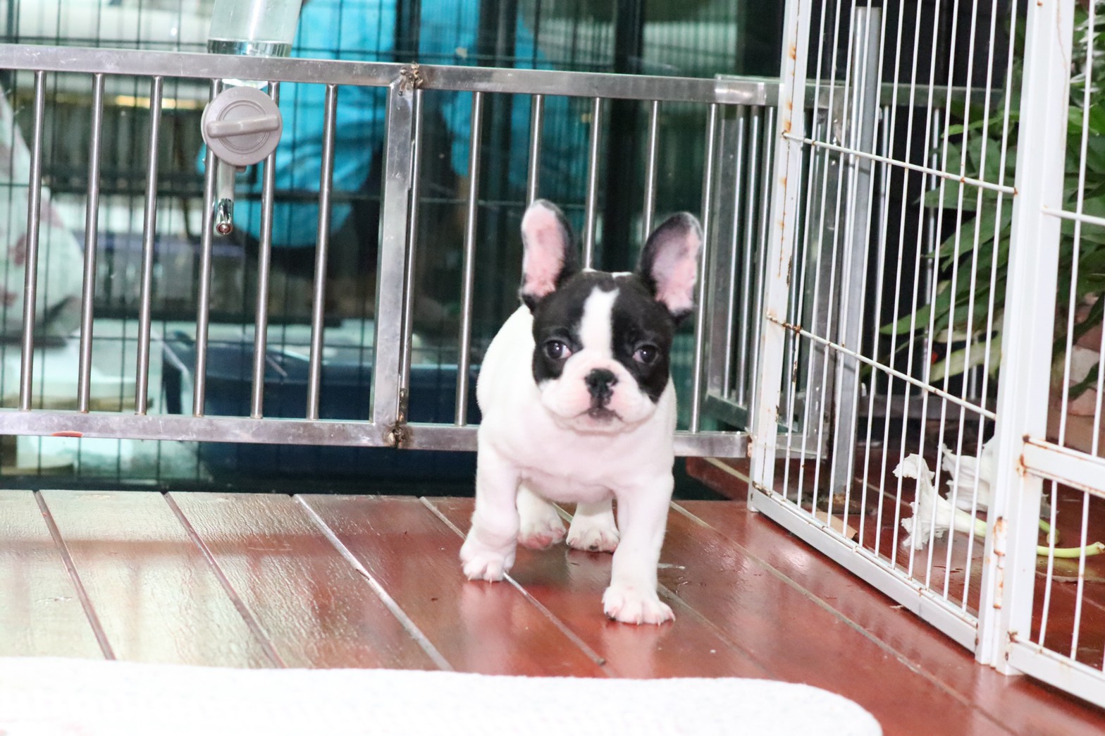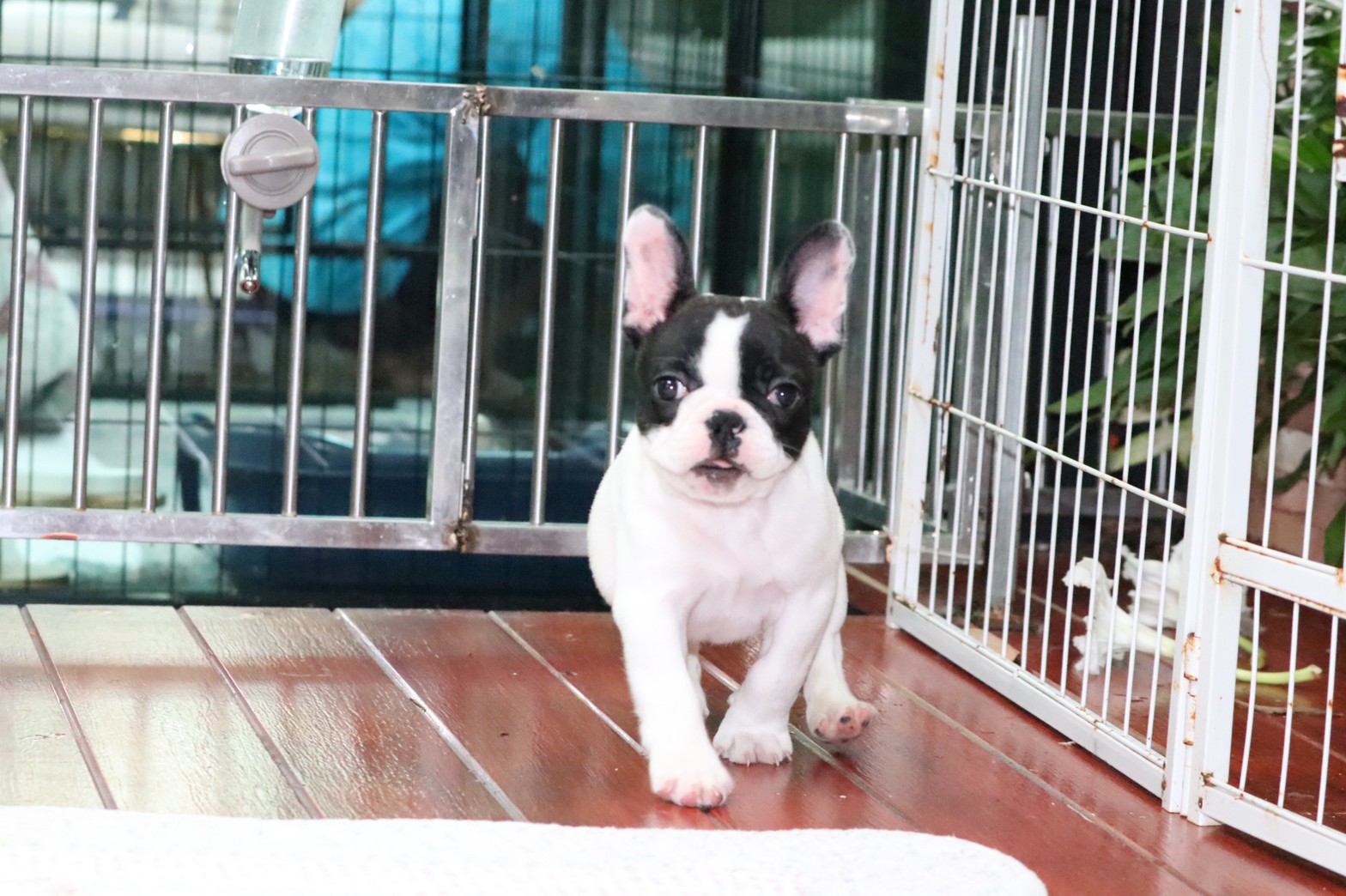 เฟรนช์บลูด็อก เพศผู้ สีขาวดำ อายุ 2 เดือน ขี้อ้อน ใบหูเล็ก สายเลือดดี หน้าสั้น โครงสร้างดี หุ่นล้ำ