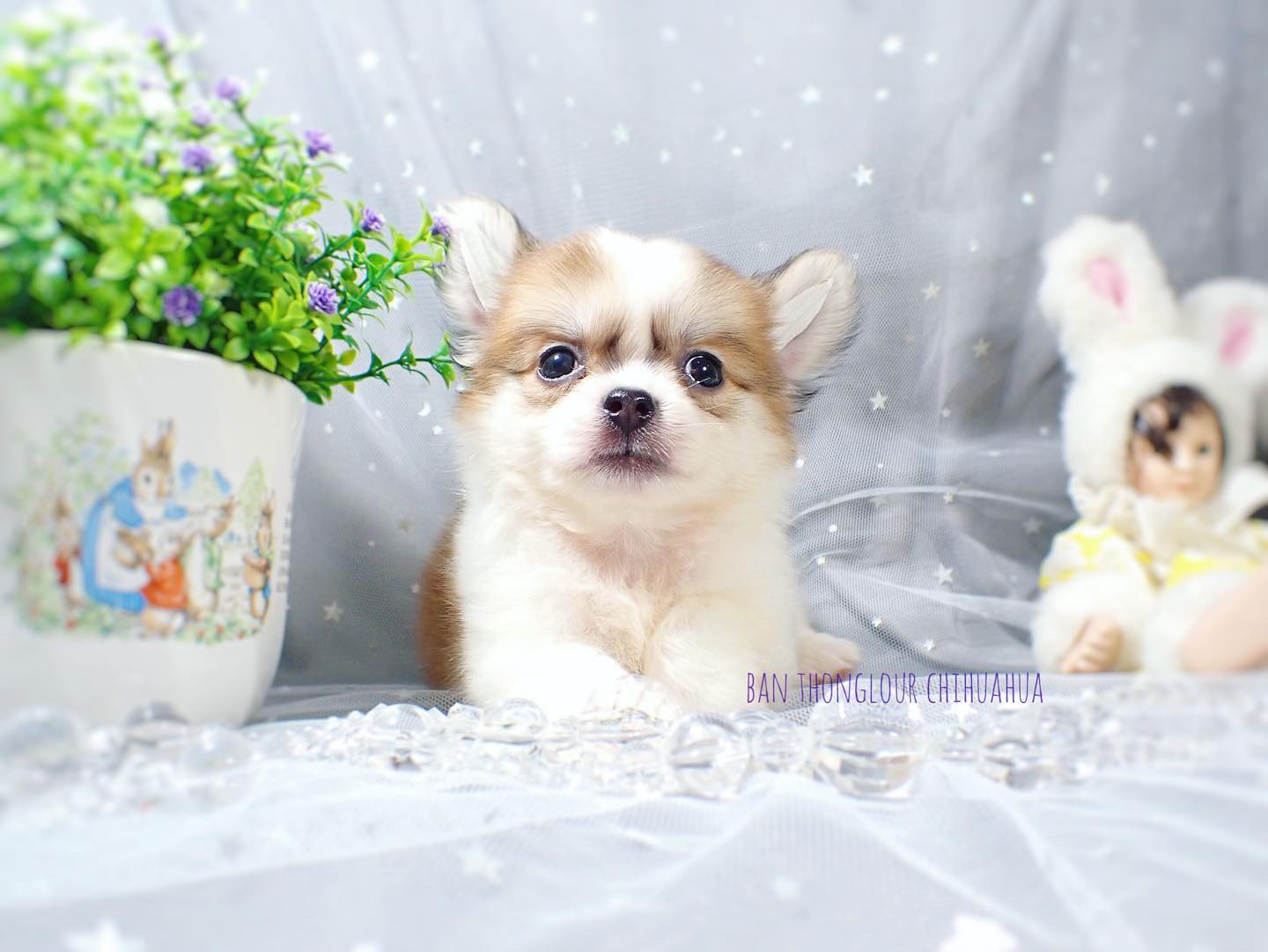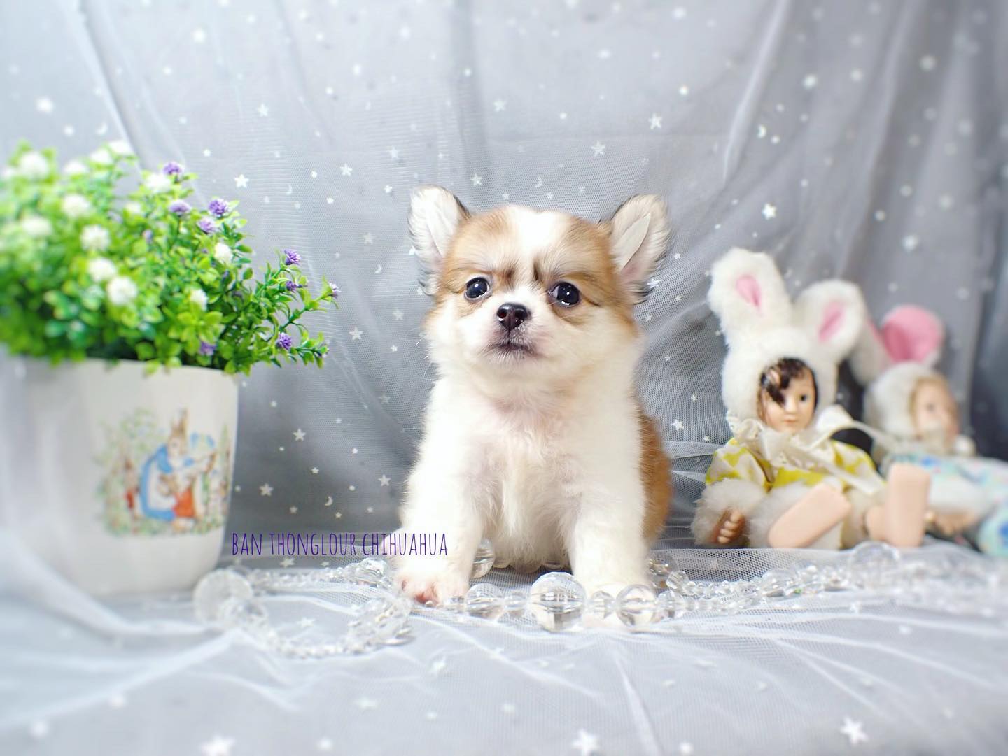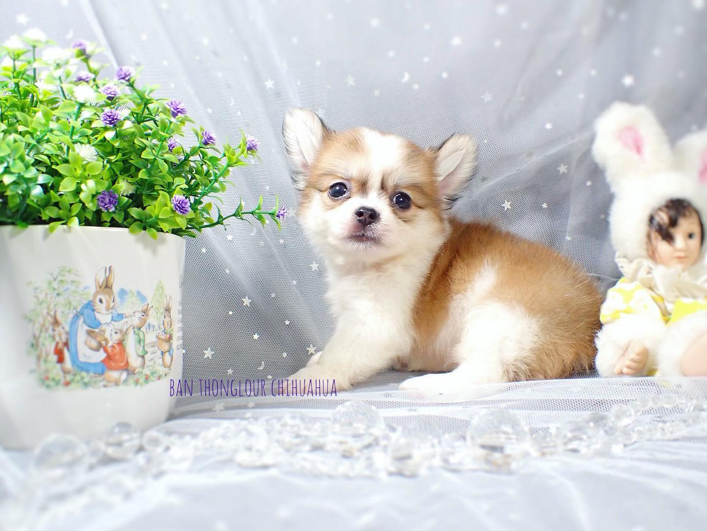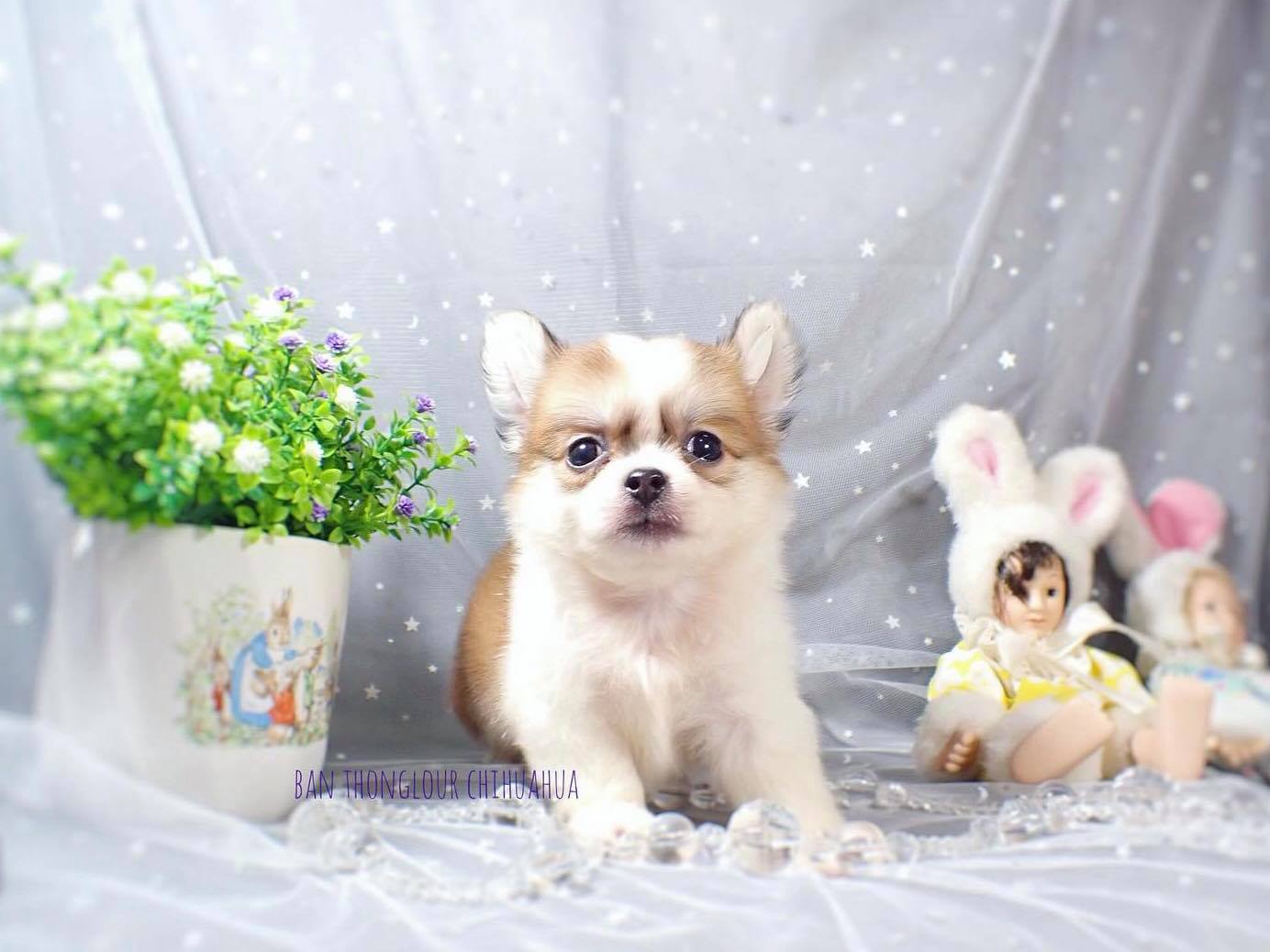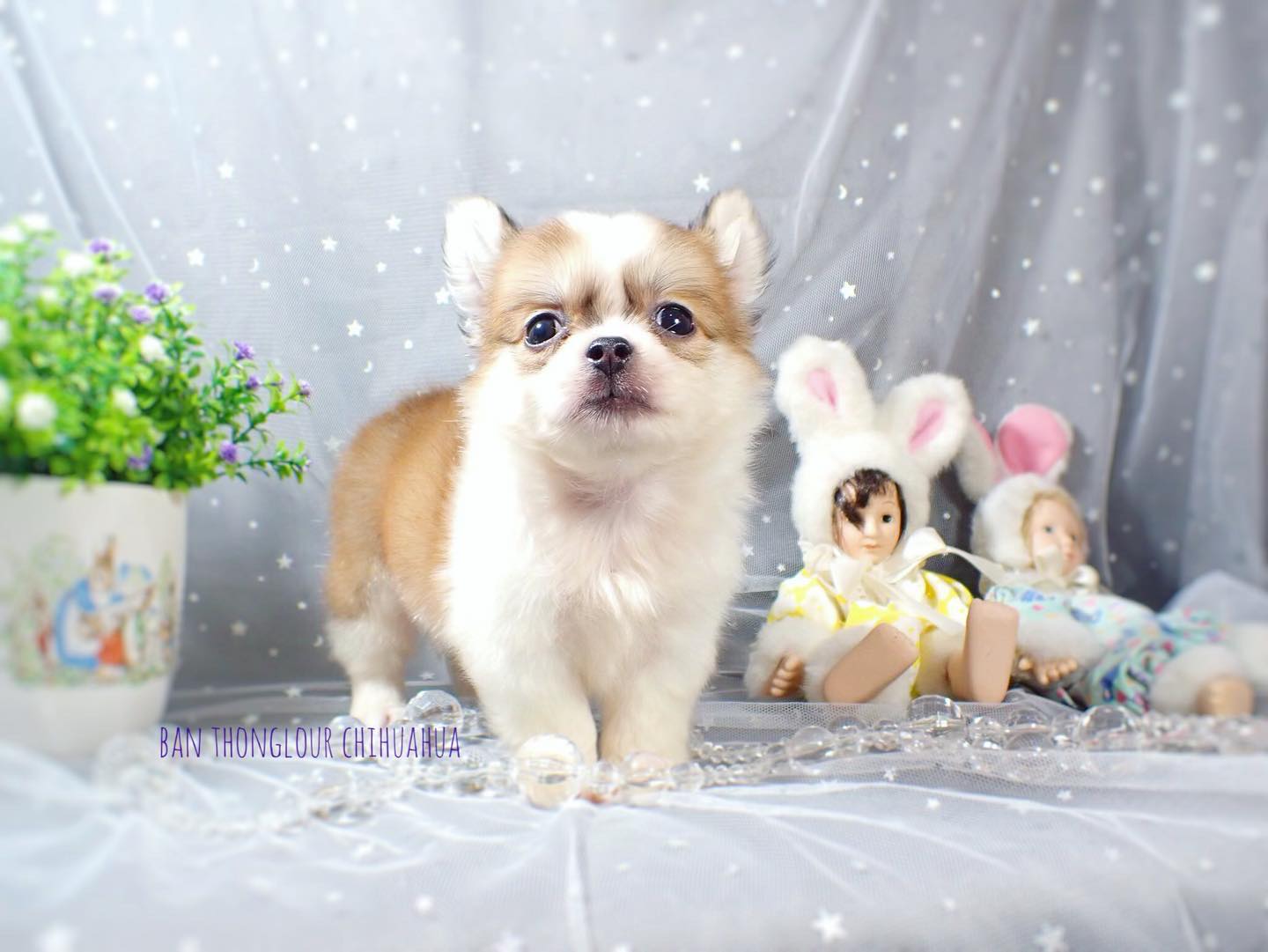 ((บ้านทองเหลาชิวาวา )) เปิดจอง ดช.โดโระ ชิวาวา ขนยาว สีขาวน้ำตาล หัวกลมโต ตาหวาน ขนแน่นฟู