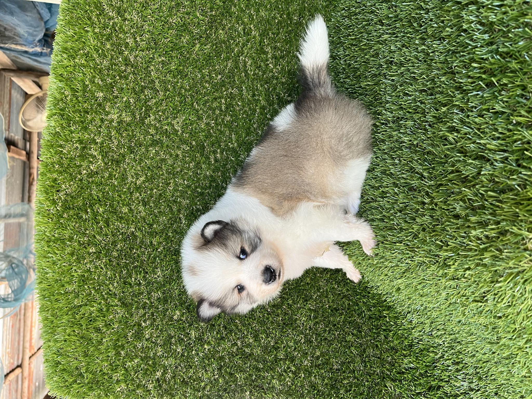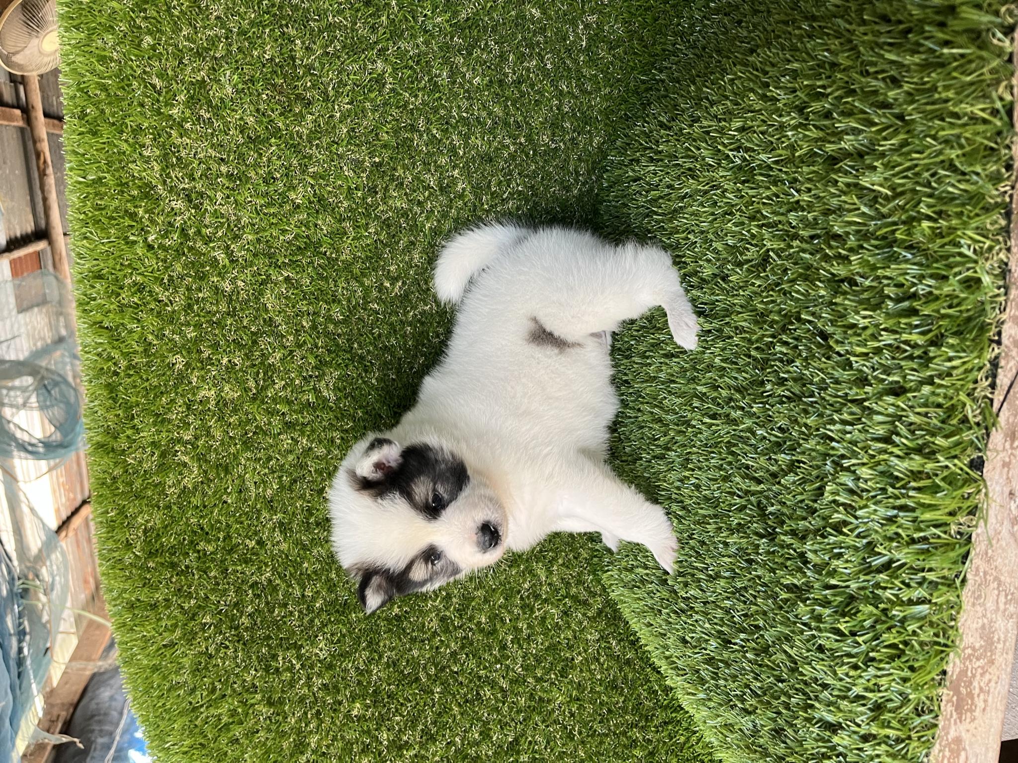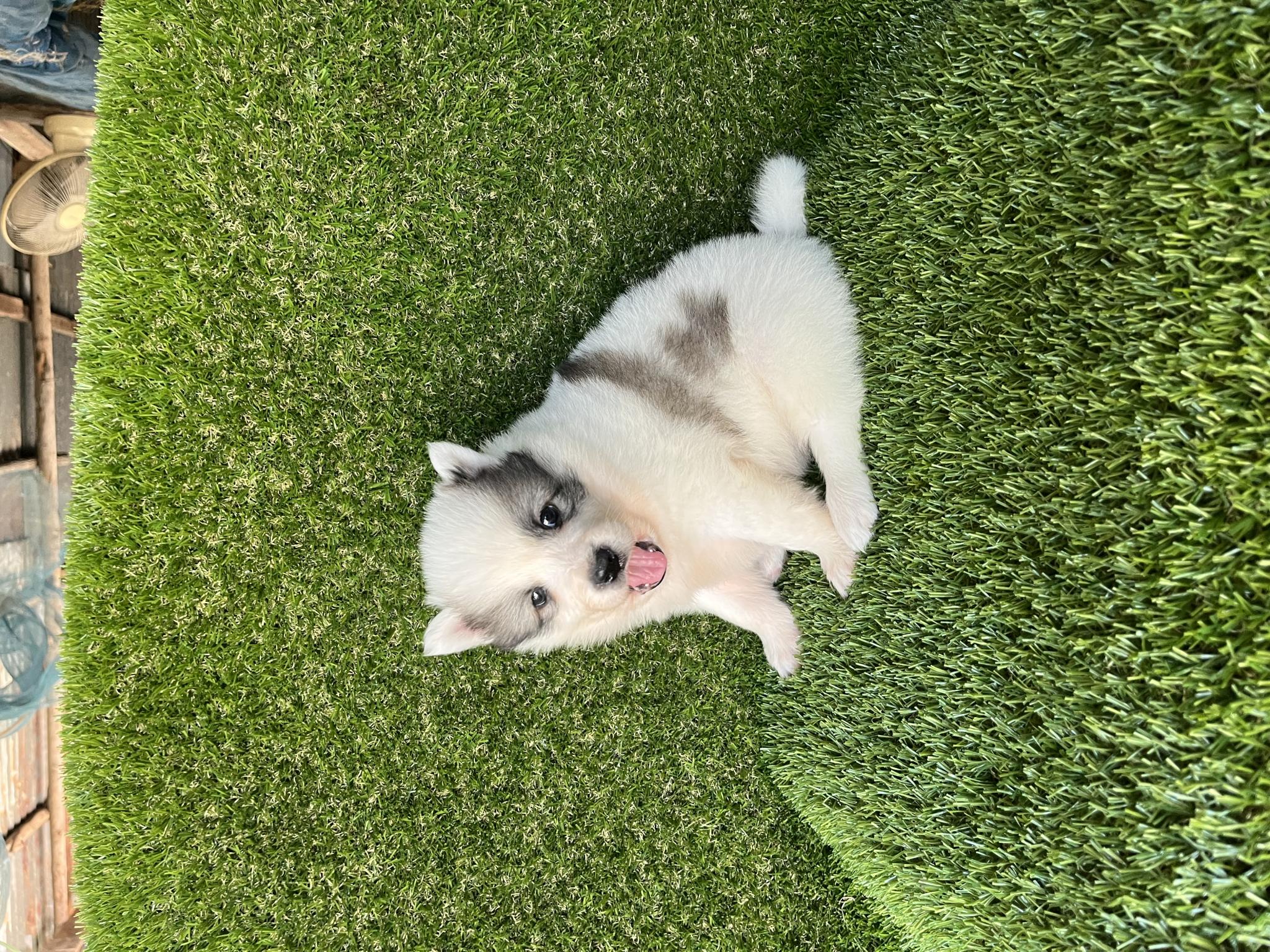 ลูกสุนัขบางแก้วขนฟูหูตั้งหางพวงสีขาวเทาหวานๆ
