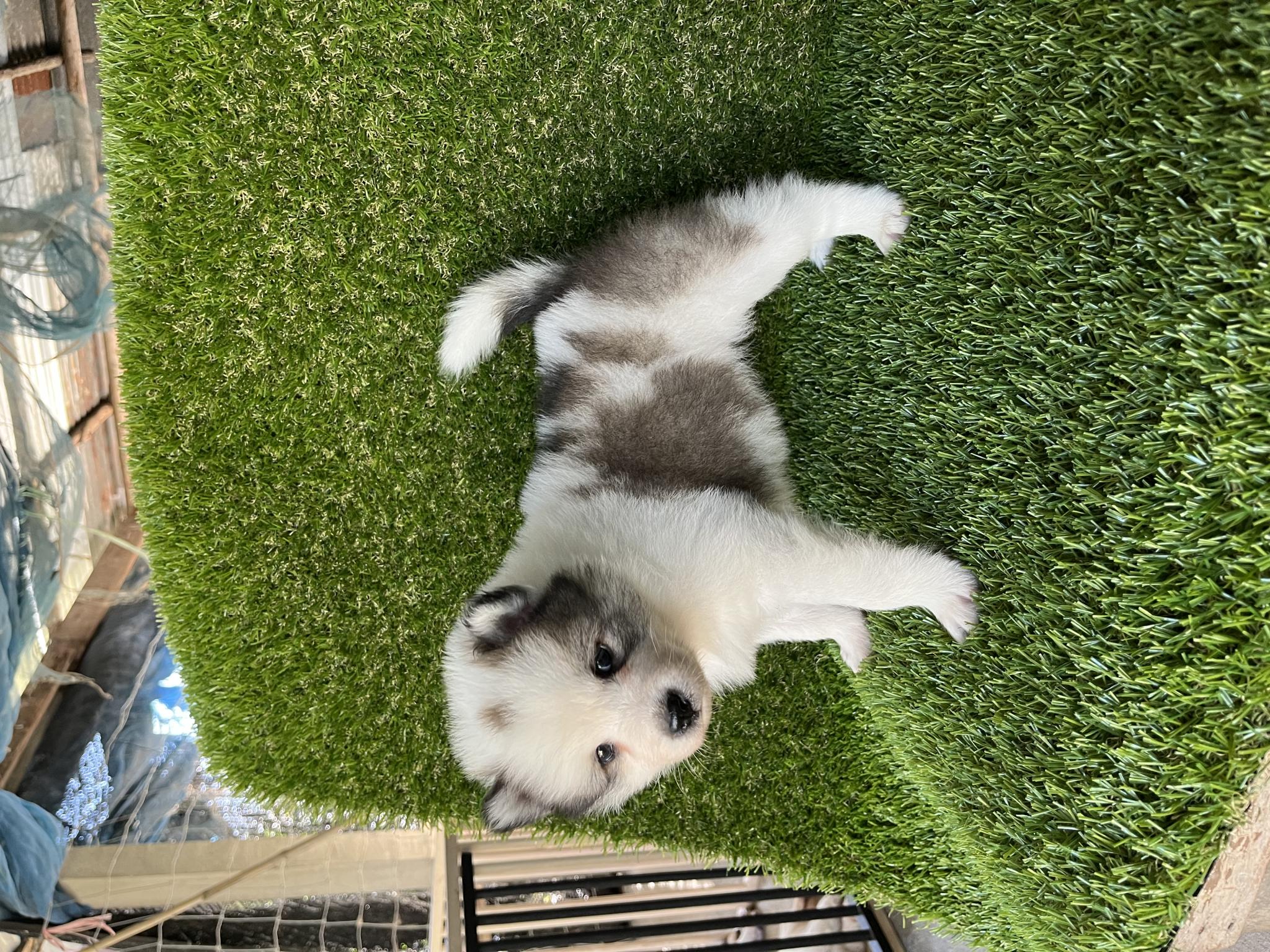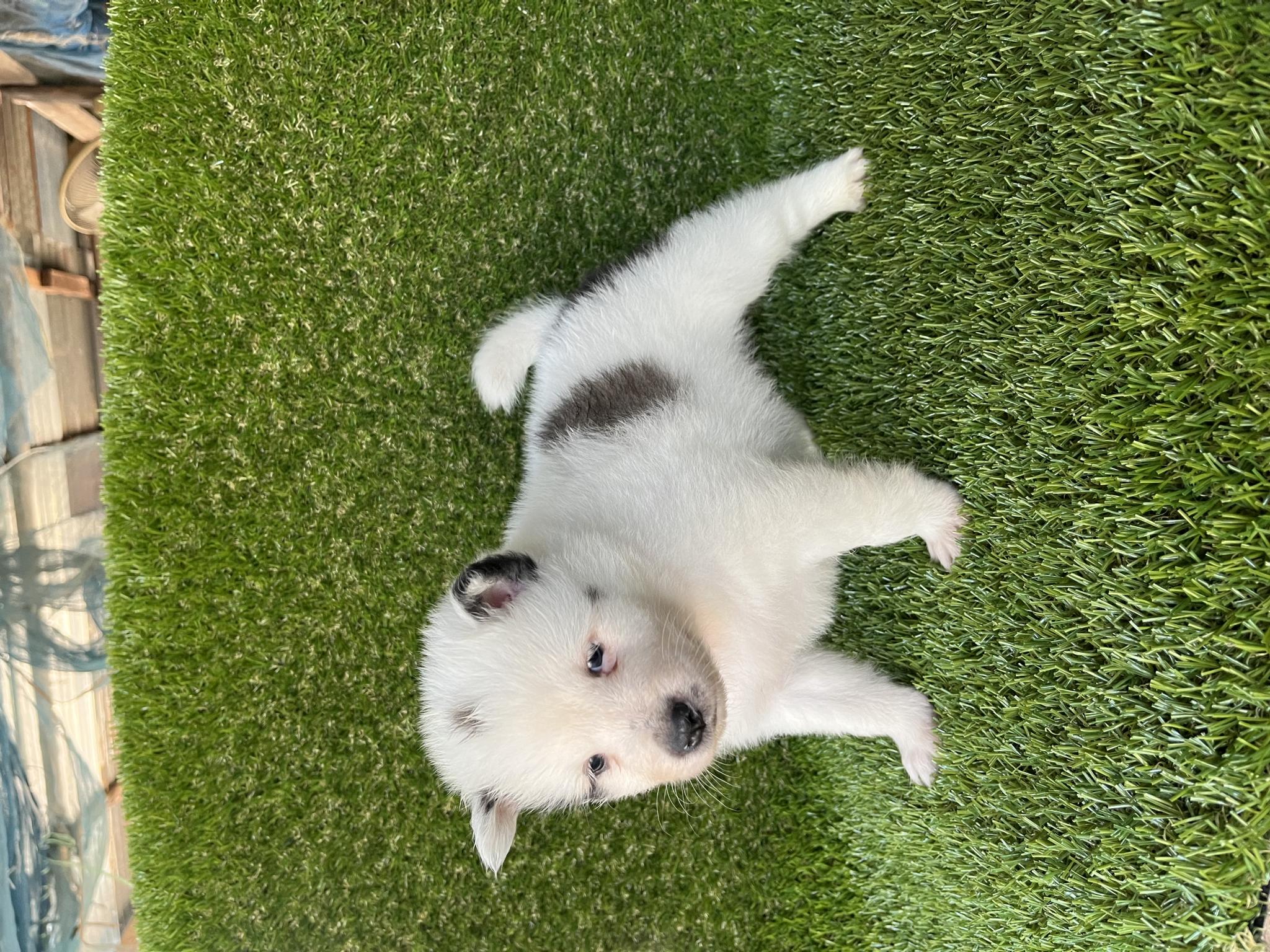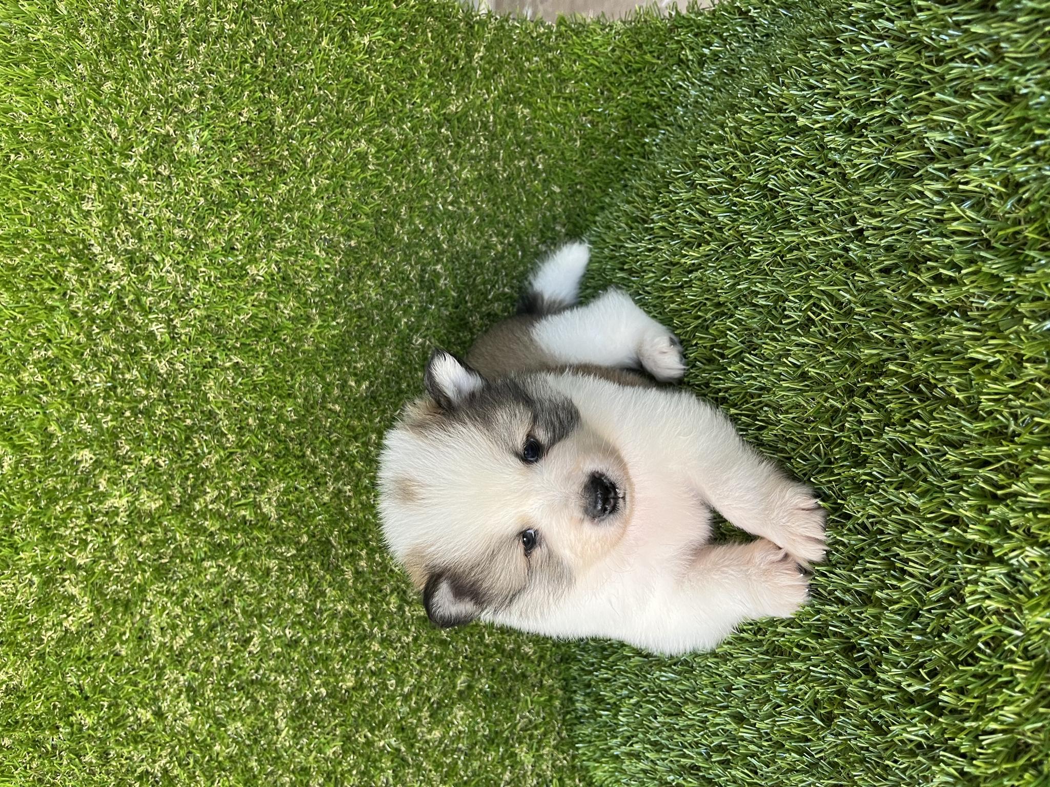 ลูกสุนัขบางแก้วขนฟูหูตั้งหางพวงสีขาวเทาหวานๆ