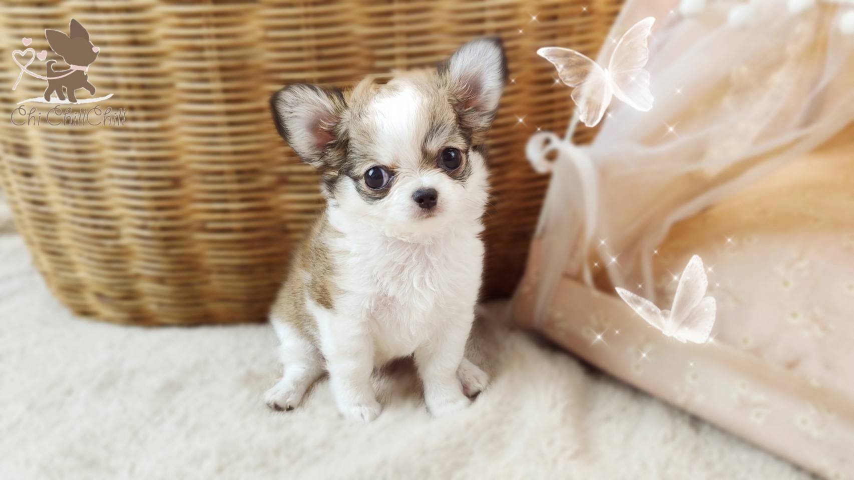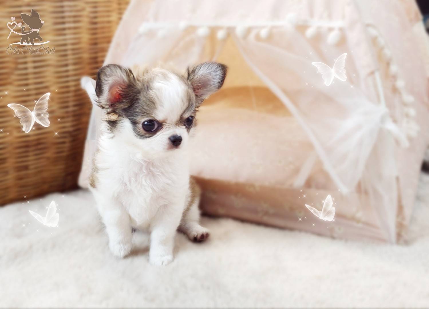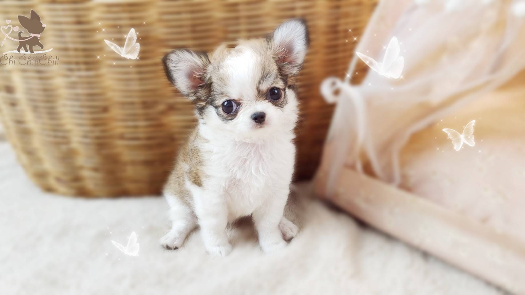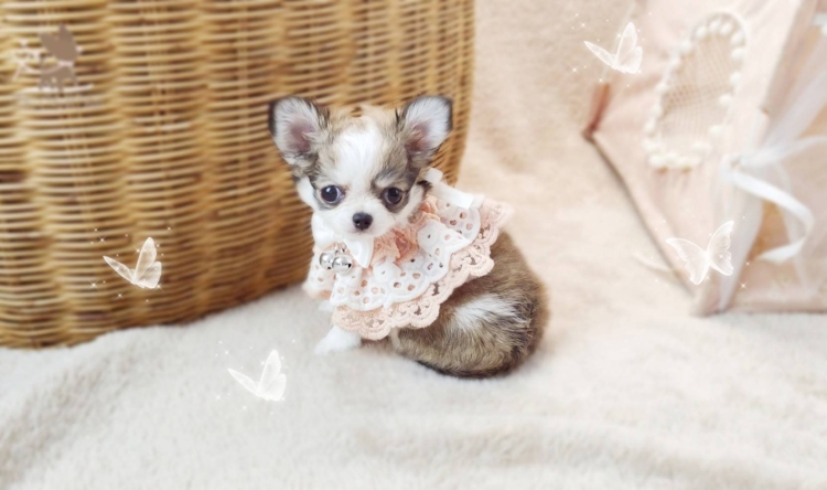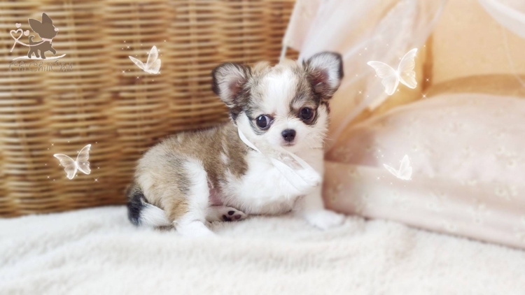 woolly coat tiny chihuahua with doll face and fluffy hair very cute. She's playful girl.