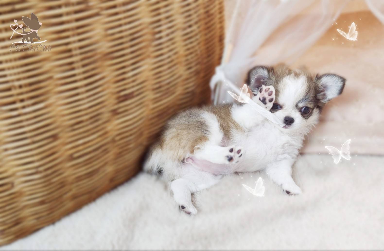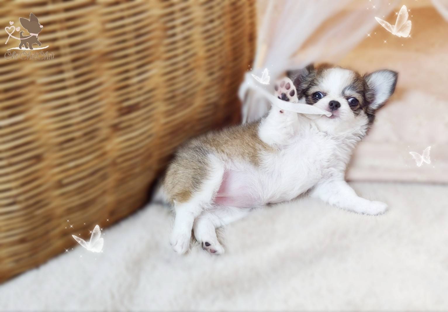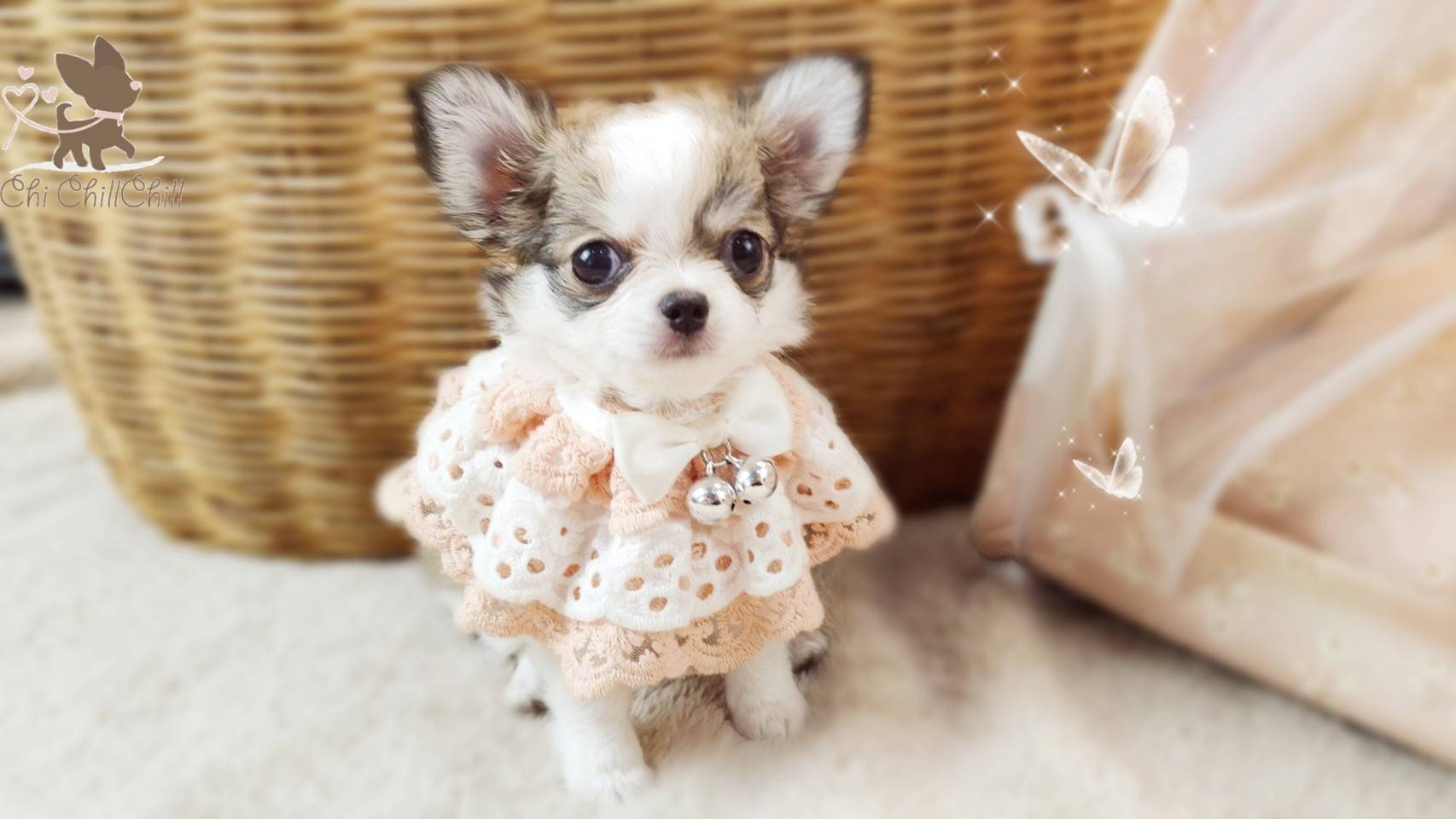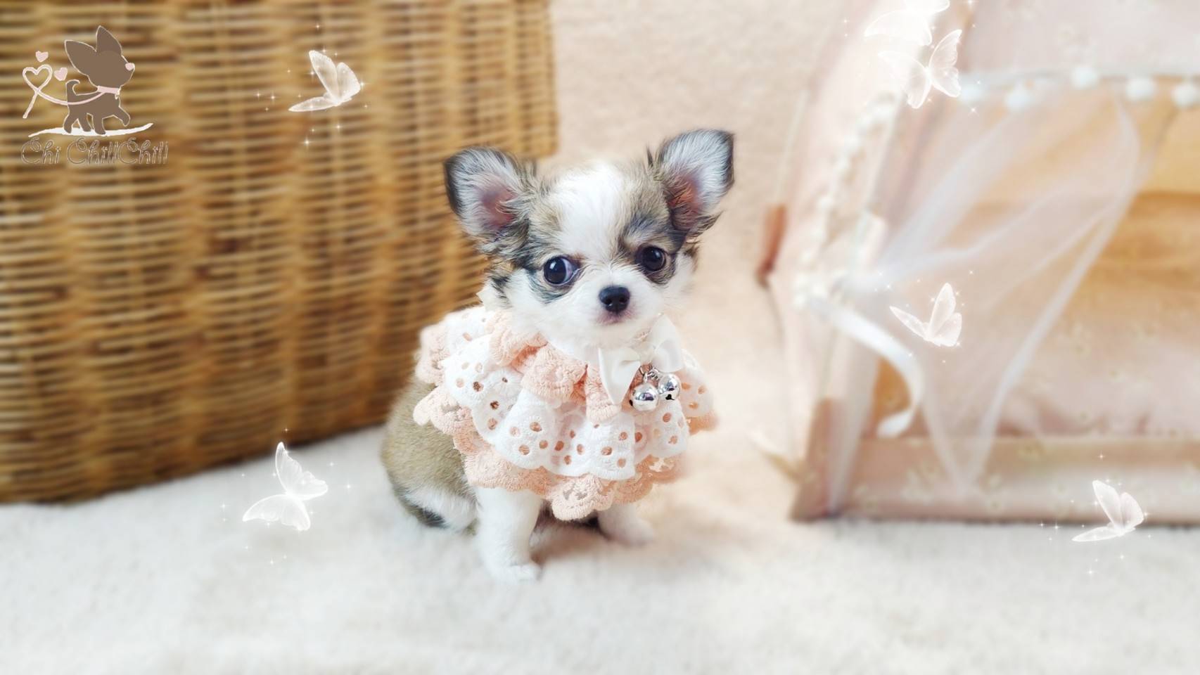 woolly coat tiny chihuahua with doll face and fluffy hair very cute. She's playful girl.