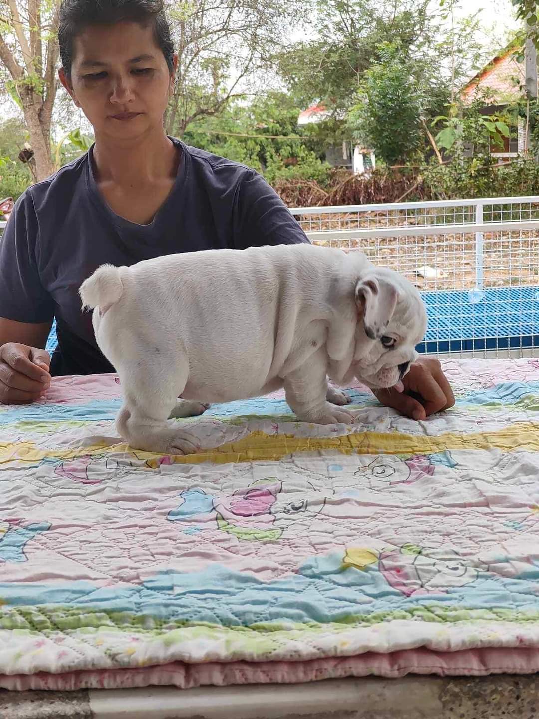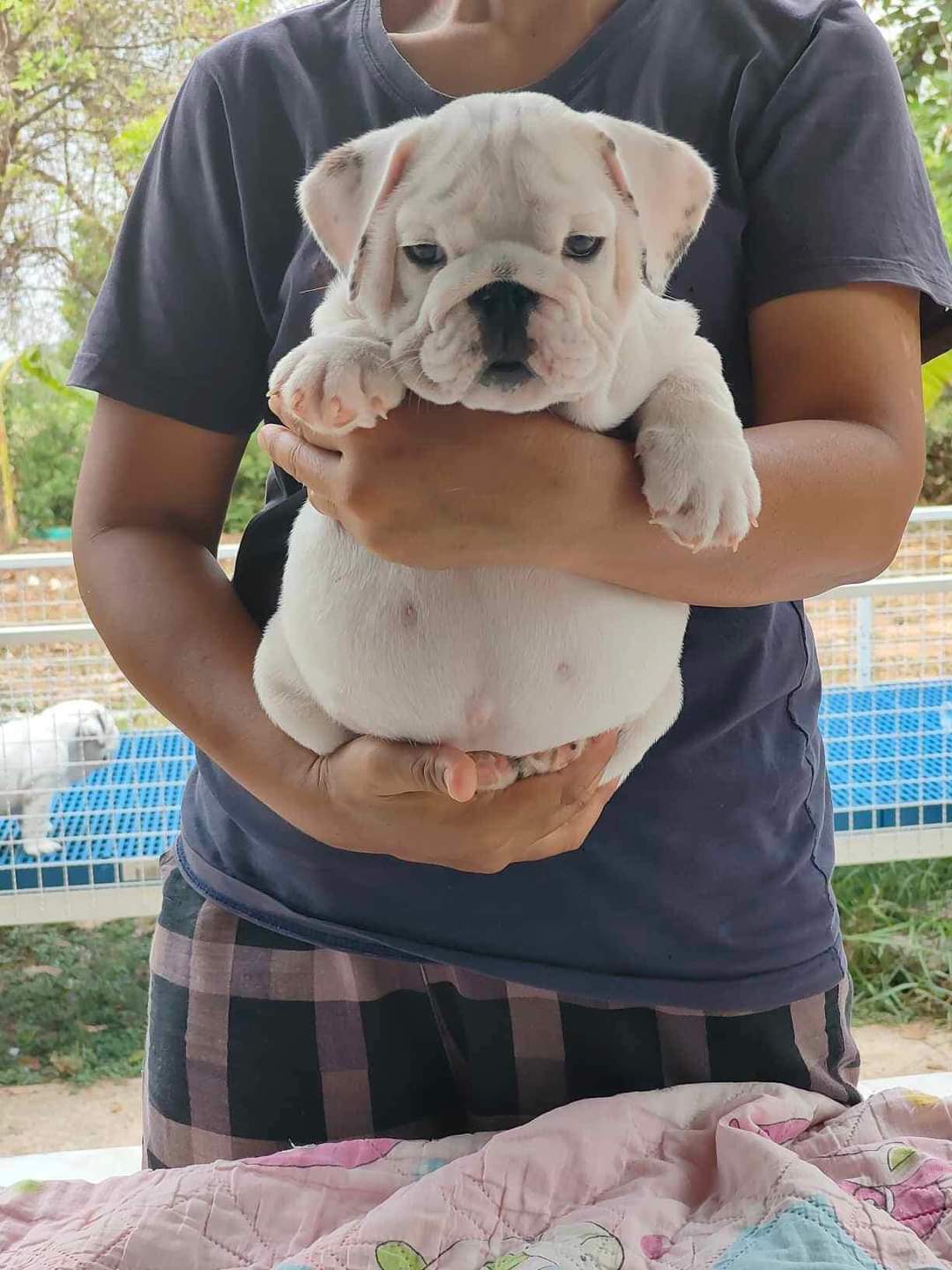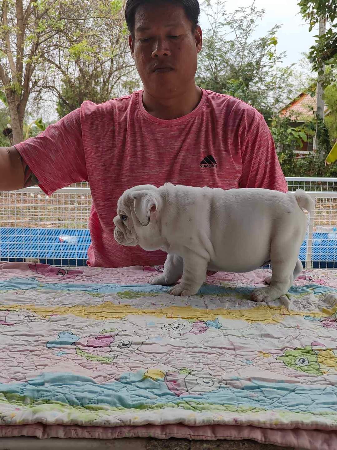 อิงลิชบลูด็อกเพศผู้สีขาวล้วนสายเลือดดีแข็งแรงมีใบเพ็ดดีกรีรับรองสายพันจากสมาคมสนใจโทร0857477711 f:น้ำเพชร บุญมี