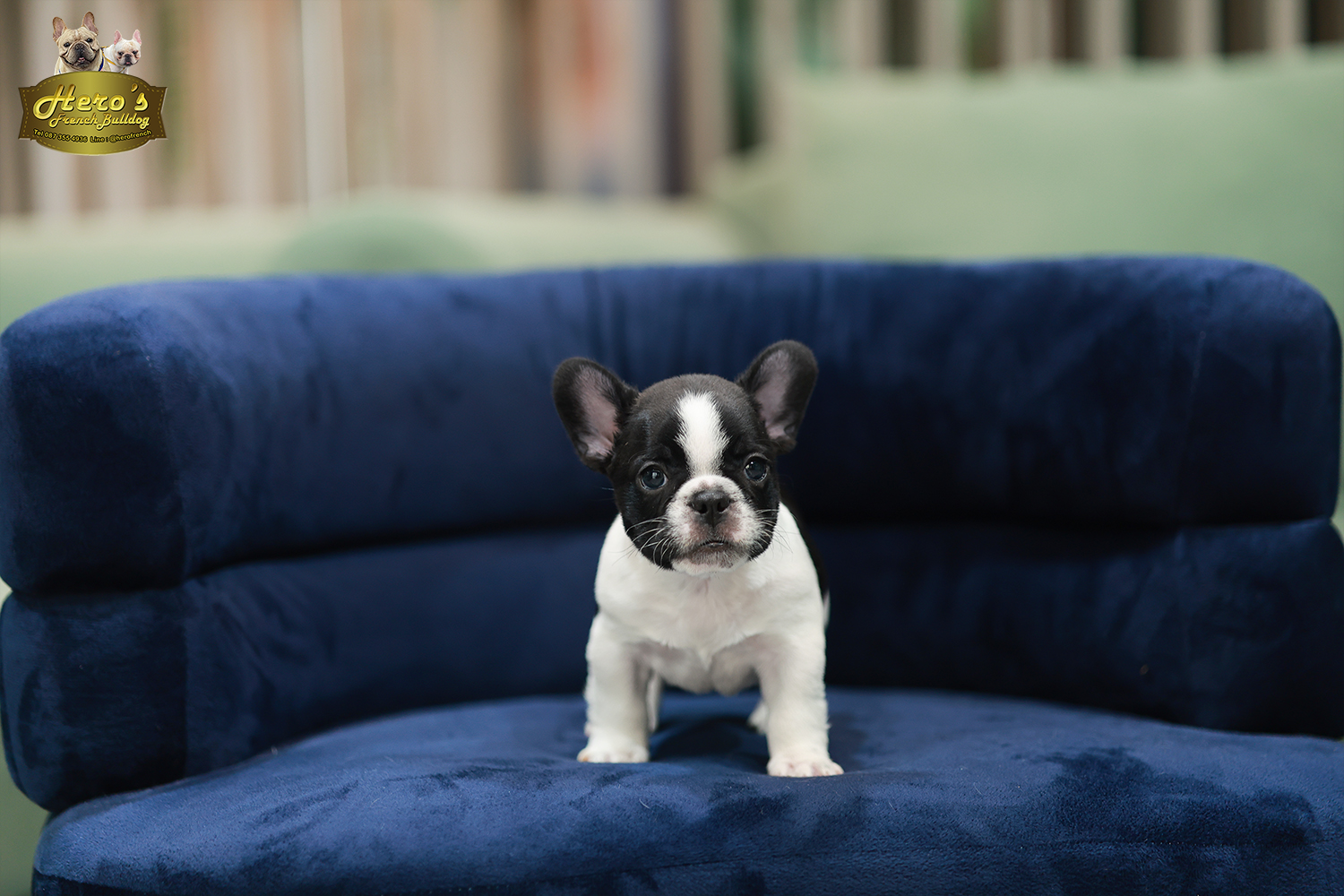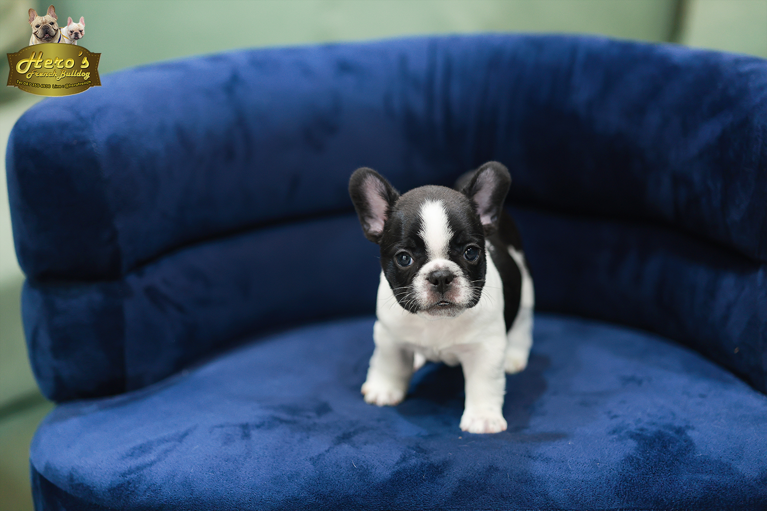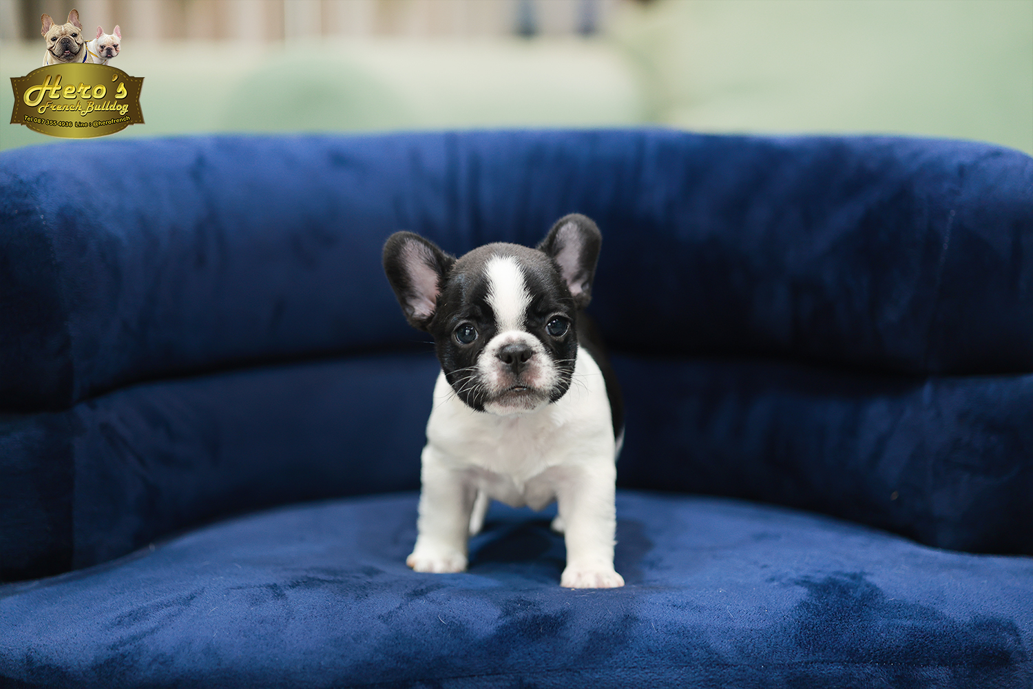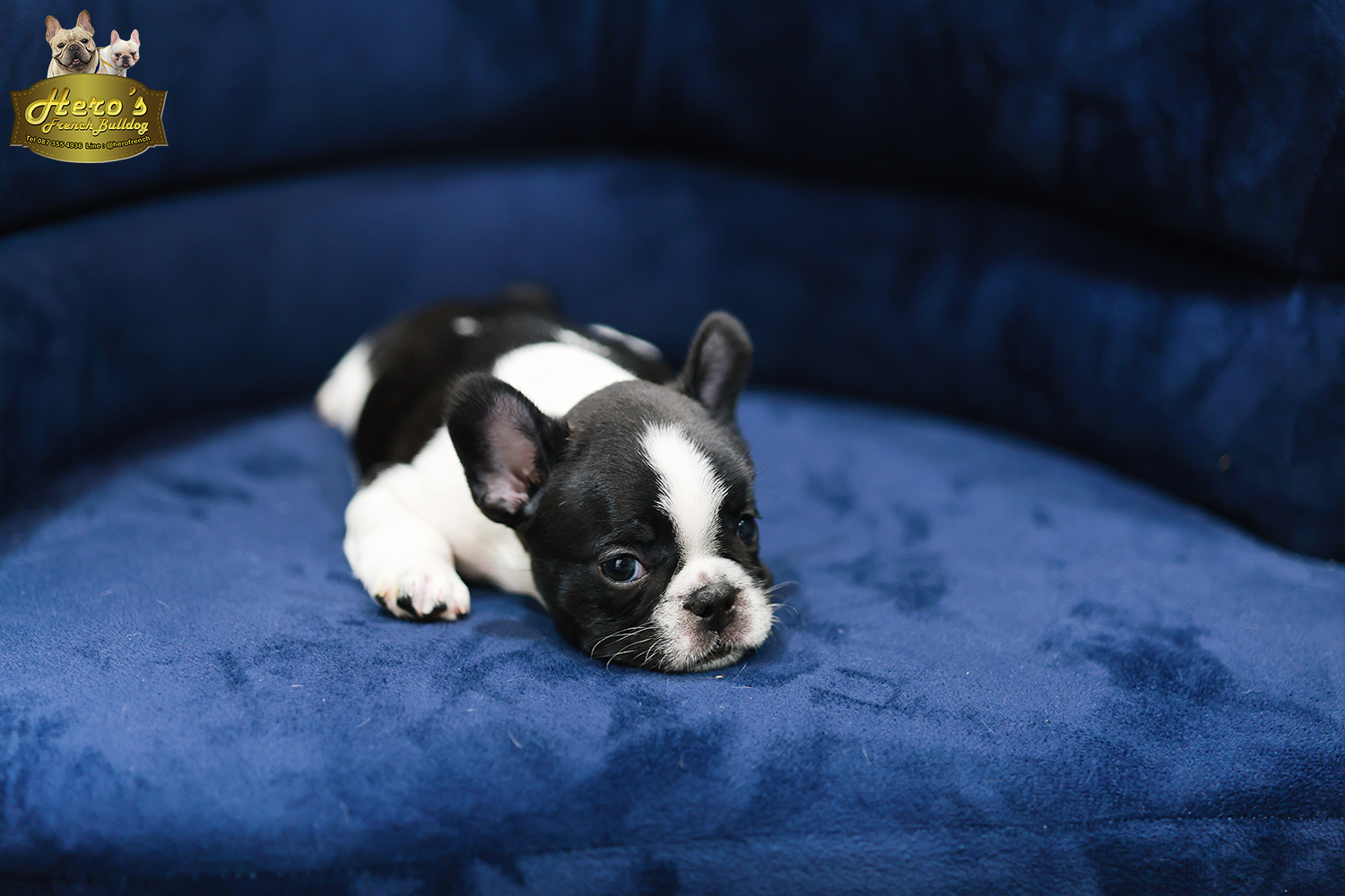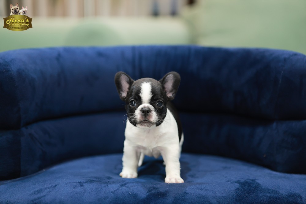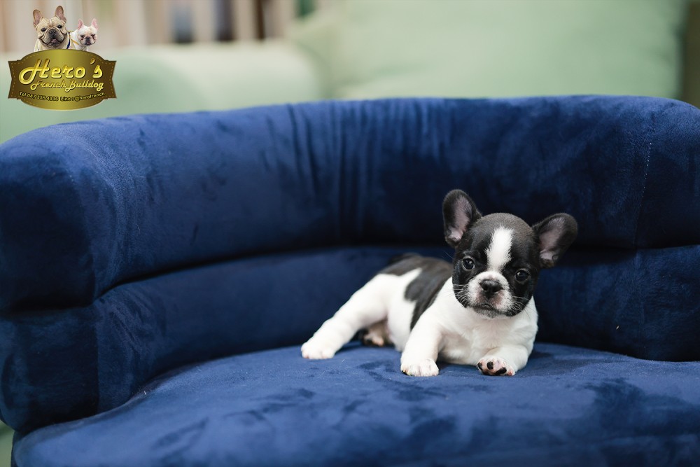 เฟรน บลูด็อก FHF-50858 เพศหญิง สีขาวดำ อายุ 2 เดือน ตัวเล็ก ขาสั้น หน้าสั้น ขนแน่นฟู