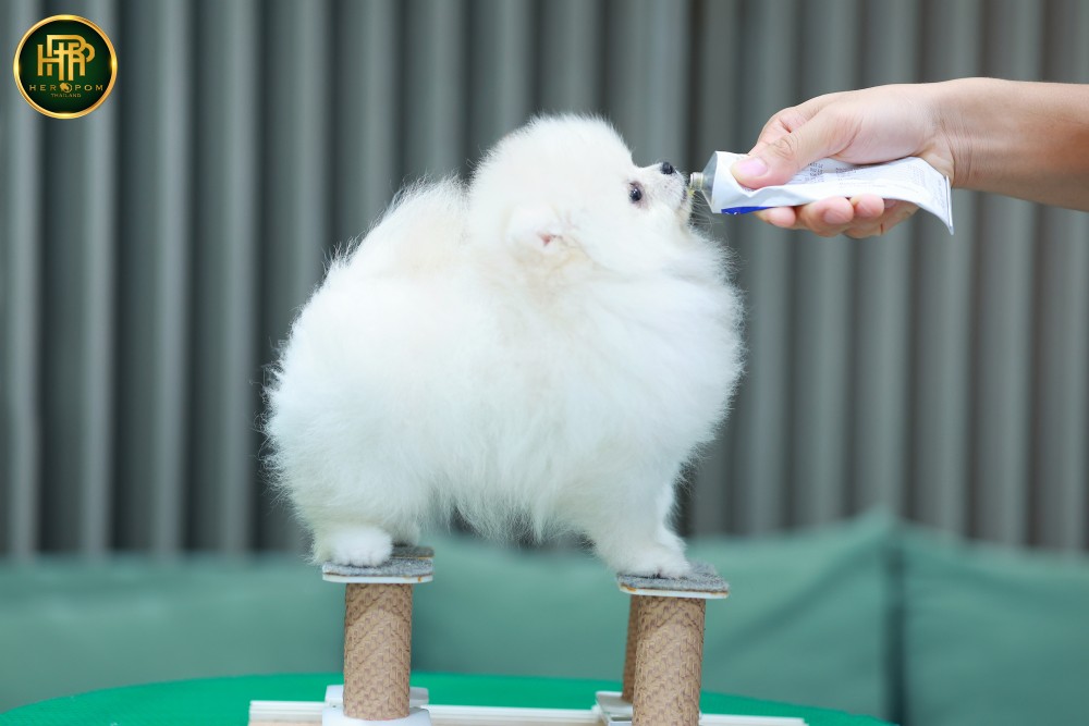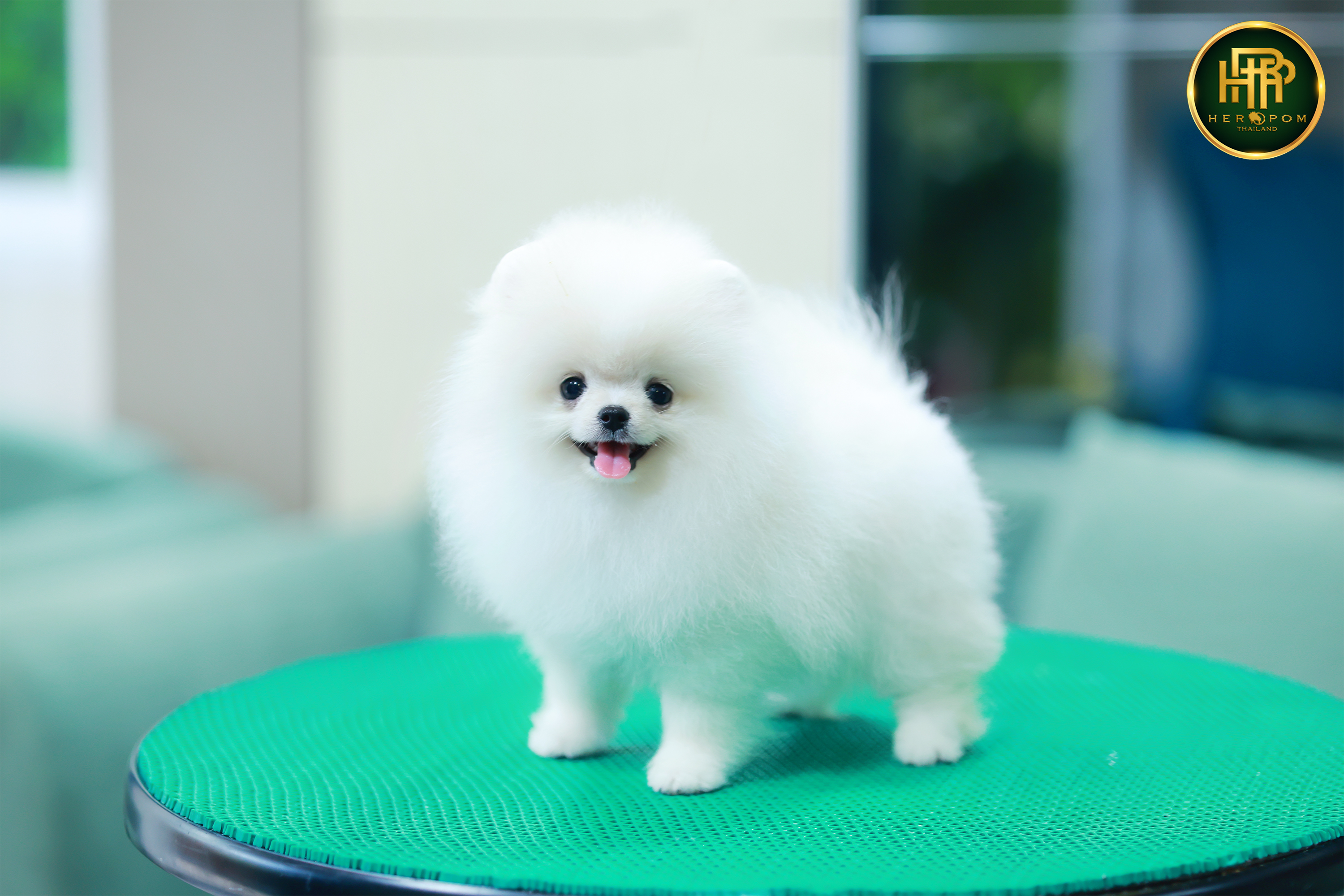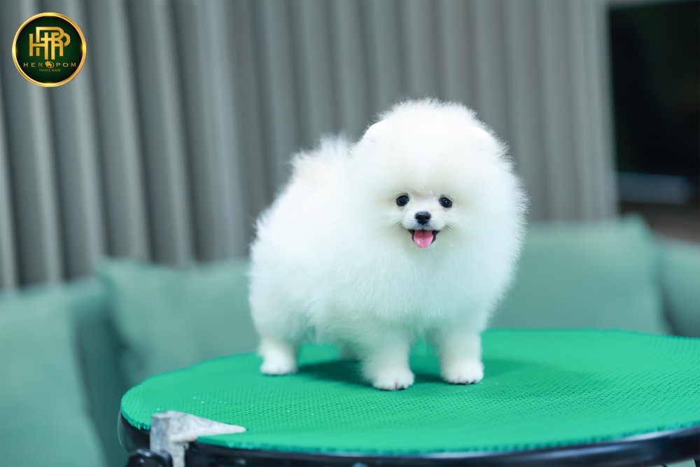 ปอมหน้าหมี ปอมแท้ ปอมเมอเรเนียน HRF-26222 เพศหญิง สีขาว อายุ 2 เดือน ตัวเล็ก ขาสั้น หน้าสั้น ขนแน่นฟู