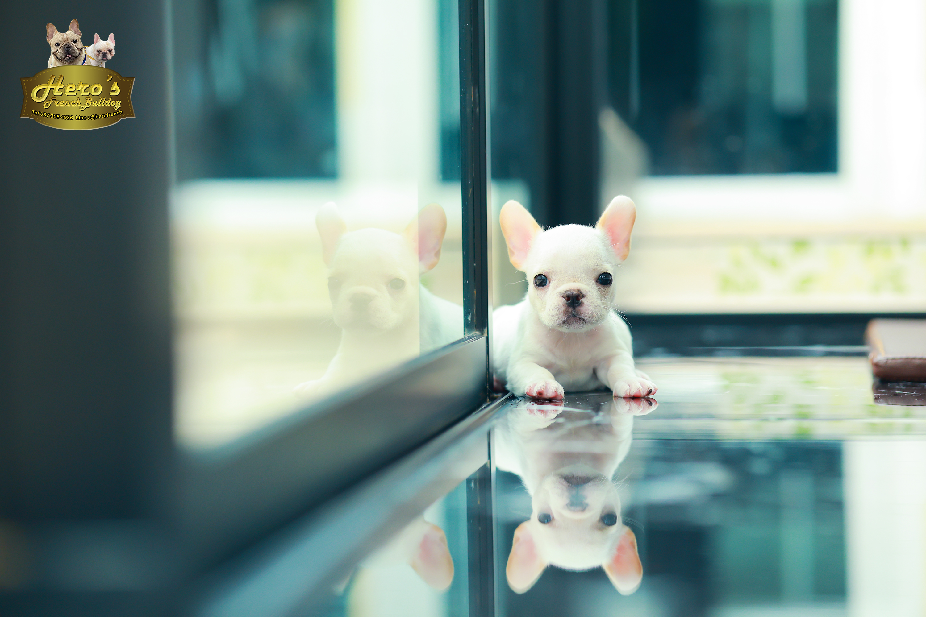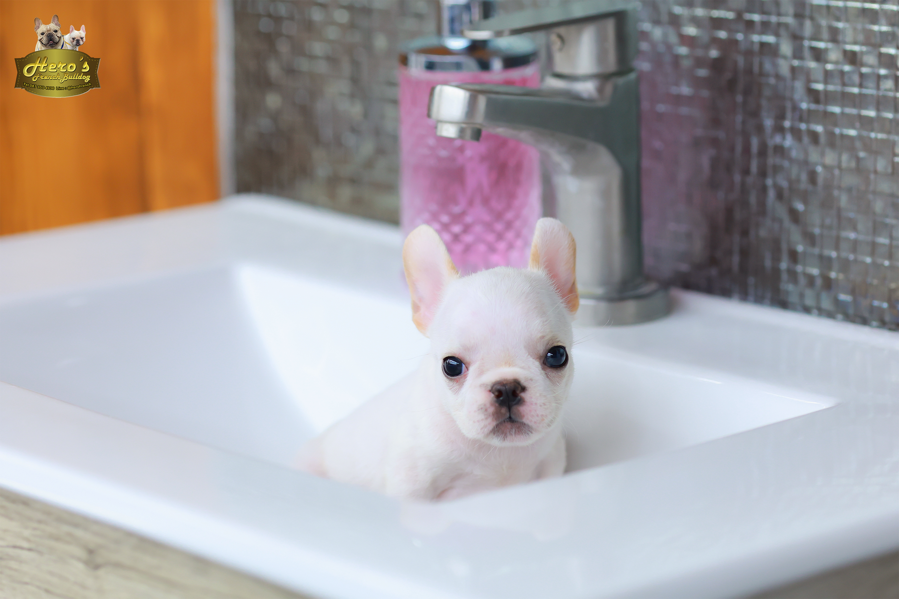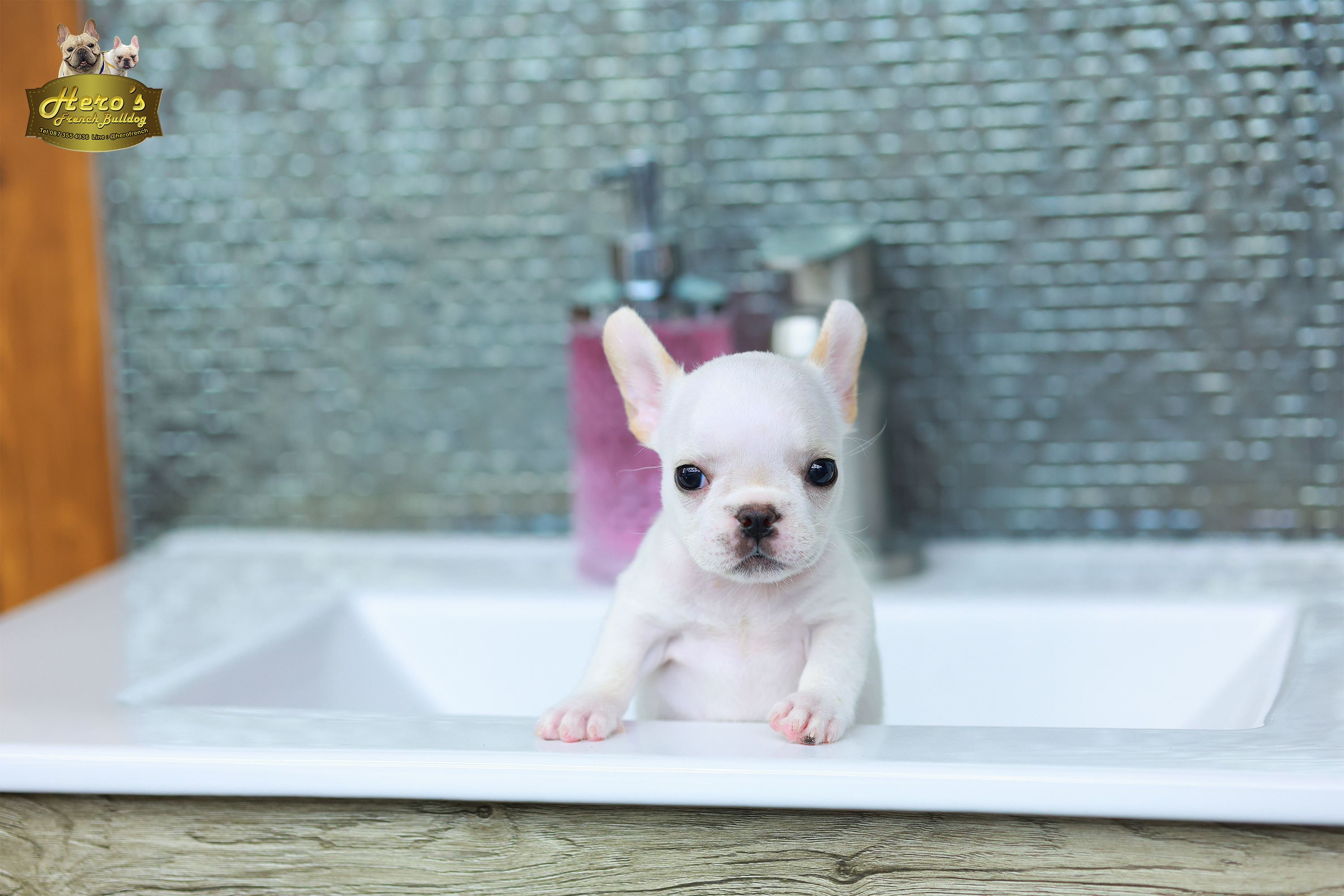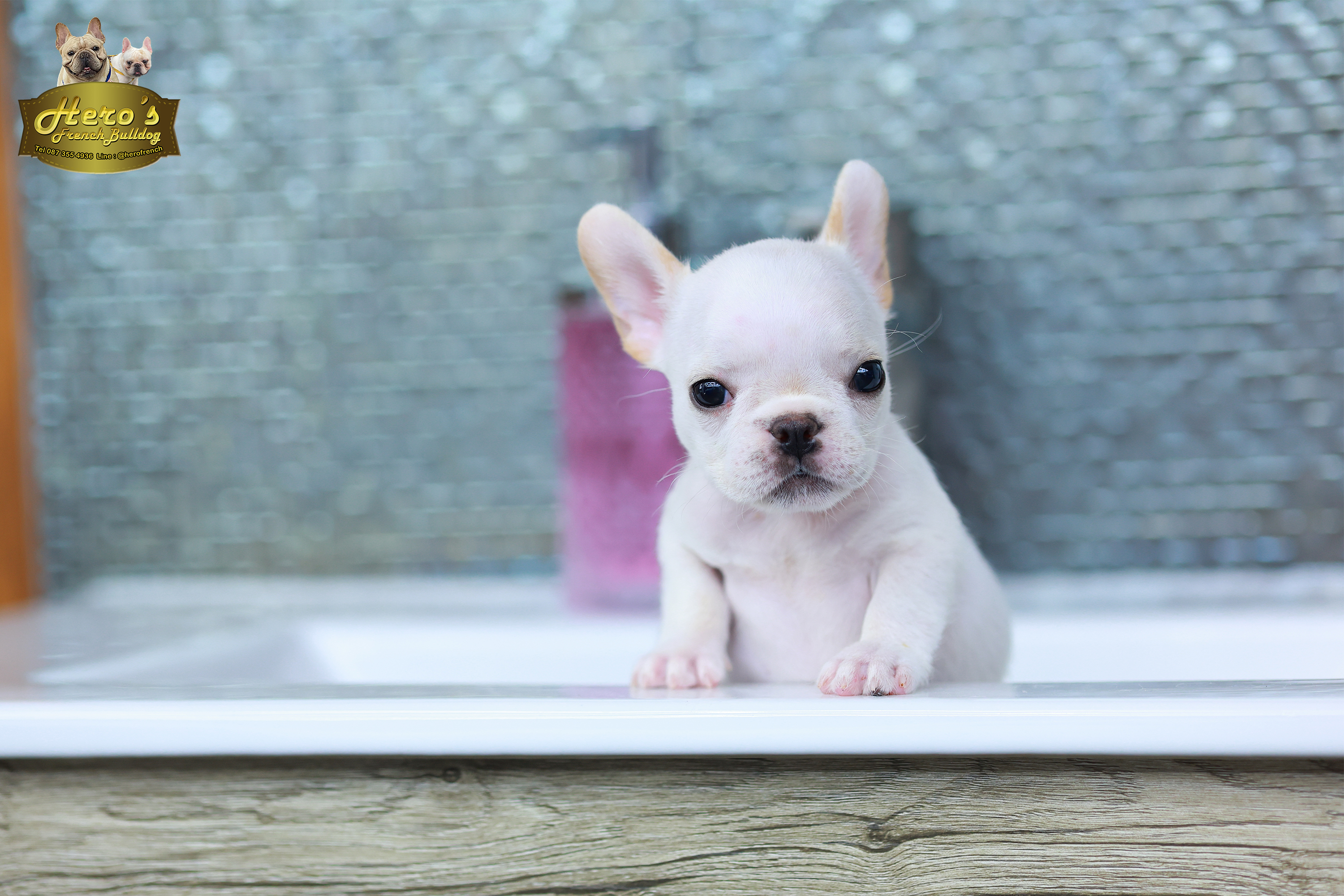 เฟรน บลูด็อก FHF-26237 เพศหญิง สีขาว อายุ 2 เดือน ตัวเล็ก ขาสั้น หน้าสั้น ขนแน่นฟู