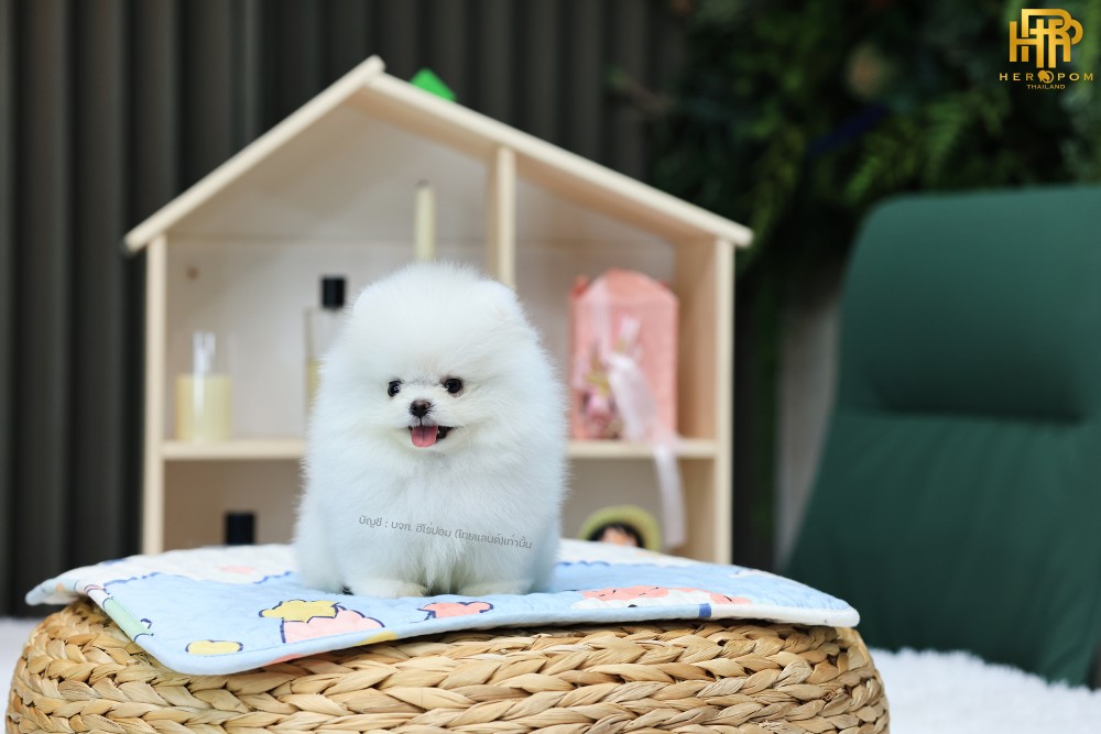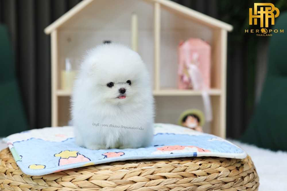 ปอมหน้าหมี ปอมแท้ ปอมเมอเรเนียน HRM-68119 เพศชาย สีขาว อายุ 2 เดือน ตัวเล็ก ขาสั้น หน้าสั้น ขนแน่นฟู