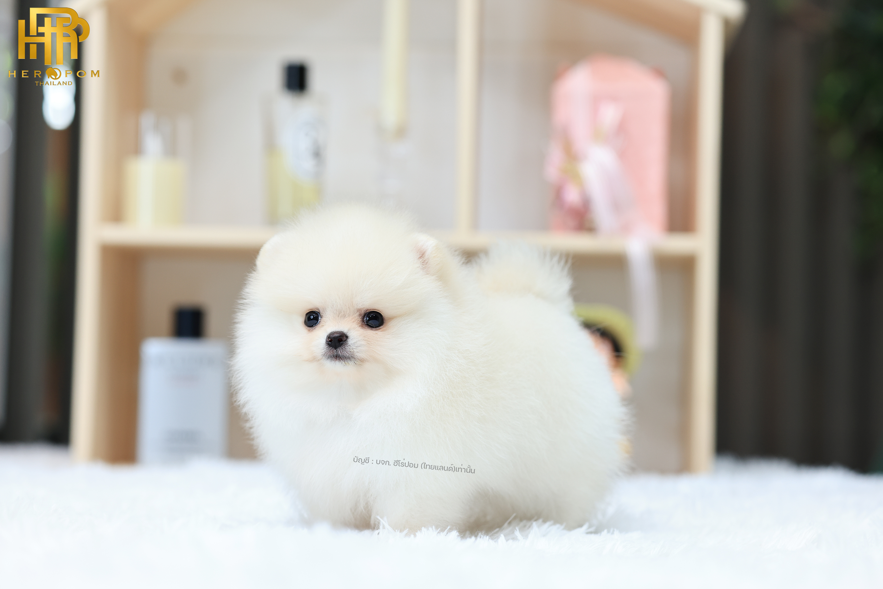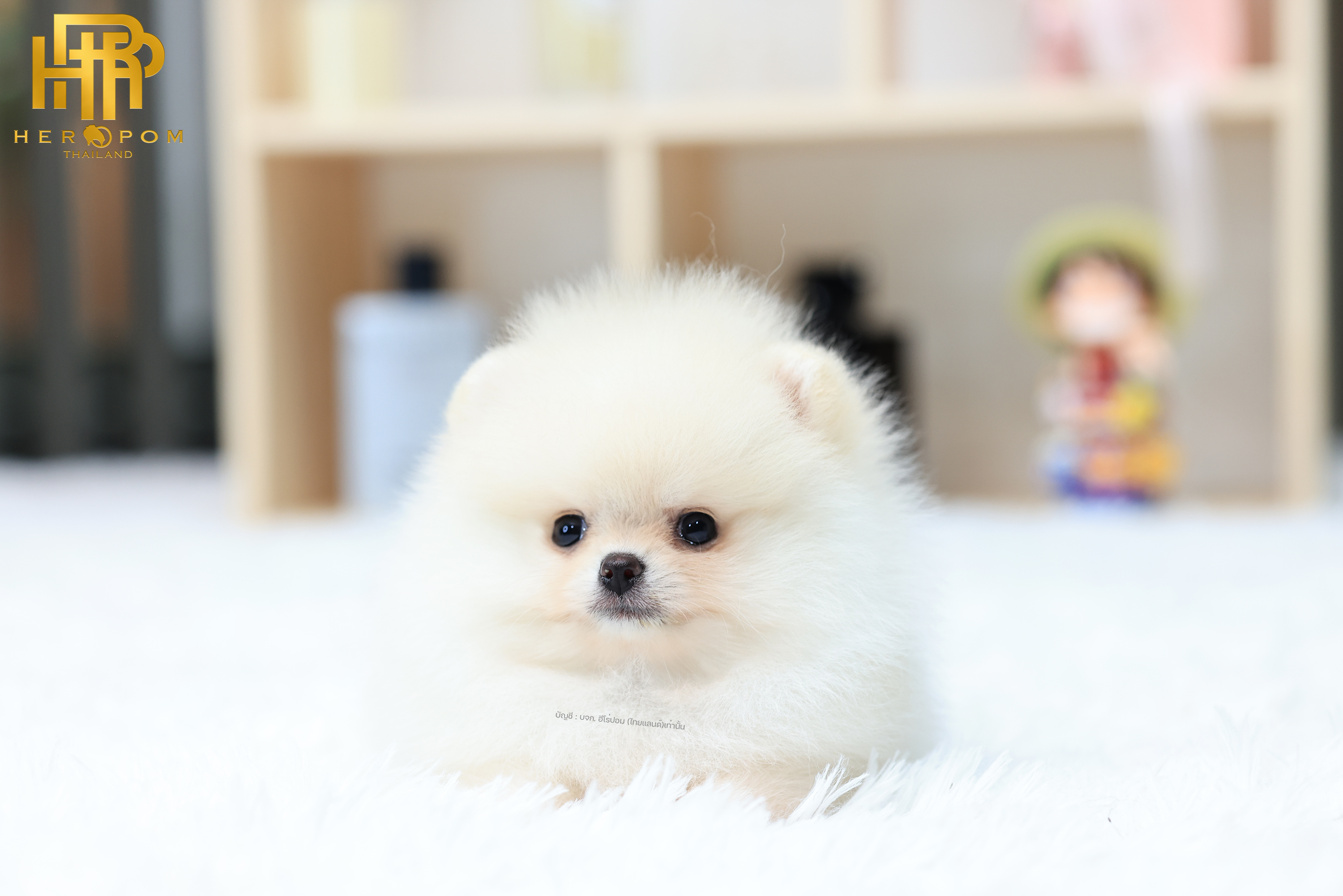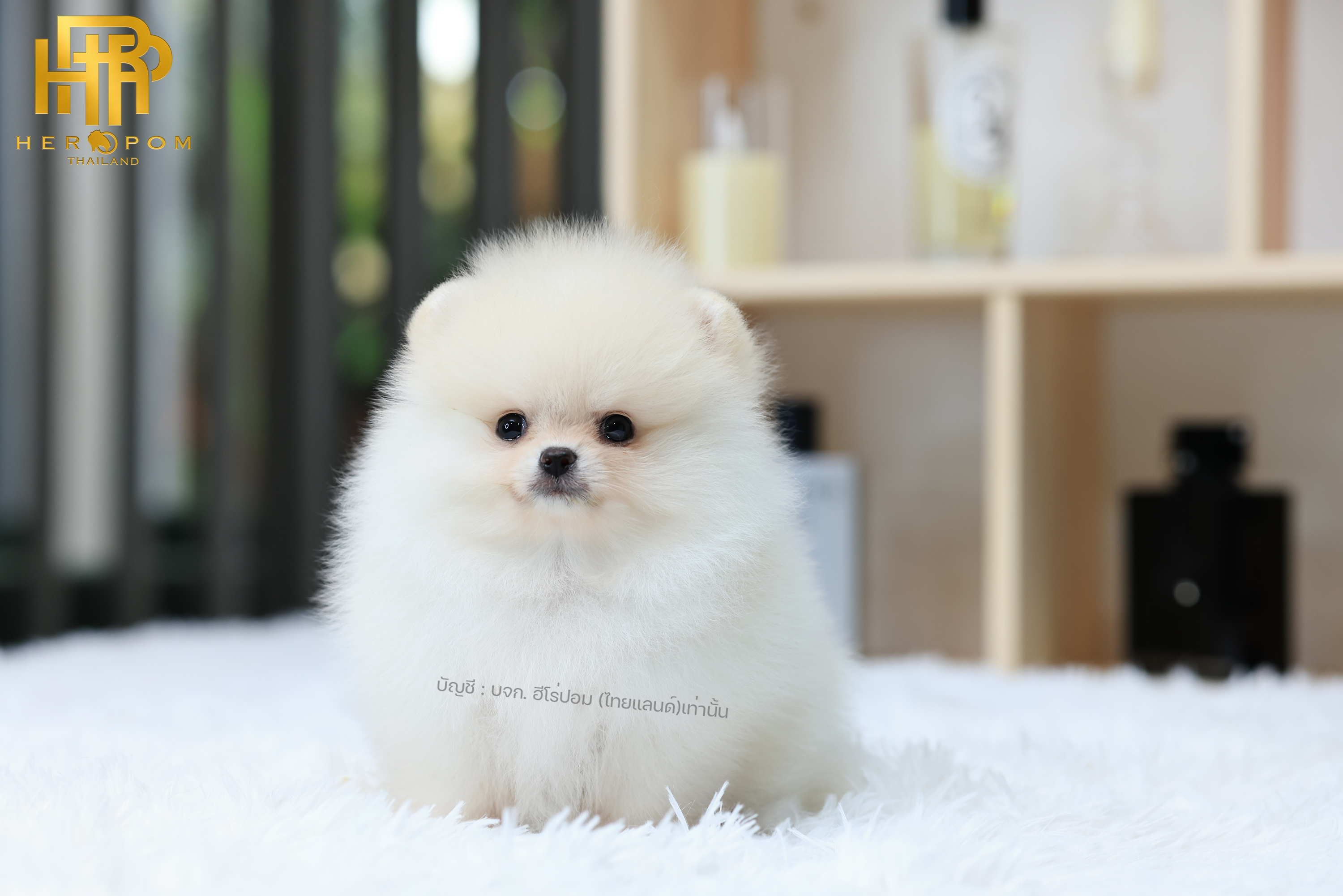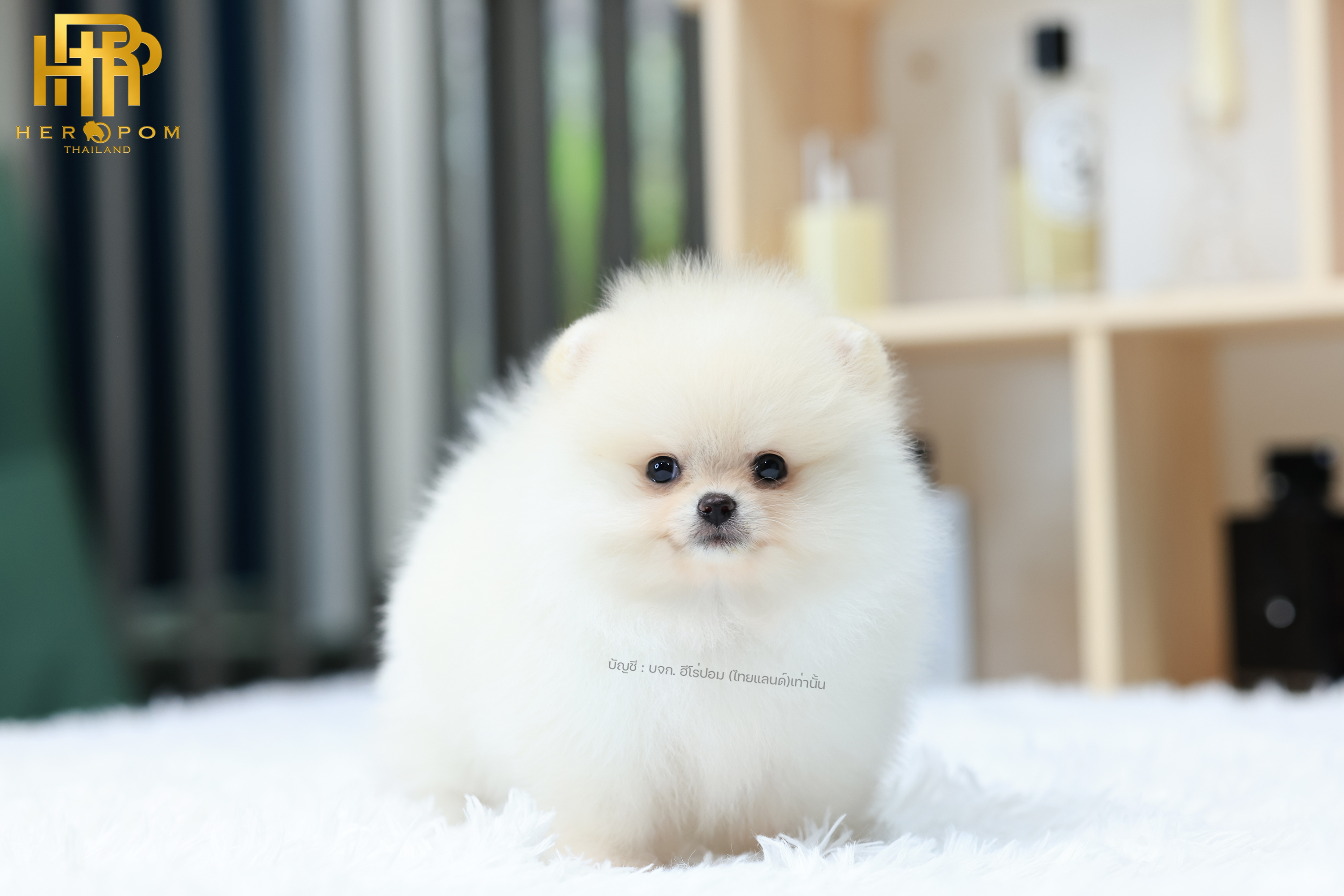 ปอมหน้าหมี ปอมแท้ ปอมเมอเรเนียน HRF-68932 เพศหญิง สีขาว อายุ 2 เดือน ตัวเล็ก ขาสั้น หน้าสั้น ขนแน่นฟู