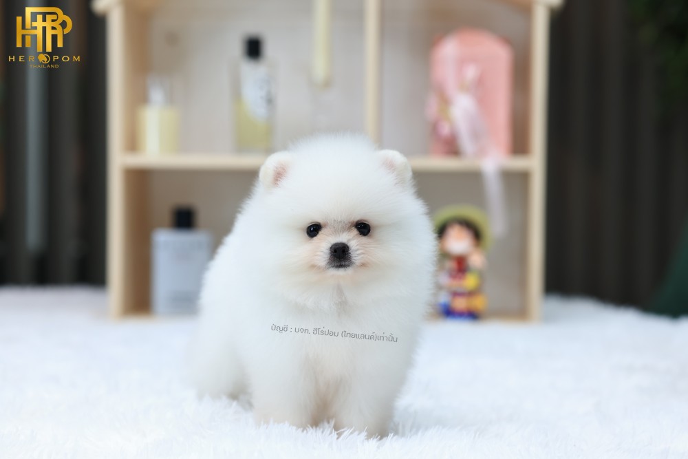 ปอมหน้าหมี ปอมแท้ ปอมเมอเรเนียน HRF-68386 เพศหญิง สีขาว อายุ 2 เดือน ตัวเล็ก ขาสั้น หน้าสั้น ขนแน่นฟู