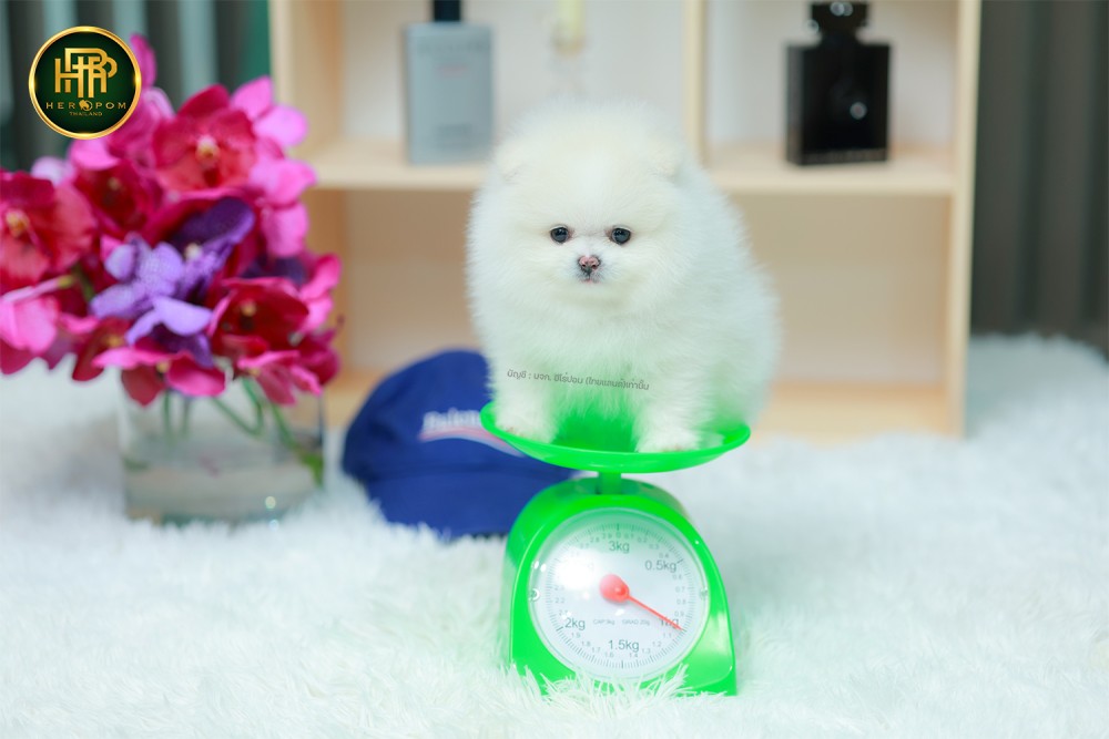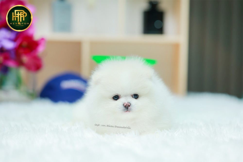 ปอมแท้ ปอมเมอเรเนียน HRF-68131 เพศหญิง สีขาว อายุ 2 เดือน หน้าตาน่ารัก ขาสั้น ขนแน่นฟู ขี้เล่นมาก