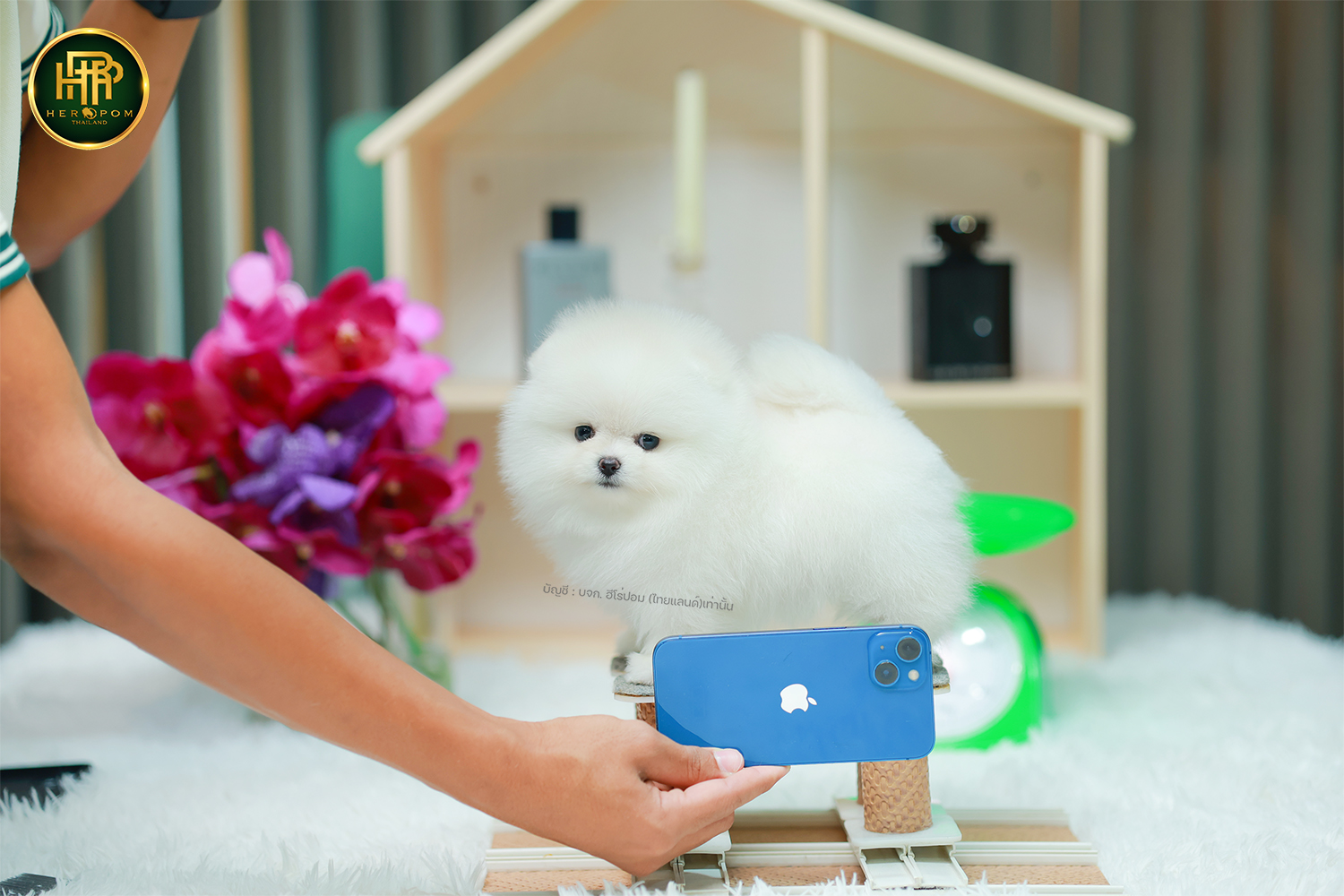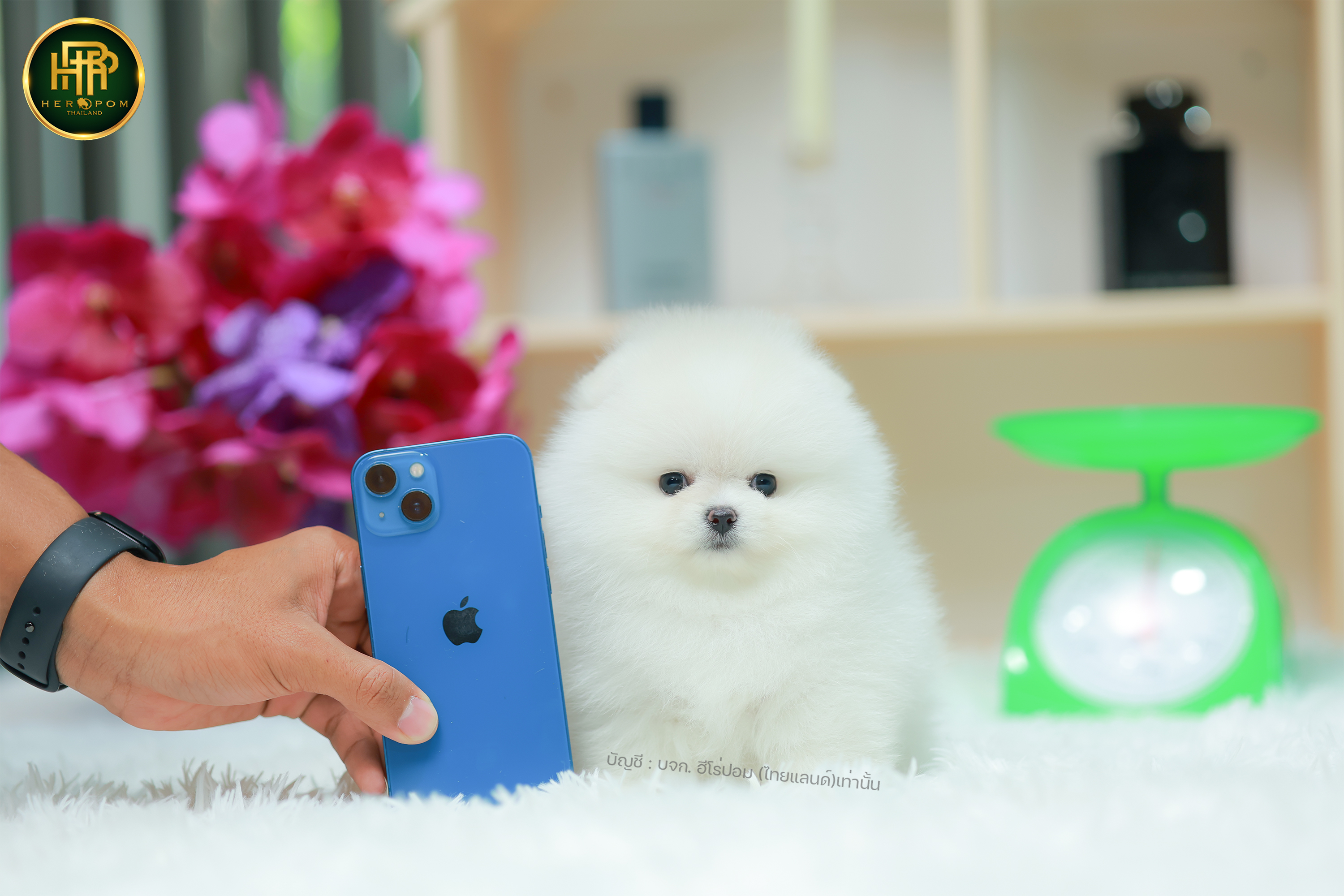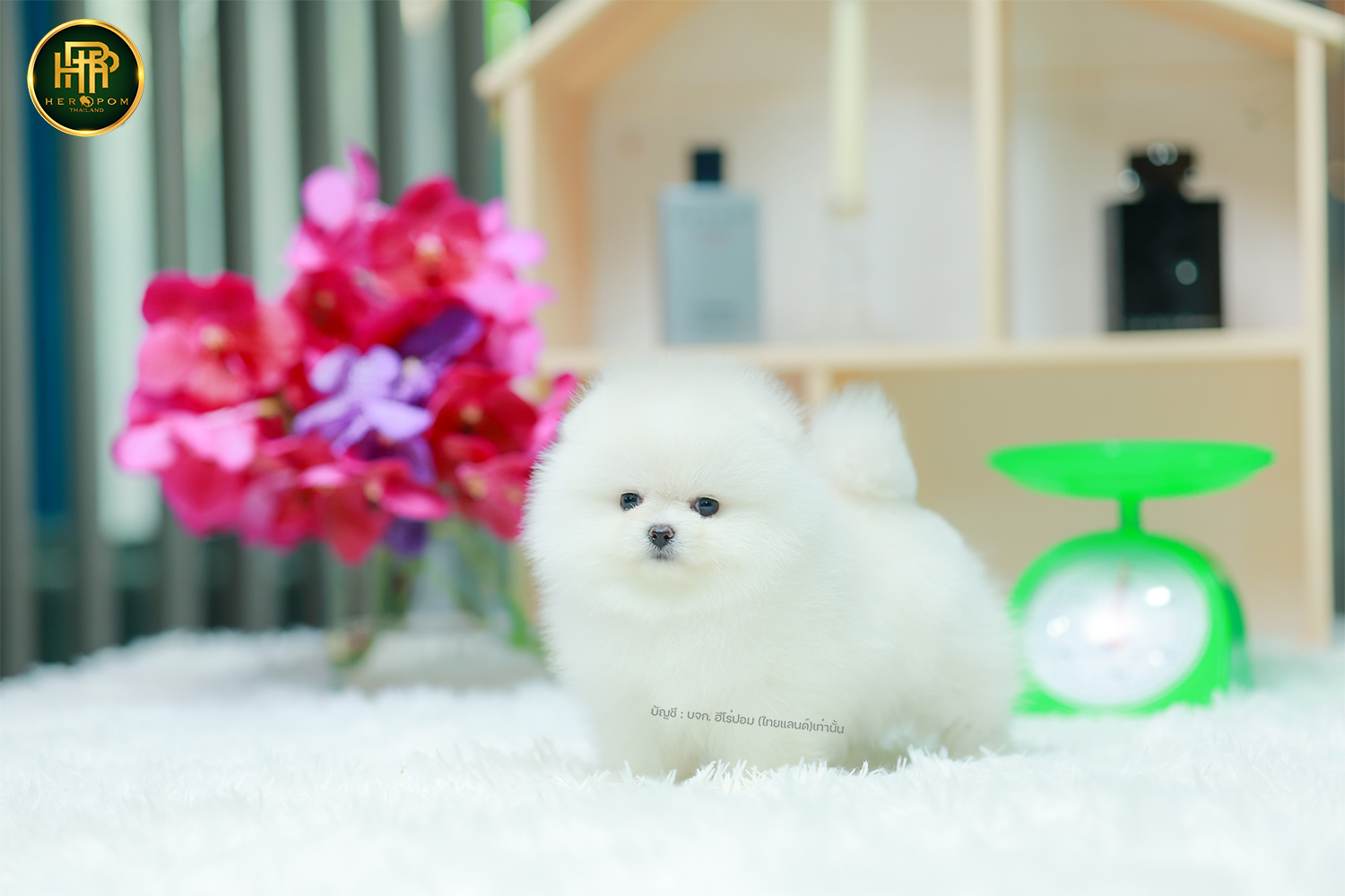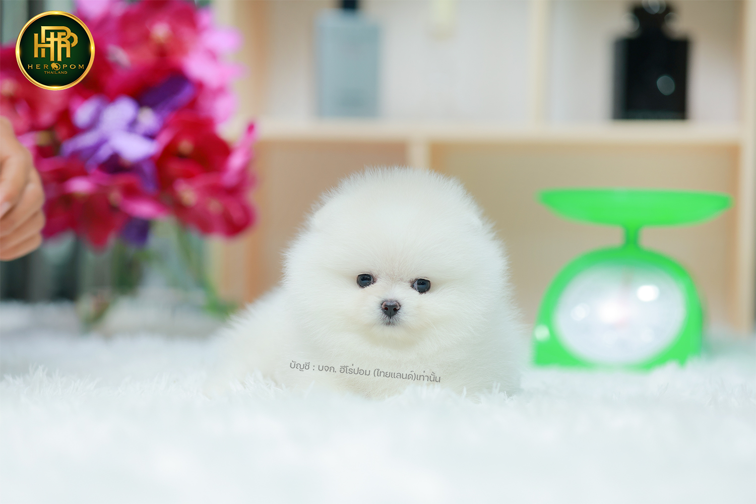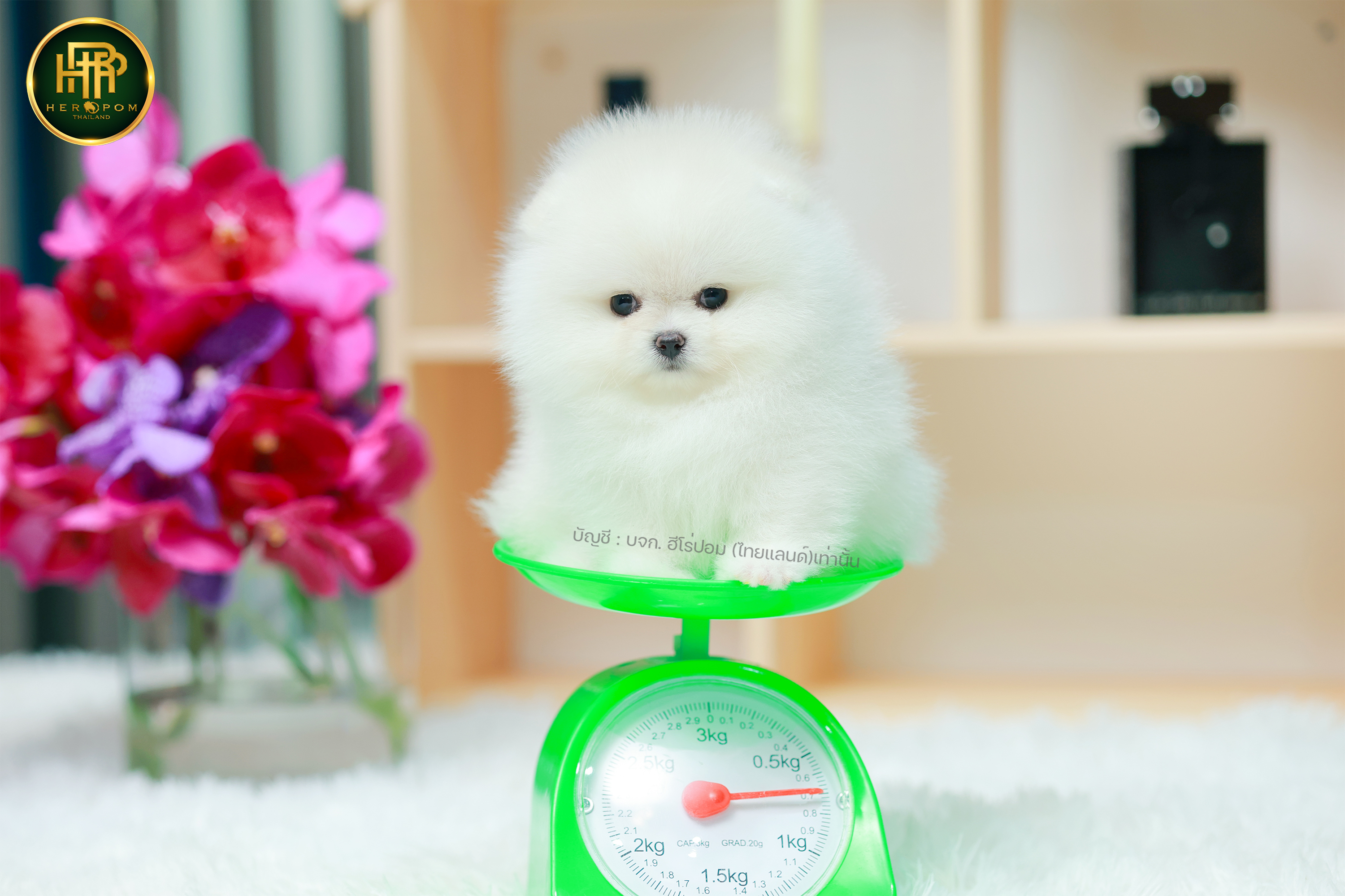 ปอมแท้ ปอมเมอเรเนียน HRF-68126 เพศหญิง สีขาว อายุ 2 เดือน หน้าตาน่ารัก ขาสั้น ขนแน่นฟู ขี้เล่นมาก