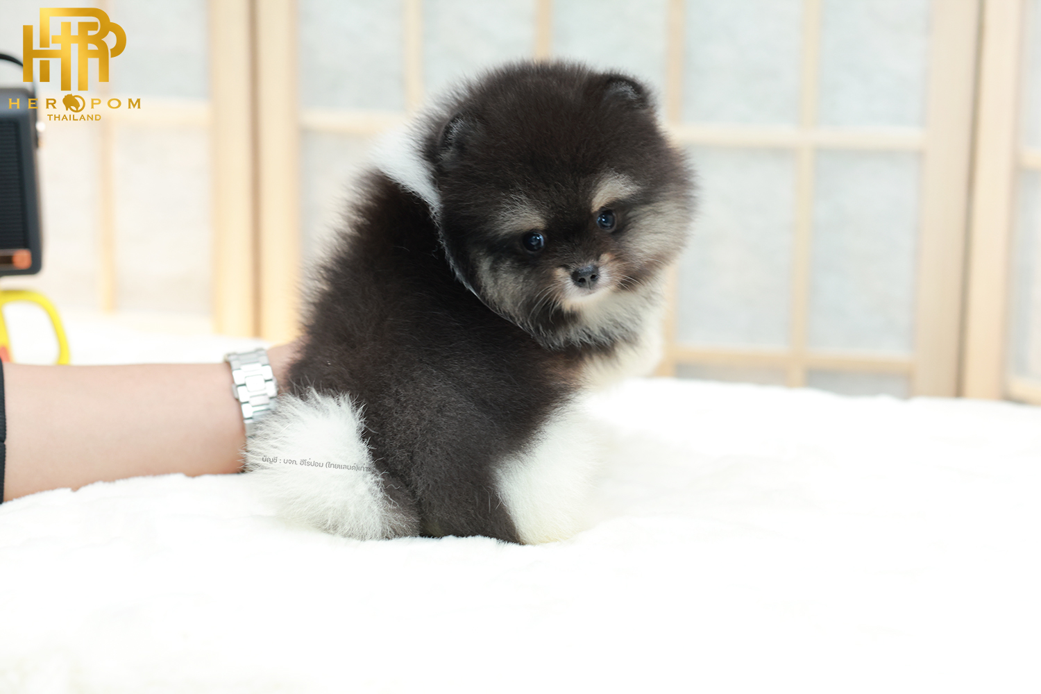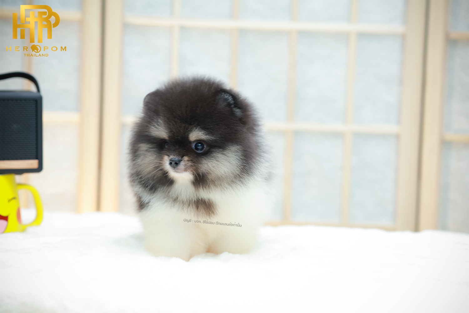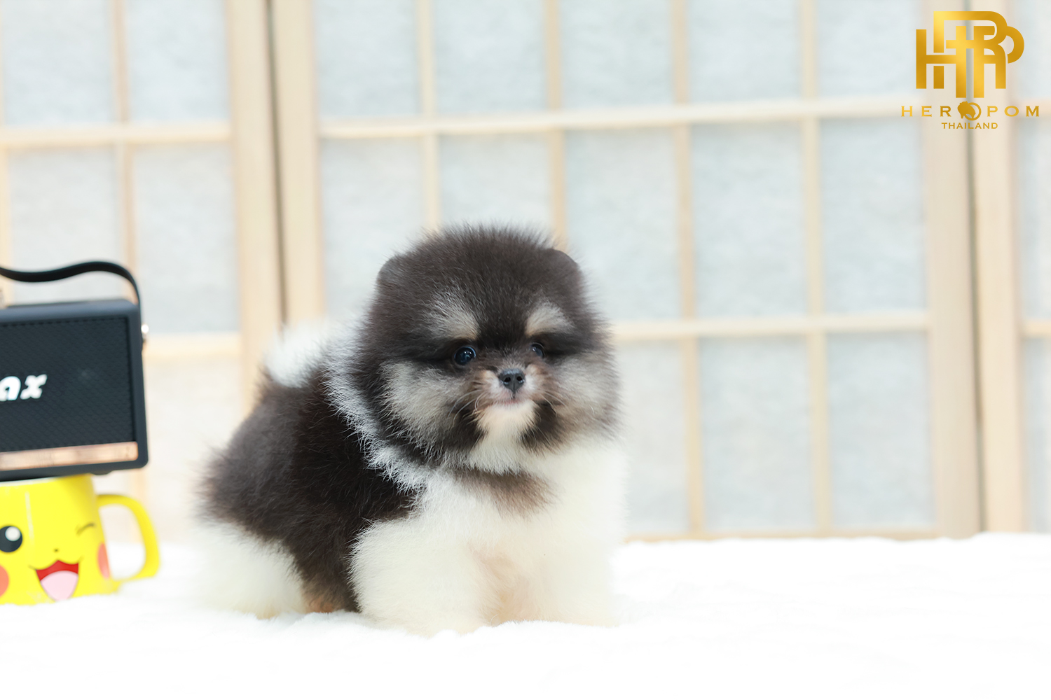 ปอมแท้ ปอมเมอเรเนียน HRM-85166 เพศชาย สีไตรคัลเลอร์ อายุ 2 เดือน หน้าตาน่ารัก ขาสั้น ขนแน่นฟู ขี้เล่นมาก