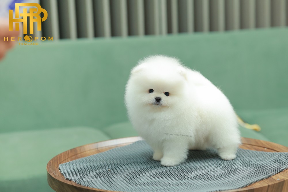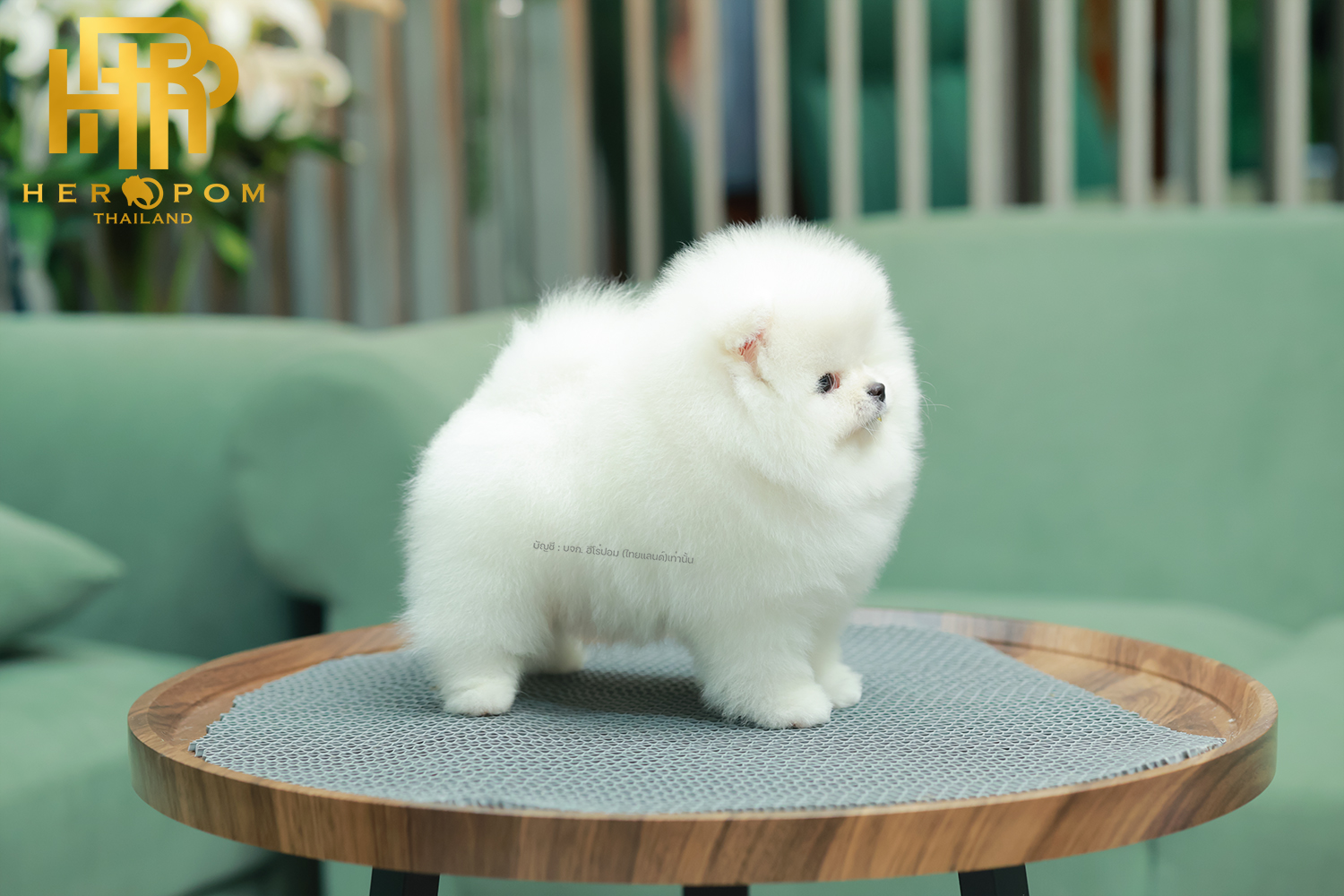 ปอมหน้าหมี ปอมแท้ ปอมเมอเรเนียน HRM-26517 เพศชาย สีขาว อายุ 2 เดือน ตัวเล็ก ขาสั้น หน้าสั้น ขนแน่นฟู