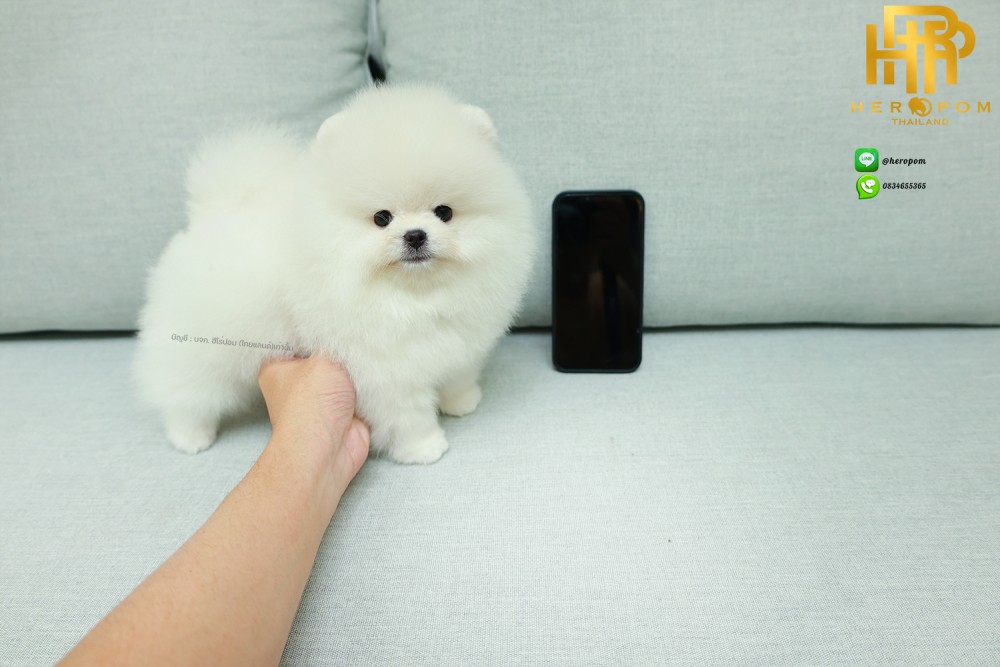 ปอมแท้ ปอมหน้าหมี HRM-26517 เพศชาย สีขาว อายุ 2 เดือน เจ้าหนูหมีขาวน่ารักมาก ๆ ตัวจิ๋ว ตากลมแบ๊ว จมูกนิด ใบหูน่ารักกลม ๆ ขี้เล่น ยิ้มเก่งฝุด ๆ พร้อมย้ายบ้านนะคะ มีใบรับรองจากสมาคมพัฒนาพันธุ์สุนัข (ใบเพ็ดดีกรีเต็มใบ) ส่งทั่วประเทศ