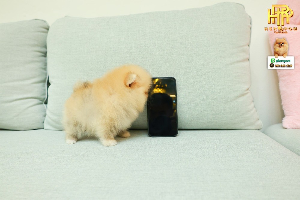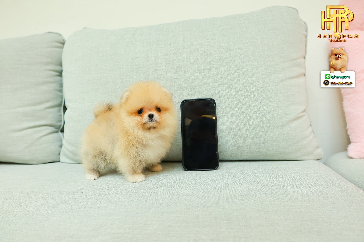 ปอมแท้ ปอมหน้าสั้น HRF-89103 เพศหญิง สีครีม หนูพกถุงเท้ามาด้วยน่ารักมาก ๆ ตากลม ไหนจะหูหมีอีกน่ารักมาก ๆ ตัวสั้น ตัวจิ๋วมาก มีใบรับรองจากสมาคมพัฒนาพันธุ์สุนัข (ใบเพ็ดดีกรีเต็มใบ) ส่งทั่วประเทศ