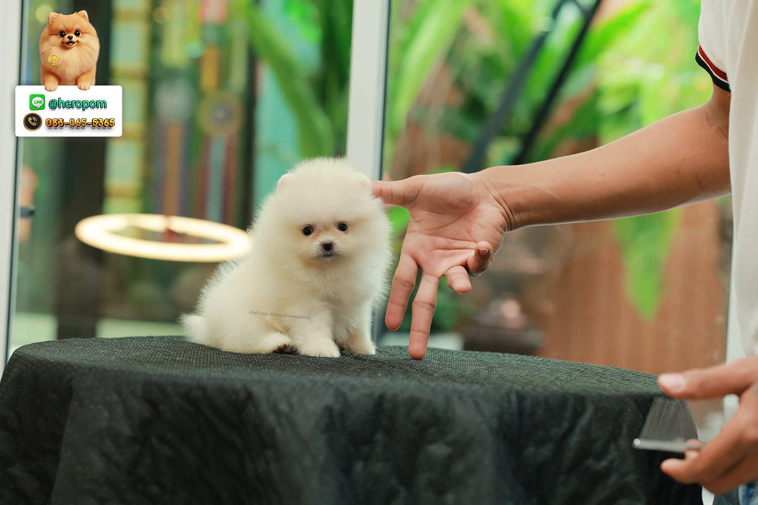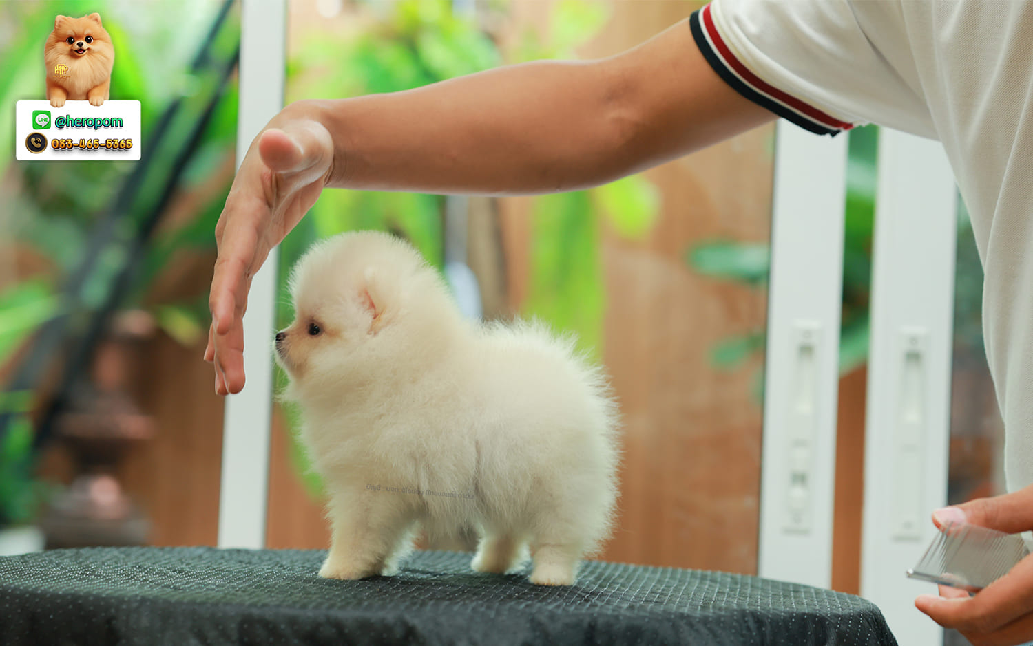 ปอมแท้ ปอมหน้าหมี HRF-89113 เพศหญิง สีขาว อายุ 2 เดือน ขาสั้น ขนแน่น หน้าตาน่ารัก มีใบรับรองจากสมาคมพัฒนาพันธุ์สุนัข (ใบเพ็ดดีกรีเต็มใบ) ส่งทั่วประเทศ