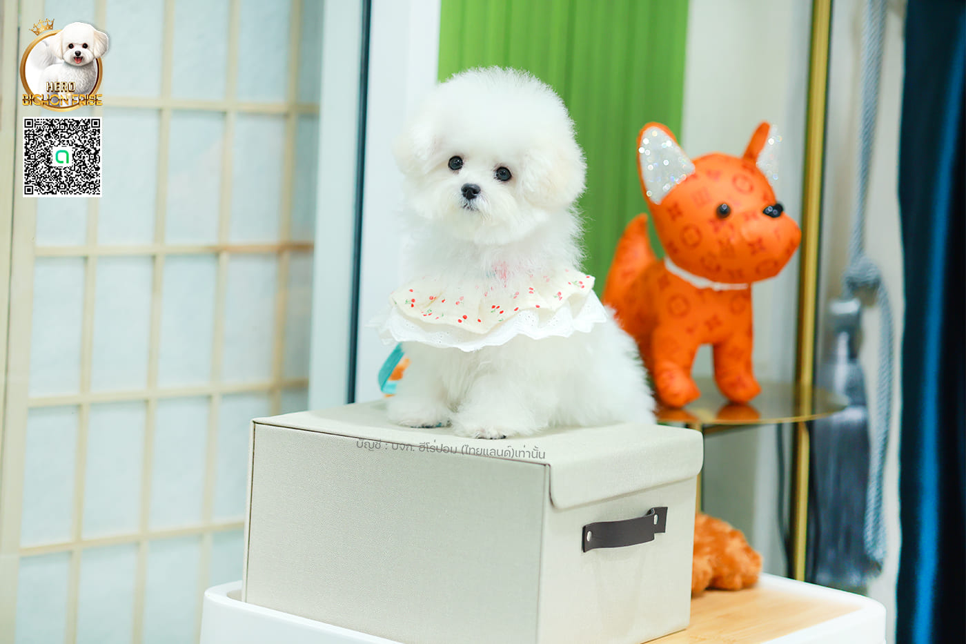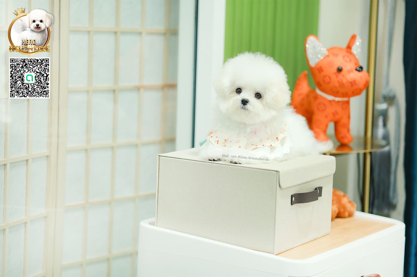 มินิบิชอง BCF-16727 เพศหญิง สีขาว น่ารักมาก ตัวเล็กตัวน้อย ขนนุ่มขนแน่น หน้าแบ๊ว เห็นแล้วใจละลายมาก ถ้าได้อุ้มแล้วจะวางไม่ลงแน่นอน มีใบรับรองจากสมาคมพัฒนาพันธุ์สุนัข (ใบเพ็ดดีกรีเต็มใบ) ส่งทั่วประเทศ