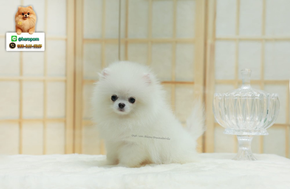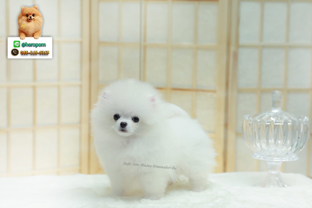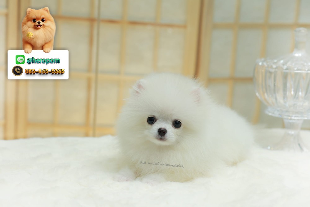 ปอมแท้ ปอมหน้าหมี HRM-68598 เพศชาย สีขาว เจ้าหนูน่ารัก ตัวสั้นขนแน่นมาก หน้าตาน่ารักจิ้มลิ้ม ตากลมแบ๊ว หนูกลม น่ารักมาก ๆ มีใบรับรองจากสมาคมพัฒนาพันธุ์สุนัข (ใบเพ็ดดีกรีเต็มใบ) ส่งทั่วประเทศ