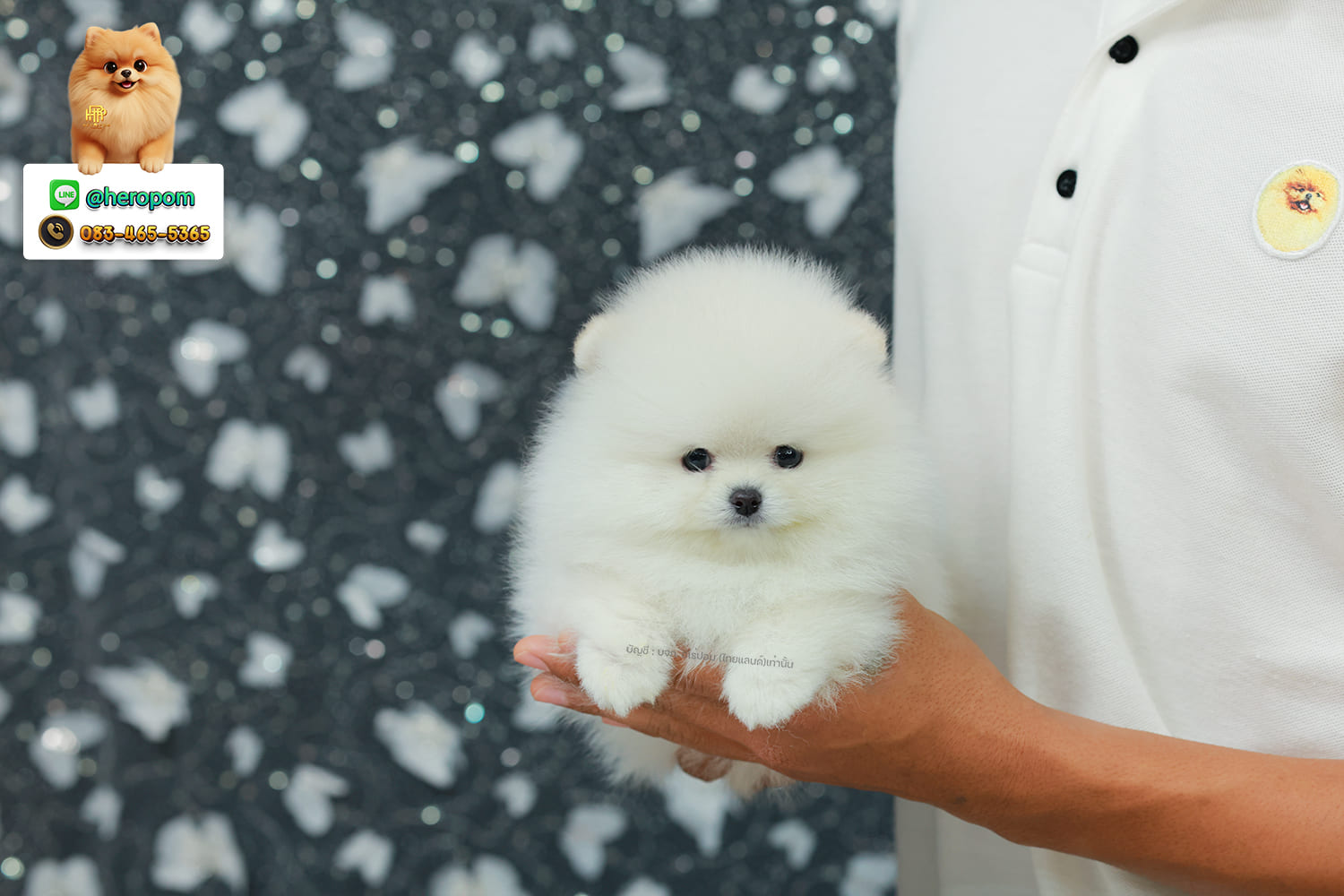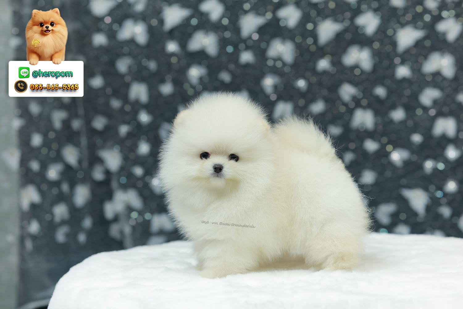 ปอมแท้ ปอมหน้าสั้น HRM-89139 เพศชาย สีขาว หนุ่มฮอต หน้าตาน่ารัก น่าเอ็นดูมาก ๆ แก้มนุ่ม ขาใหญ่ ขนแน่น พาราน่าร๊ากก มีใบรับรองจากสมาคมพัฒนาพันธุ์สุนัข (ใบเพ็ดดีกรีเต็มใบ) ส่งทั่วประเทศ