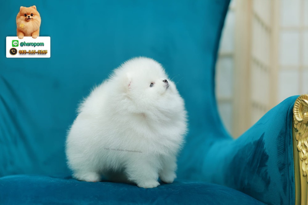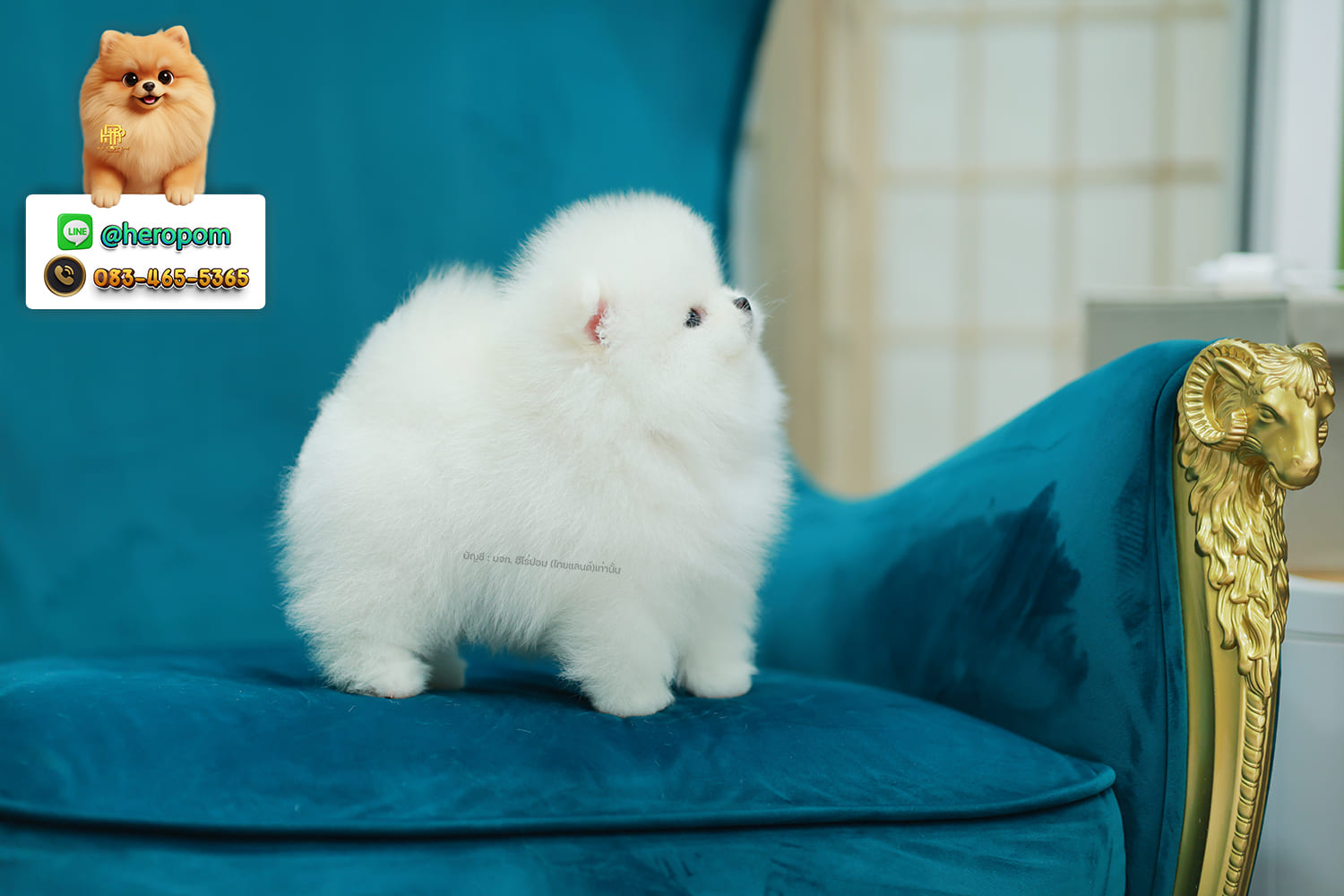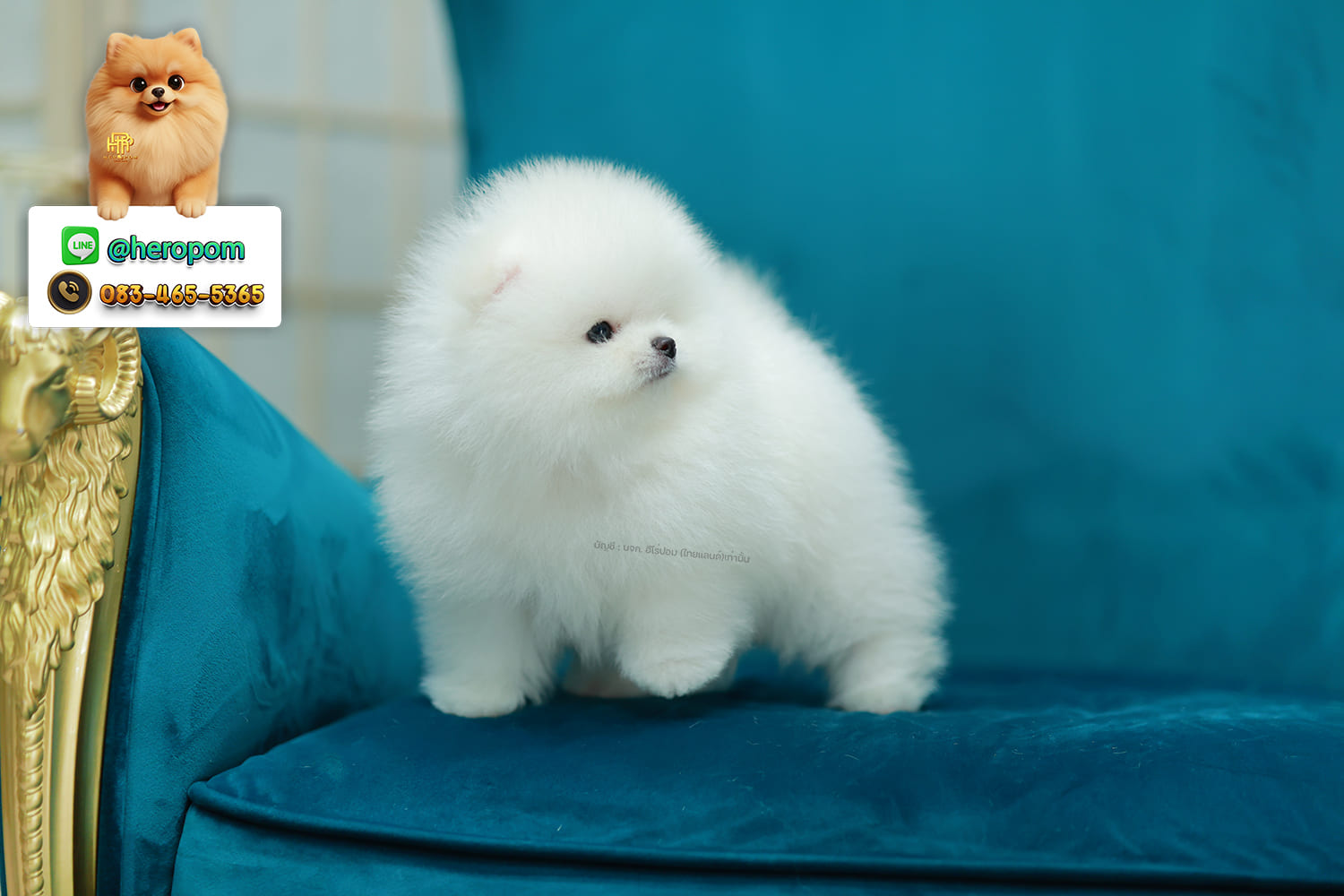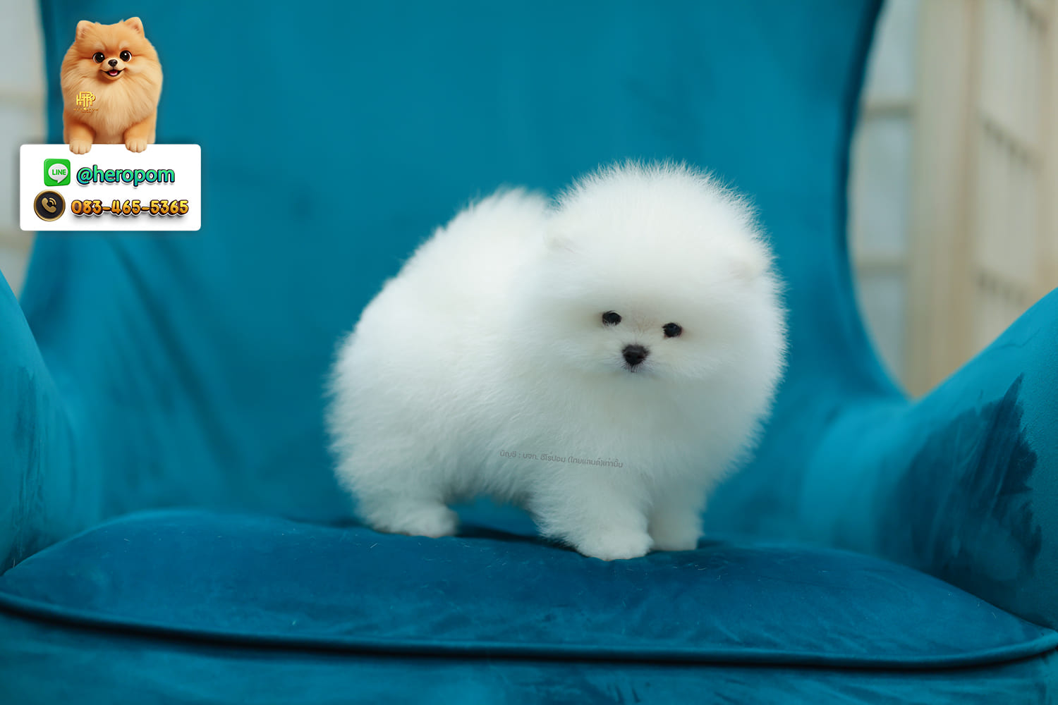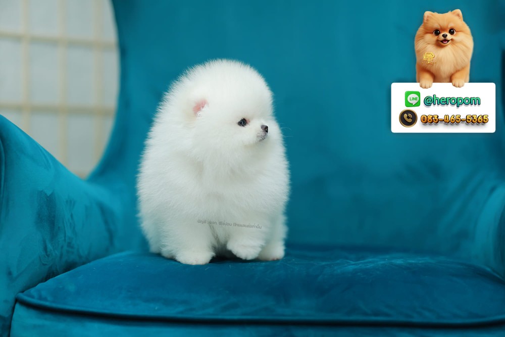 ปอมแท้ ปอมหน้าสั้น HRM-10565 เพศชาย สีขาว หนุ่มฮอต หน้าตาน่ารัก น่าเอ็นดูมาก ๆ แก้มนุ่ม ขาใหญ่ ขนแน่น พาราน่าร๊ากก มีใบรับรองจากสมาคมพัฒนาพันธุ์สุนัข (ใบเพ็ดดีกรีเต็มใบ) ส่งทั่วประเทศ