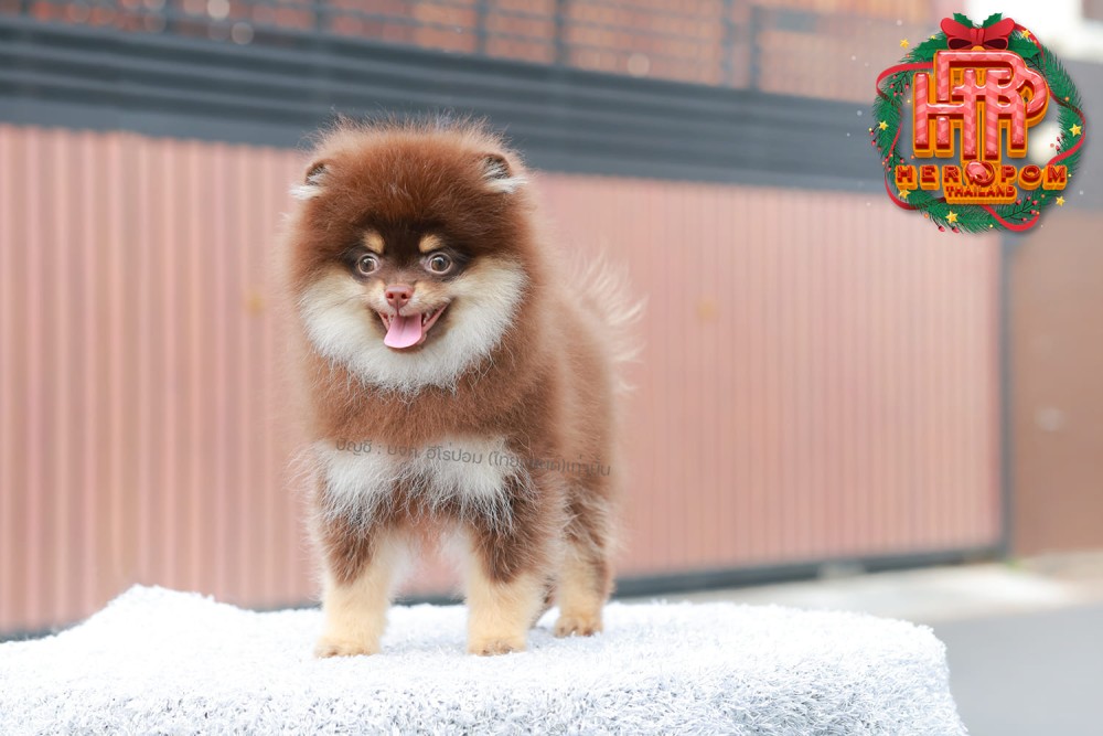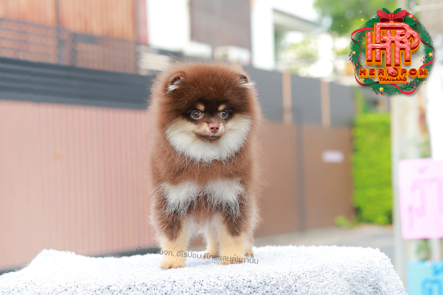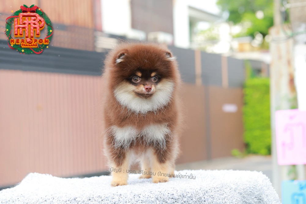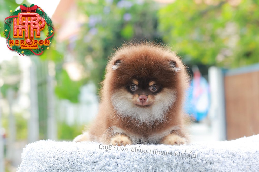 ปอมแท้ ปอมหน้าหมี HRM-10478 เพศชาย สีช็อคแทน อายุ 2 เดือน ขนแน่น ขาใหญ่ กินเก่ง หน้าตาน่ารัก สดใสร่าเริง ขี้อ้อนสุด ๆ มีใบรับรองจากสมาคมพัฒนาพันธุ์สุนัข (ใบเพ็ดดีกรีเต็มใบ) ส่งทั่วประเทศ