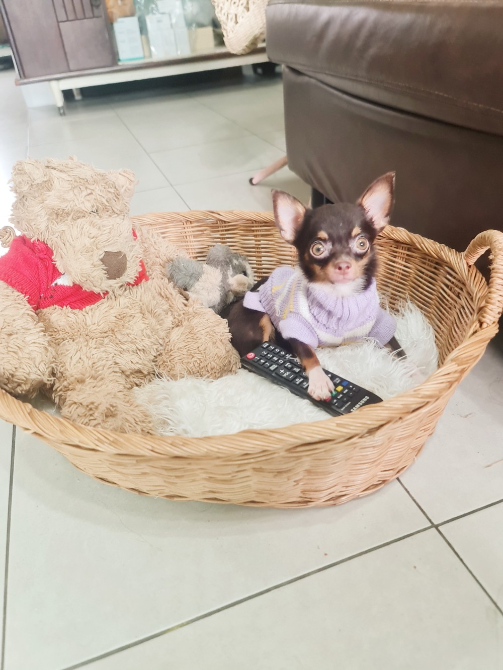 สาวน้อยชิวาวาแท้ขนสั้น สีช็อคโกแลตแอนด์แทน ตัวจิ๋วเล็กๆวัยเจ็ดเดือน ฟอร์มชัด ไม่โตกว่านี้เยอะแล้วคะ ฝึกขับถ่ายเป็นที่แล้ว หัวสวยหน้าหวานตาโต พร้อมย้ายบ้านแล้วคะ แข็งแรงขี้อ้อน ฉีดวัคซีนสองเข็ม ปลอดเห็บหมัด รับประกันสุขภาพและสายพันธุ์ (เข้าชมตัวจริงก่อนตัดสินใจได้คะ)