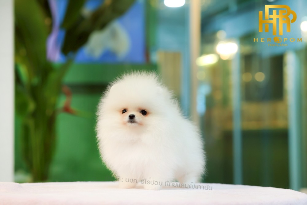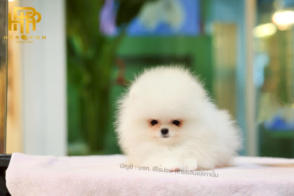 ปอมแท้ ปอมหน้าหมี HRM-10857 เพศชาย สีขาว อายุ 2 เดือน ขนแน่น ขาใหญ่ กินเก่ง หน้าตาน่ารัก สดใสร่าเริง ขี้อ้อนสุด ๆ มีใบรับรองจากสมาคมพัฒนาพันธุ์สุนัข (ใบเพ็ดดีกรีเต็มใบ) ส่งทั่วประเทศ