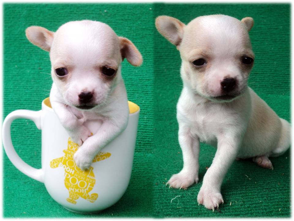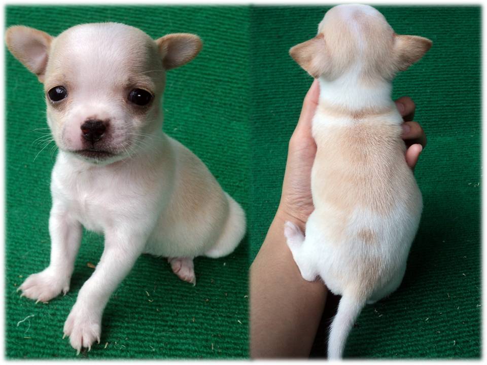 ชิวาวาขนสั้น เพศผู้ สีขาวแต้มครีมเล็กน้อย หัวโตกลมหน้าสั้น
