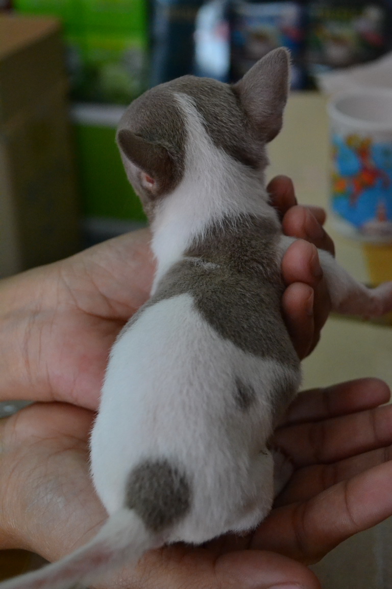ขายชิวาว่า ขนสั้น สีแฟนซีสี เพศผู้ สีเทา-ขาว นานๆจะมี จิ๋วๆ สวยจริง