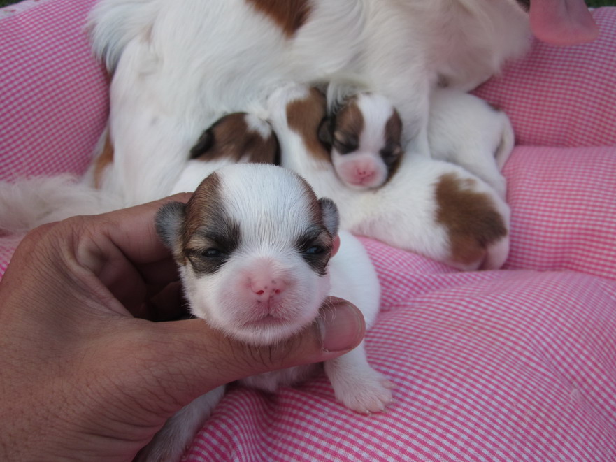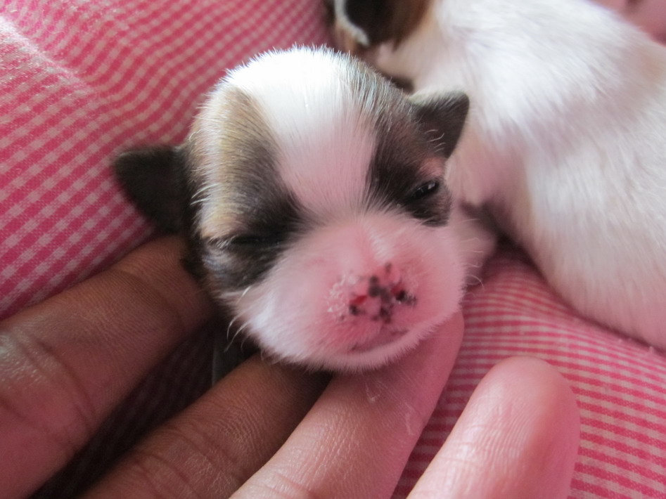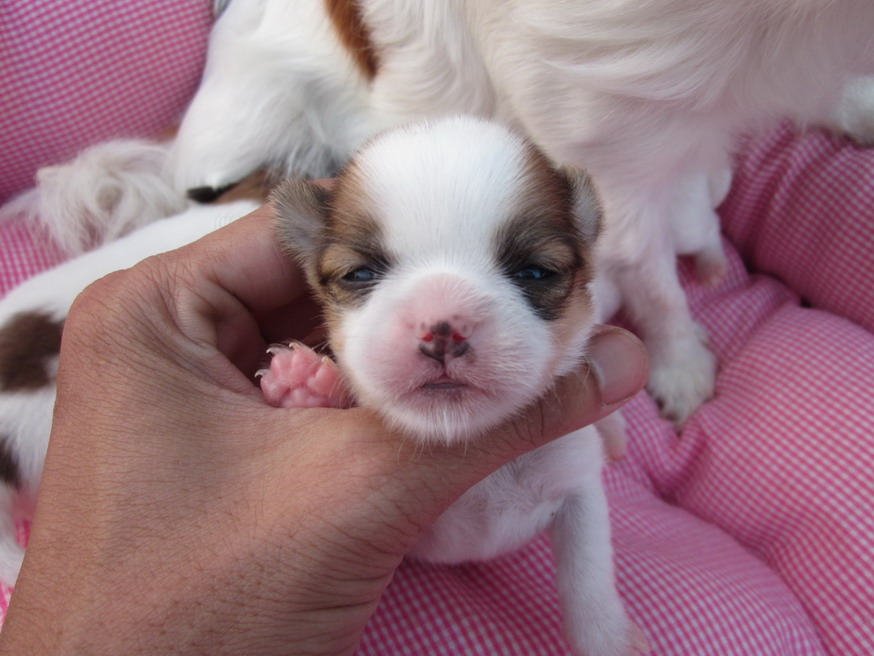 ชิวาวา ขนยาว หัวใหญ่ หน้าสั้น ขนแน่น ชาย 2 หญิง 2 หน้าสั้นทุกตัว แม่พันธ์นำเข้าสีขาว+น้ำตาล มีใบเพ็ดเต็มใบ