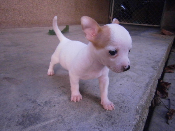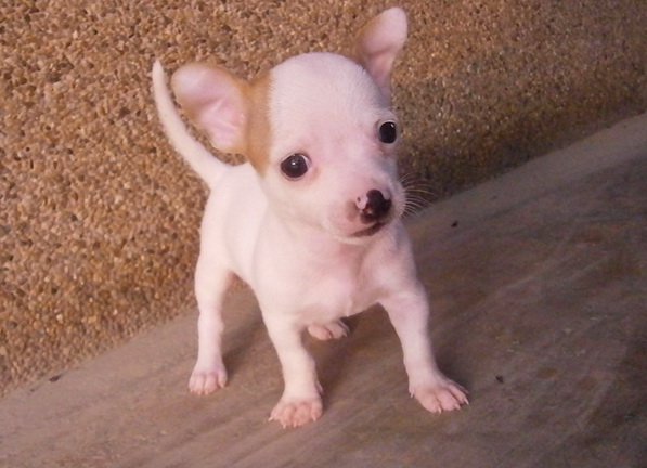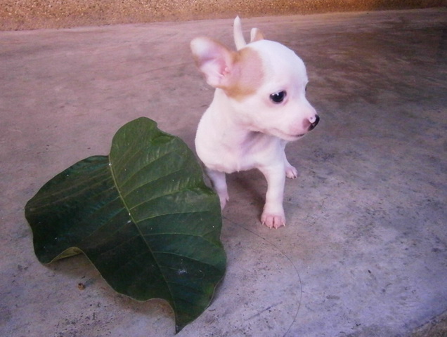 ขายลูกชิวาวา ขนสั้น พันธุ์แท้ สีแฟนซี ลำตัวขาวสะอาด มาร์คแฟนซีที่หูสีน้ำตาลค่ะ