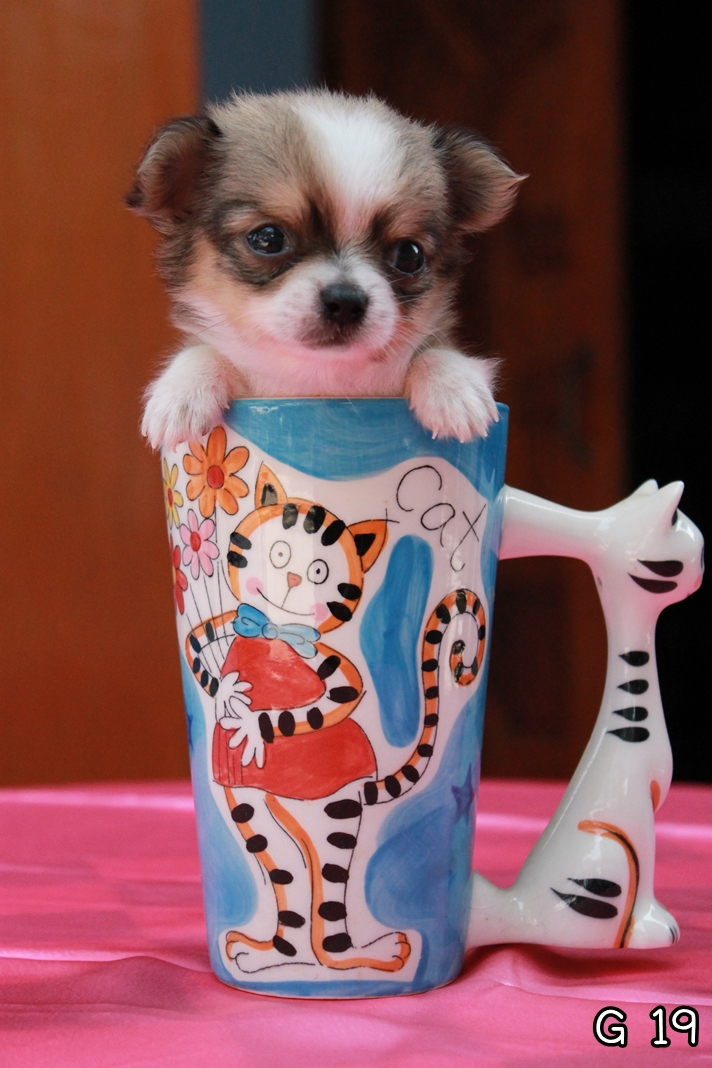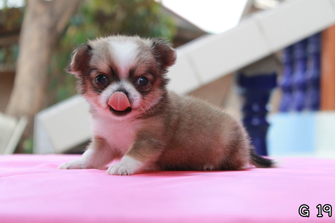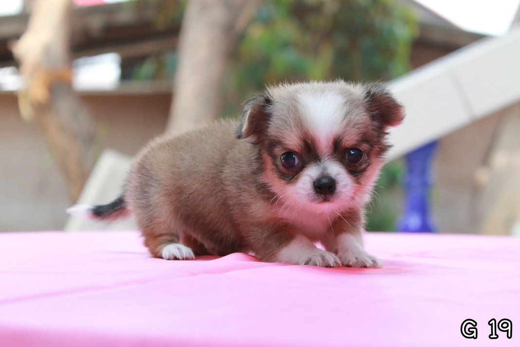 G19 ชิวาวาขนยาว (size T-cup) สีน้ำตาลเทาอ่อนๆ หน้ากากสวยมาก หัวโตหน้าสั้นตากลม ขนแน่นนุ่ม ขาสั้นหุ่นสวยเหมาะสำหรับเป็นพ่อพันธุ์ ราคา 9500 บาท