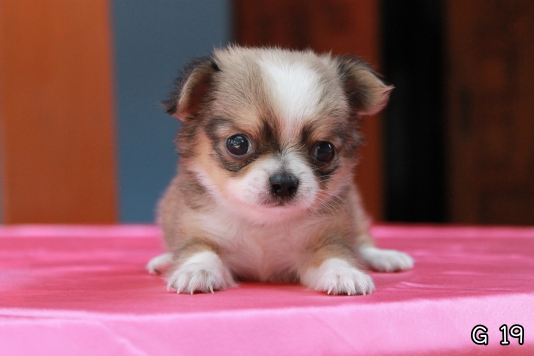 G19 ชิวาวาขนยาว เพศผู้ (size T-cup) สีน้ำตาลเทาอ่อนๆ หน้ากากสวยมาก หัวโตหน้าสั้นตากลม ขนแน่นนุ่ม ขาสั้นหุ่นสวย เปิดขายในราคา 9500 บาท