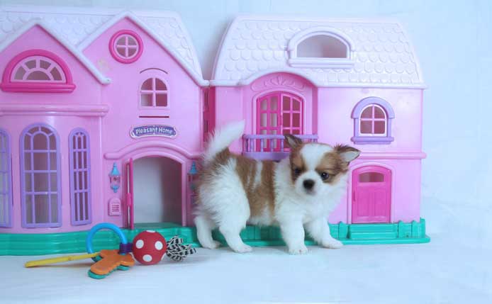 "น้องกระเพาะปลา" ชิวาวาขนยาว สายญี่ปุ่น สต๊อปหน้าสวย สามสี มีคิ้ว หน้าสั้น ขนยาวสุดๆ น่ารักมากเหมาะกับผู้ที่นำไปพัฒนาสายพันธุ์ <<< เพ็ดดีกรีเต็มใบ >>>