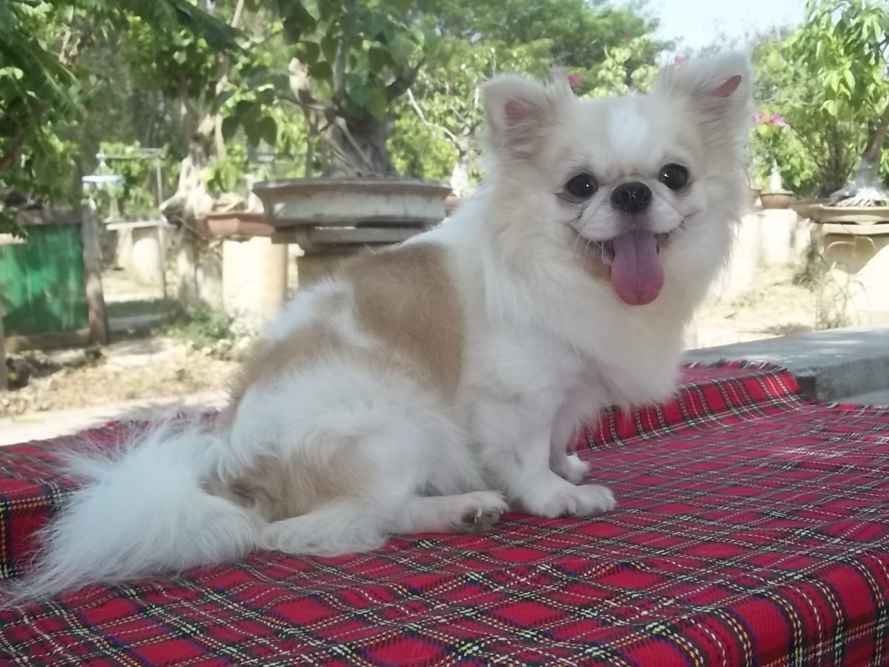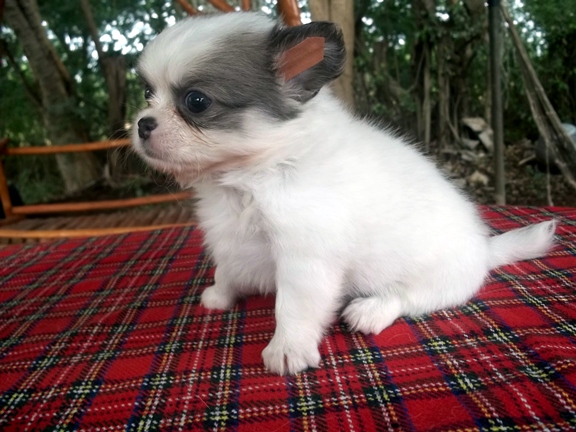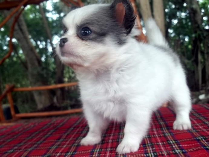 ชิวาว่าขนยาวเพศผู้สายไต้หวัน ตัวเตี้ยหน้าสั้นขนแน่นสีขาวเทา