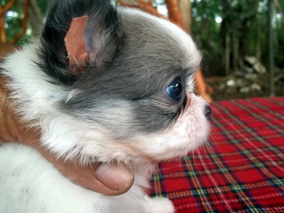 เด็กชายชิวาว่าขนยาวสีขาวเทา หน้าสั้นๆ