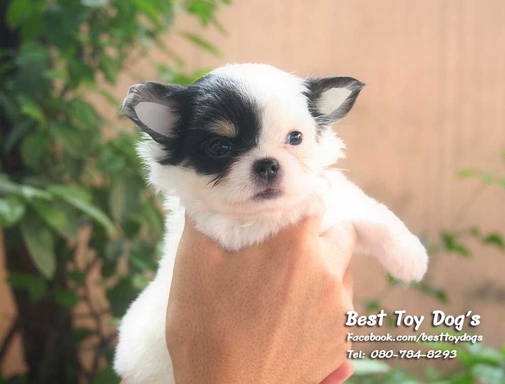 ชิวาวาสายญี่ปุ่น ขนยาวเพศเมีย สามสี (ขาวสำลีมีมาร์คกิ้งโมเช่) หัวโต