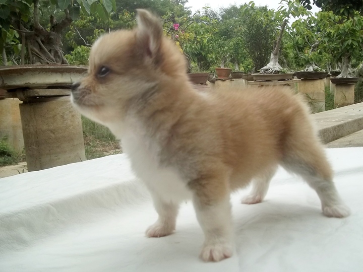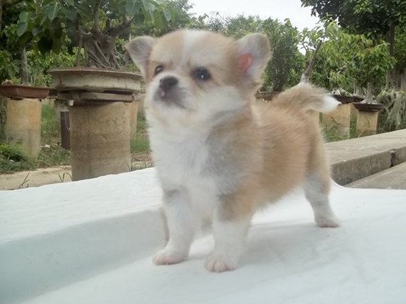 น้องฟีฟ่า ชิวาว่าขนยาวสีน้ำตาล/ขาว/เทาที่ซอกขา